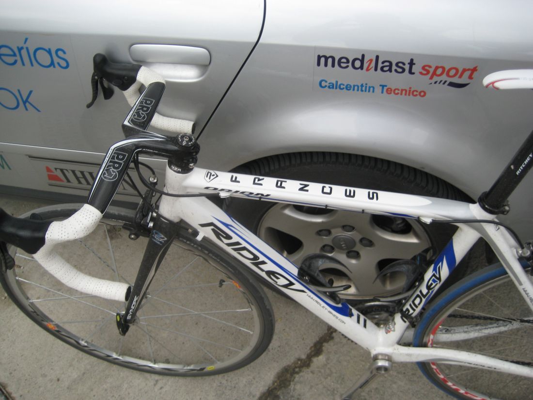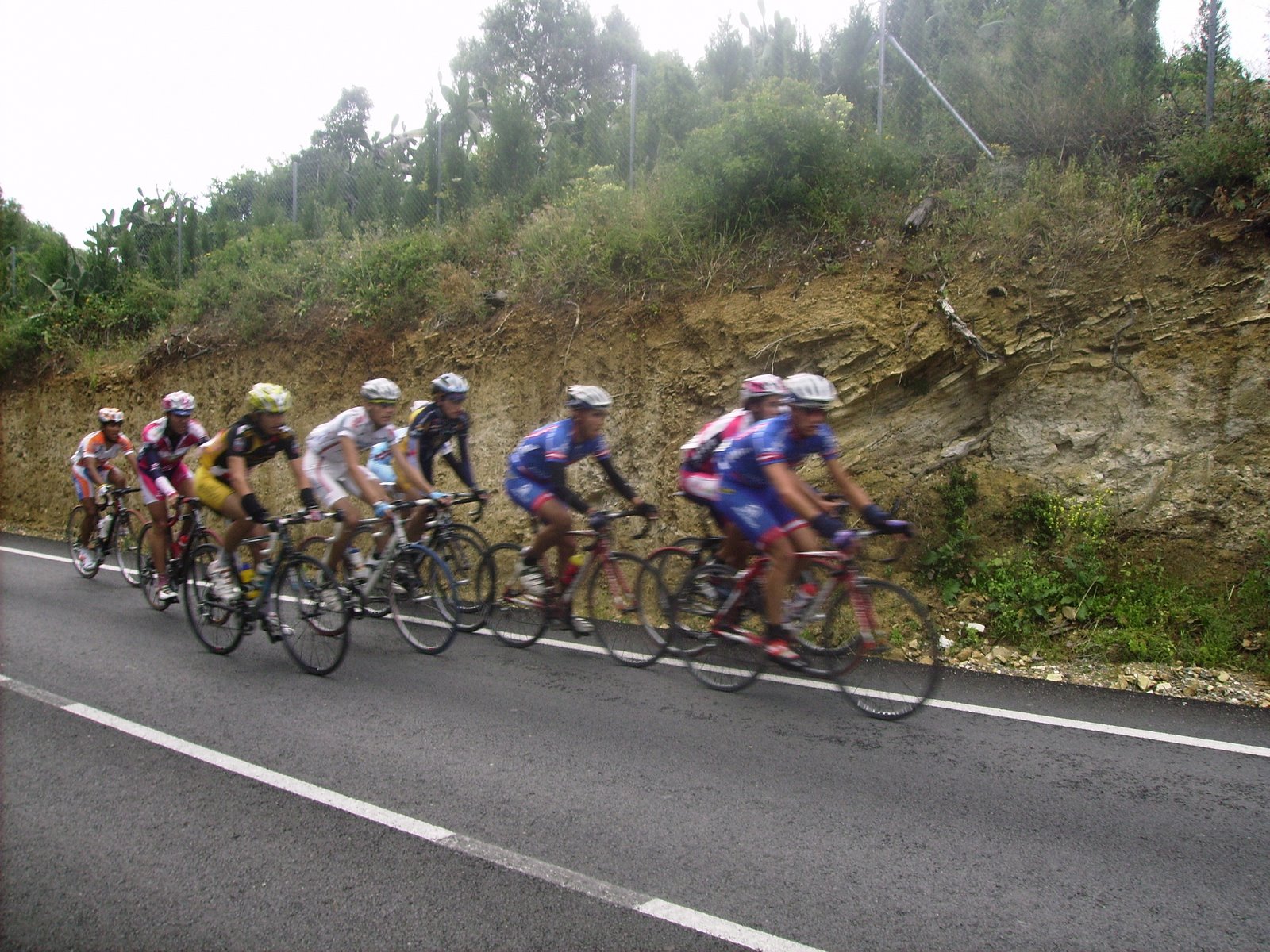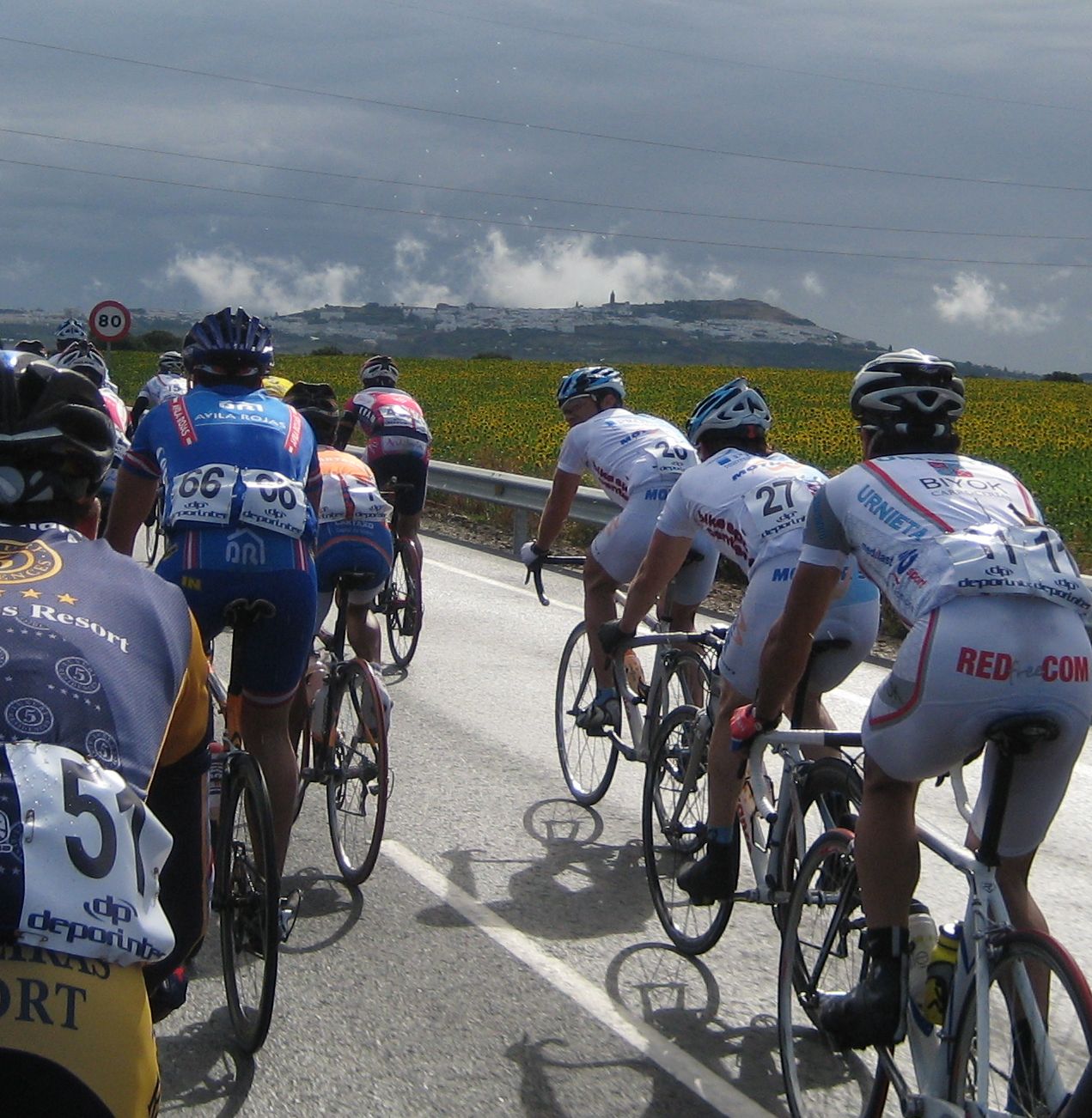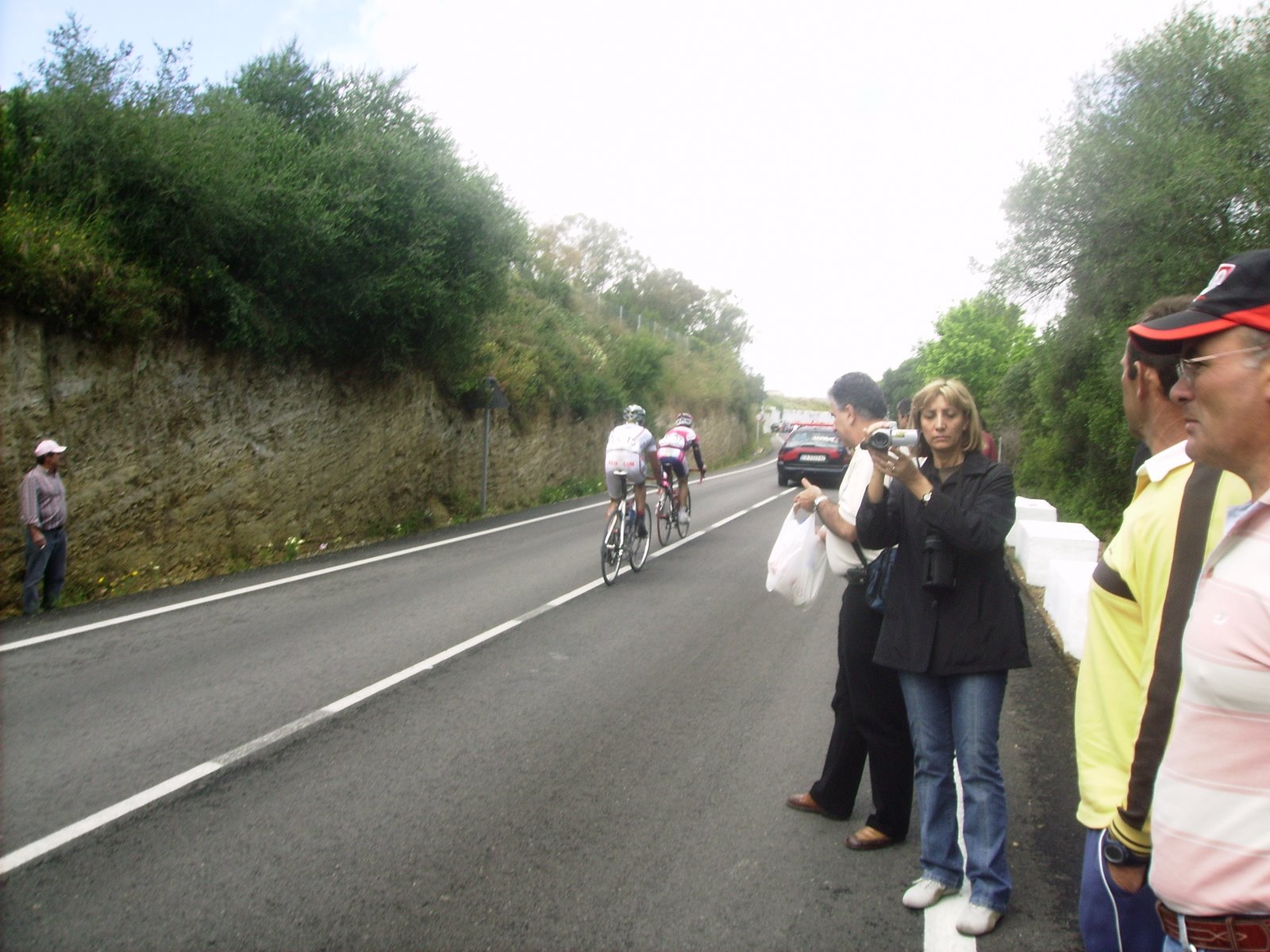 En un repecho de cierta envergadura el Abeja arranco fortisimo y formó un corte, yo acojonado salí tarde y tuve que pegarme una serie para entrar, que buff,, ya entró todo el pelotón pero menudo calentón mas malo, nos seguiamos acercando al puerto de Medina Sidonia y yo tenía muy malas sensaciones. Bordeamos Medina y subimos por detrás, como se iba en los repechos anteriores al puerto, rápidisimo, los portugueses andaban bastante, empezamos el puerto, el muro.. alli salvese quien pueda, se rompió todo, yo sufriendo bastante, coroné con un grupillo, pasé al Francés, que iba pinchado, pinchó en el peor momento.