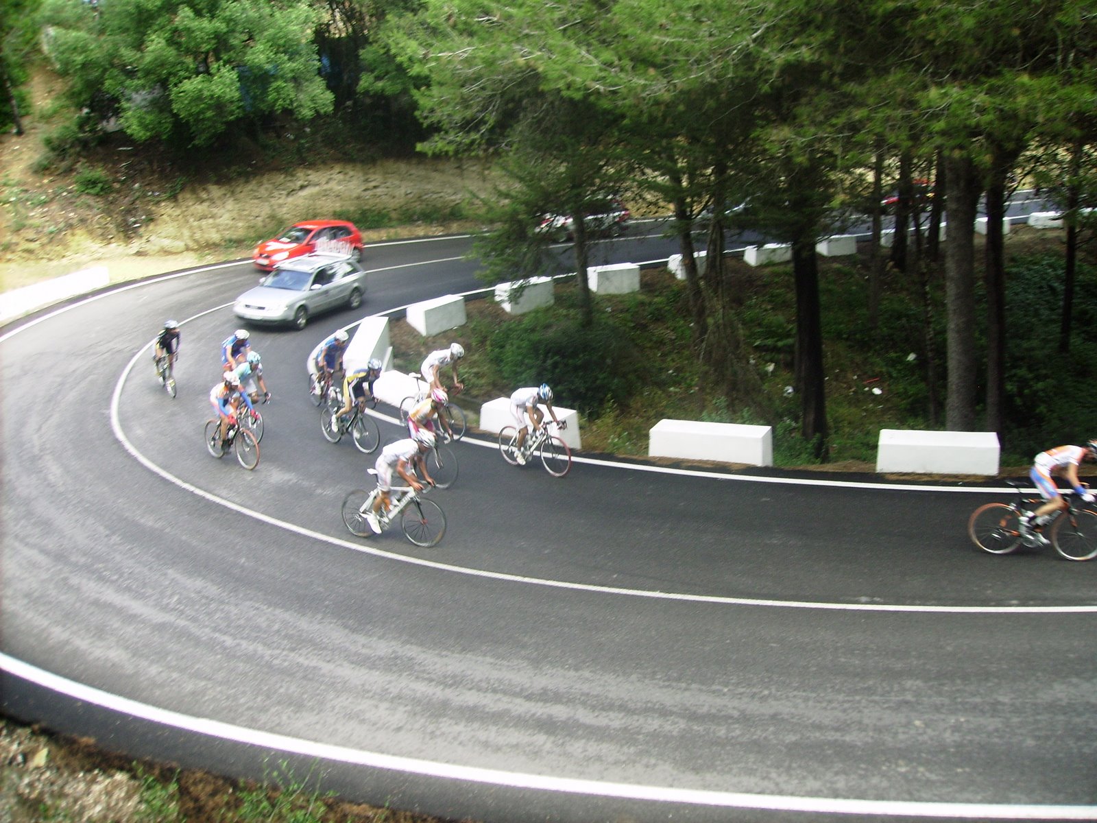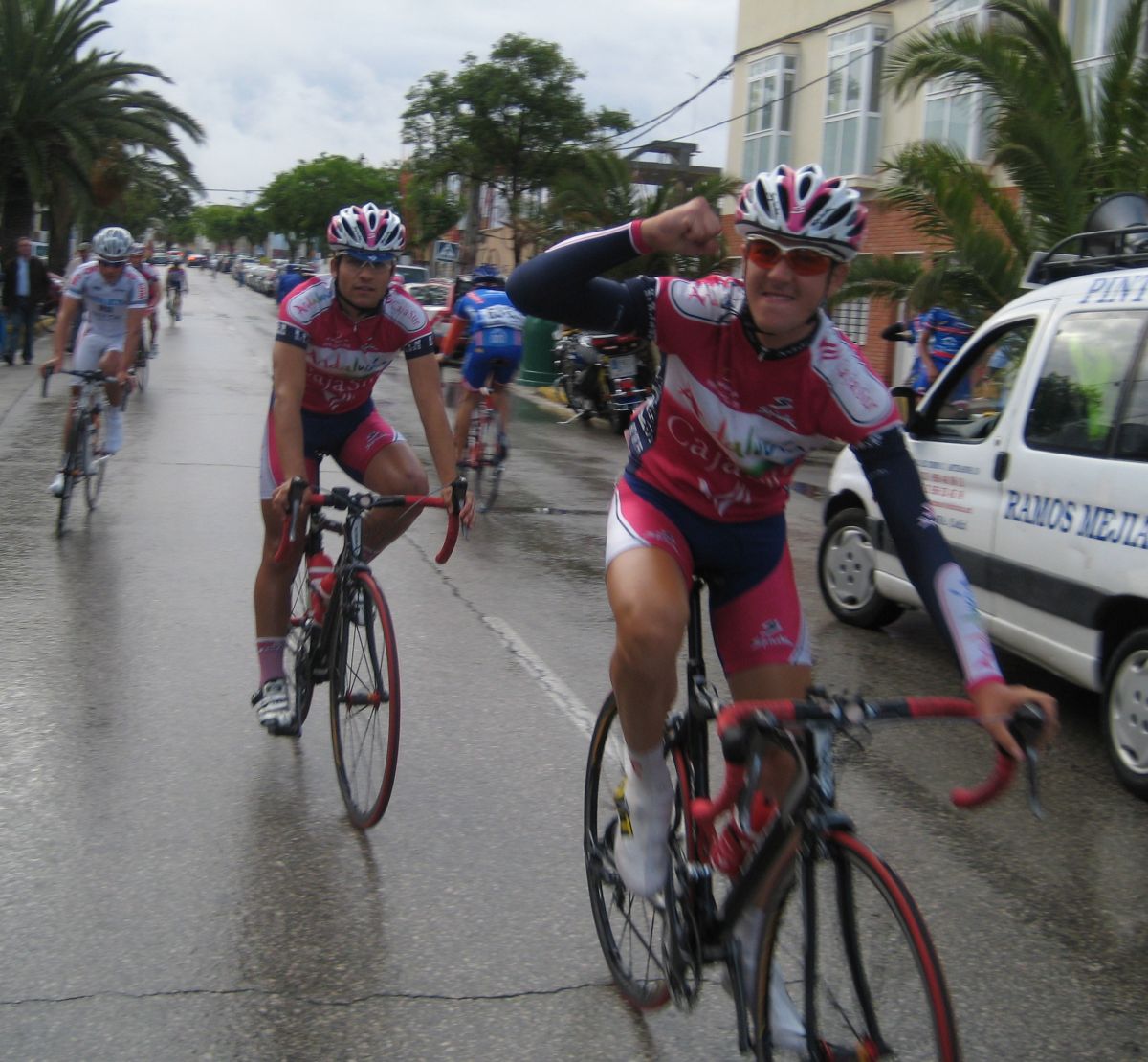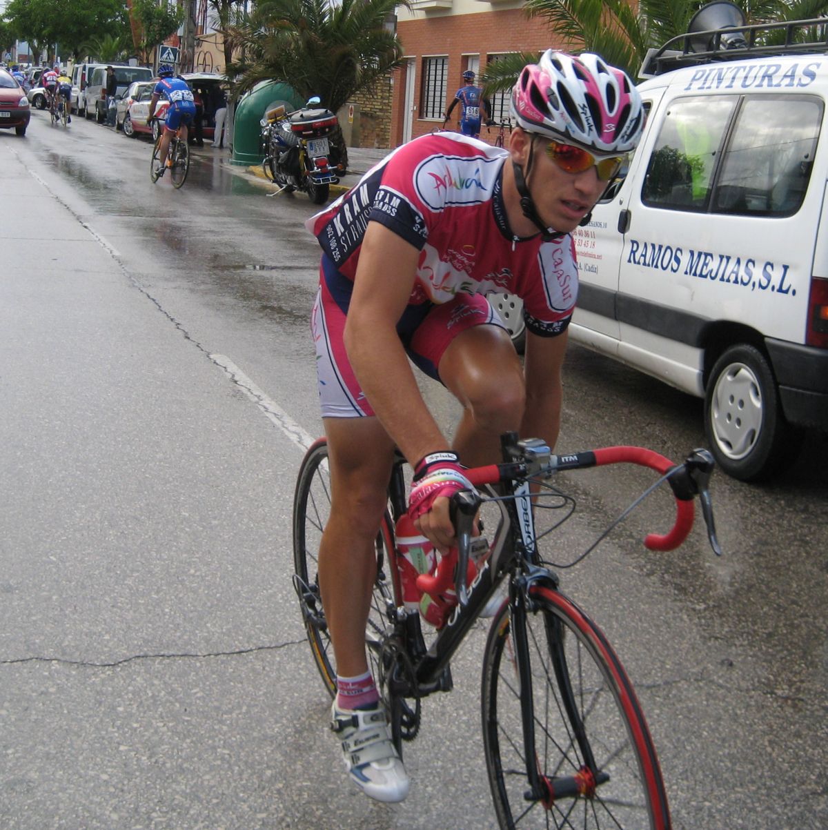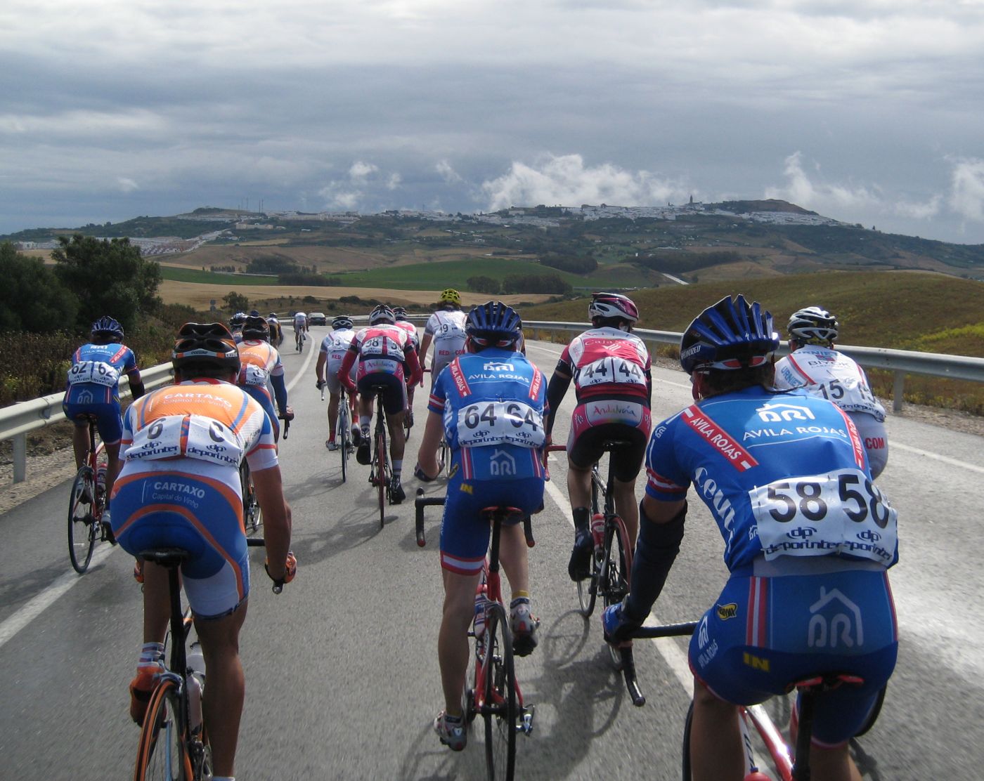 El descenso peligroso en mojado, me pasaron 3 Avila Rojas a mil por hora, menos mal que no les cogí rueda por que en la siguiente curva vi como caia el Motriles en un paso de cebra, tuve que esquivar al pobre Motriles tirao en el suelo, una vez acabado el descenso ya iba bien, veia el panorama, 15 tios por delante, eso me ponía a remar y cogería bien, pero llegaron 3 Andalucía Cajasur por detrás y me lo pusieron mas fácil, me puse a pasar con ellos hasta que mi director me dijo que me quedase a rueda que me metían.. yo me quede a rueda.. pero si hacía falta pasar pasaba.. persiguieron un buen rato yo atrás tranquilo, ya cuando se acercaron pasé y enganchamos.