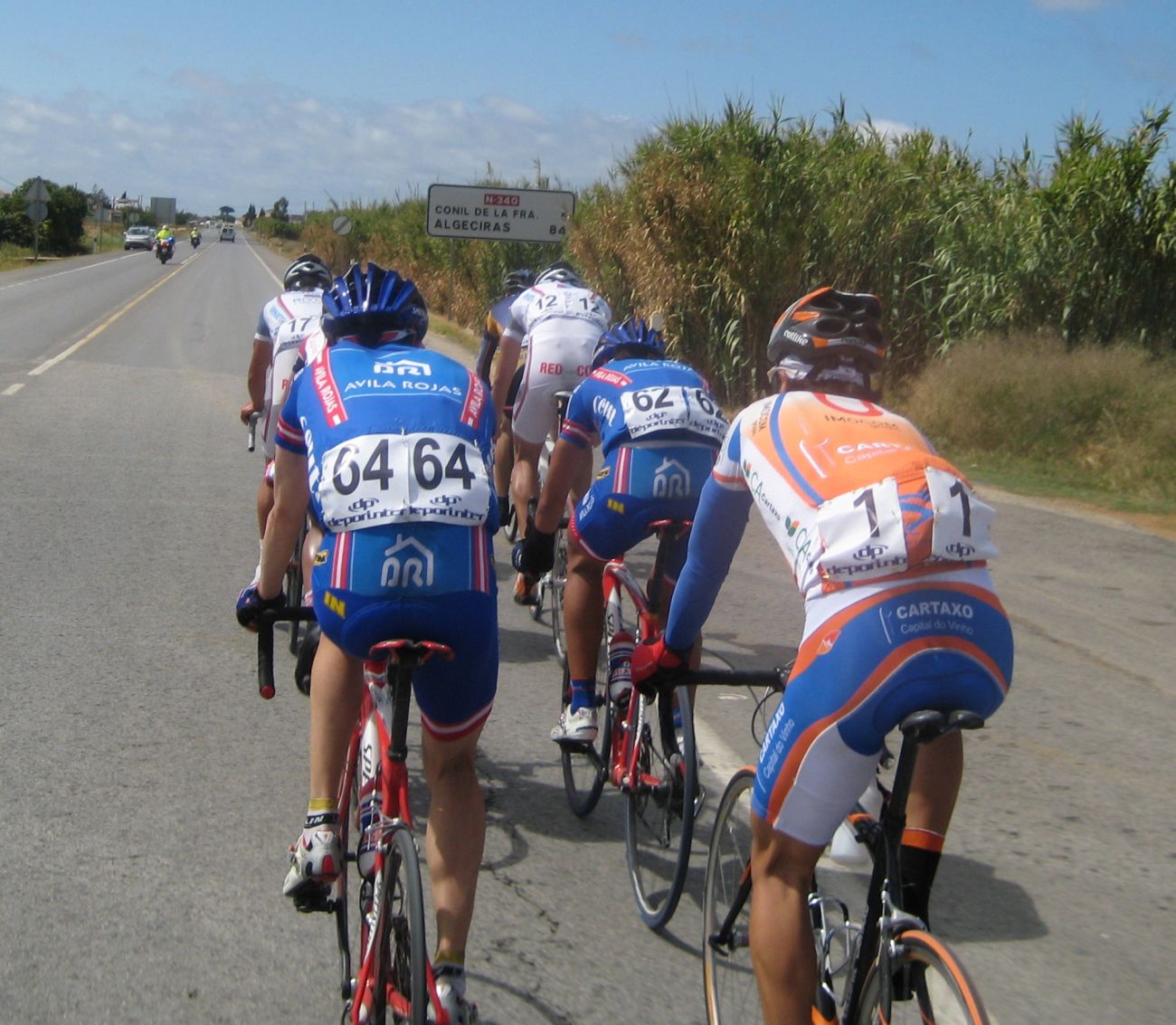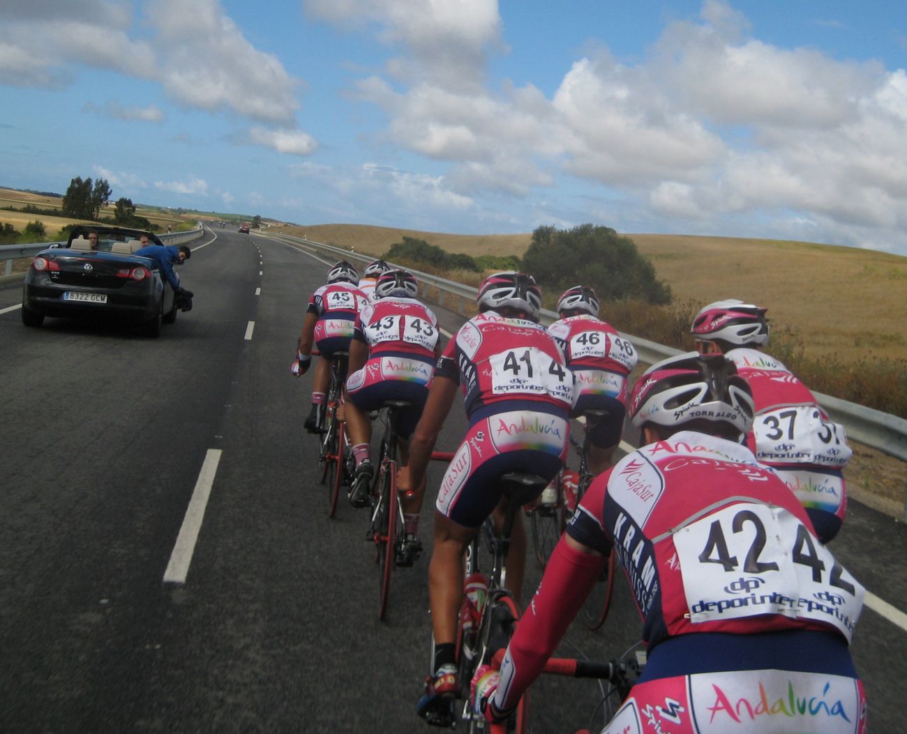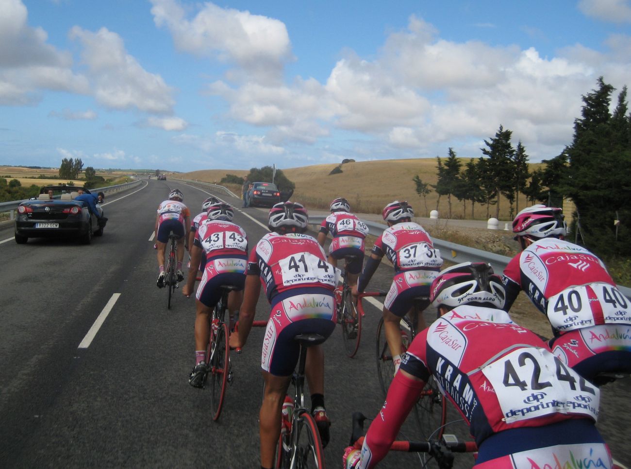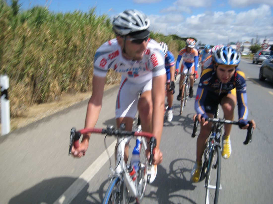 Los portugueses se pusieron a tirar fuerte cerrando cuneta, hacían daño, iban rápido, pero eran pocos, iba un equipo tirando con 3 tios, les reventó uno, quedó otro.. si llegan a tener mas gente pillan alante. Nosotros no ibamos a pasar que llevabamos al Dani. Cuando pararon se pusieron a tirar un poco los Andalucía, que solo quedaban 3, el flamante lider de la Copa Andalucía con su maillot, el Algarrobo, que lo defendía con uñas y dientes, Roldán y Paco Cordón.
