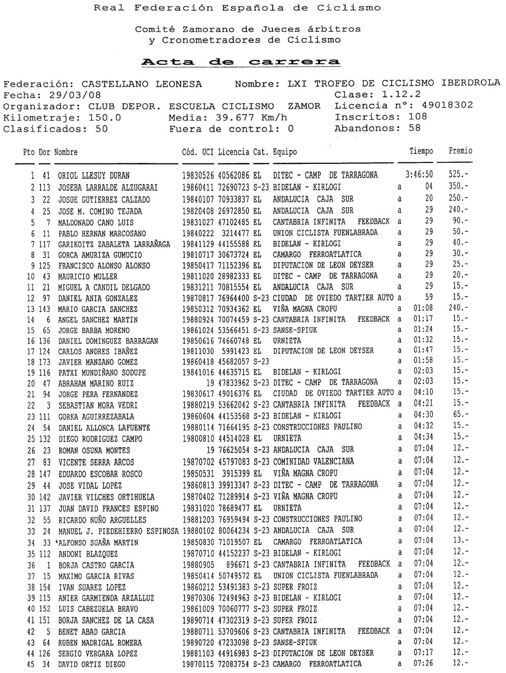 Luego ya en la subida de meta apreté un poco a ver si pasaba al Paulino que iba con el galletas pero cuando me vió se puso a esprintar para ganarme, asi que ahí entramos el ventipicos, no me encontré nada bien en la carrera, acatarrao, garganta jodida, dolor de pecho, y llegué a meta reventao de tanto remar al final apajarao y mareao pero bueno a mi esas cosas me vienen bien. Por delante perdí la cobertura en Villalcampo, se lió la trisca y yo andaba esquivando setos mientras, ganó Oriol del Ditec, segundo Larralde de Bidelan y tercero Josué del Andalucía. Dani entraría ahí de los 15 primeros y los Cajasur ganaron por equipos, con Comino ganando la Montaña.
