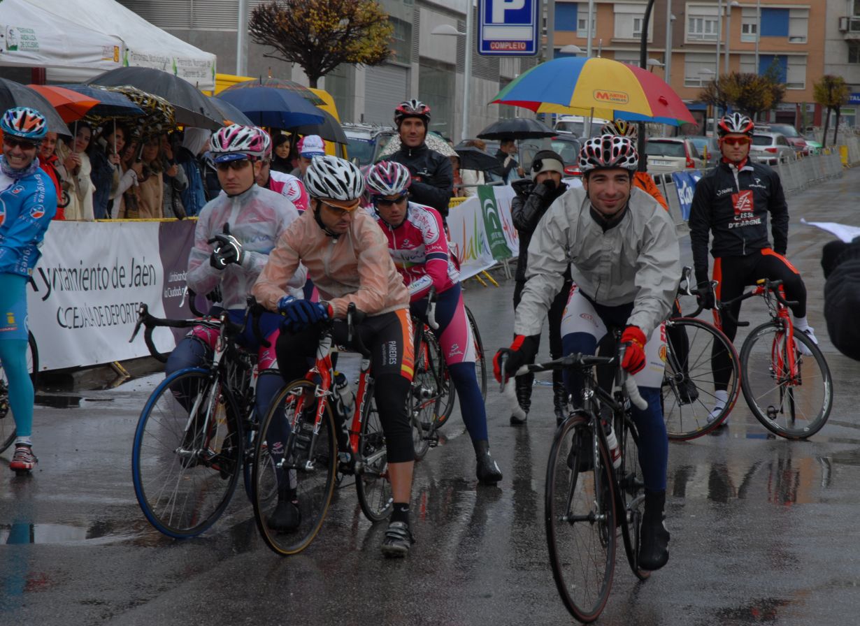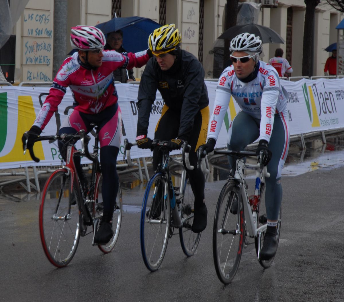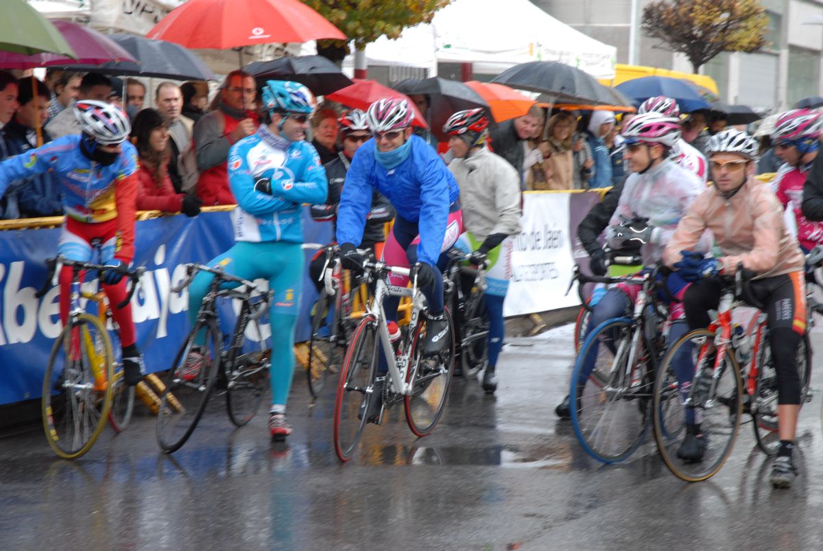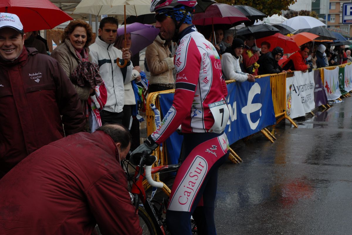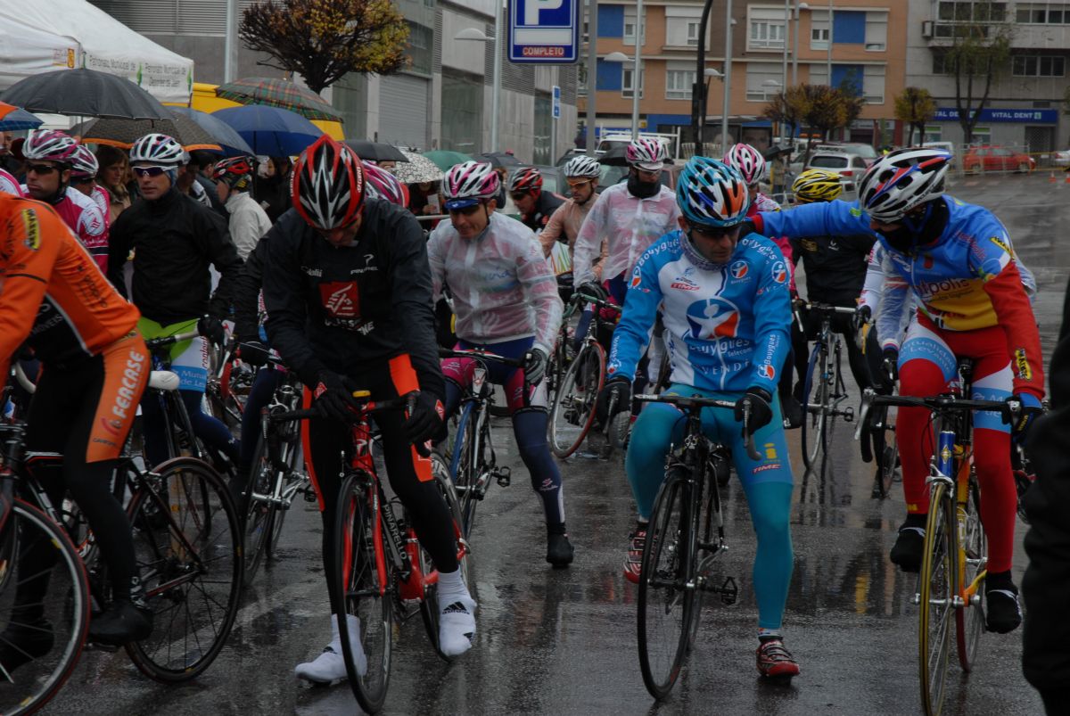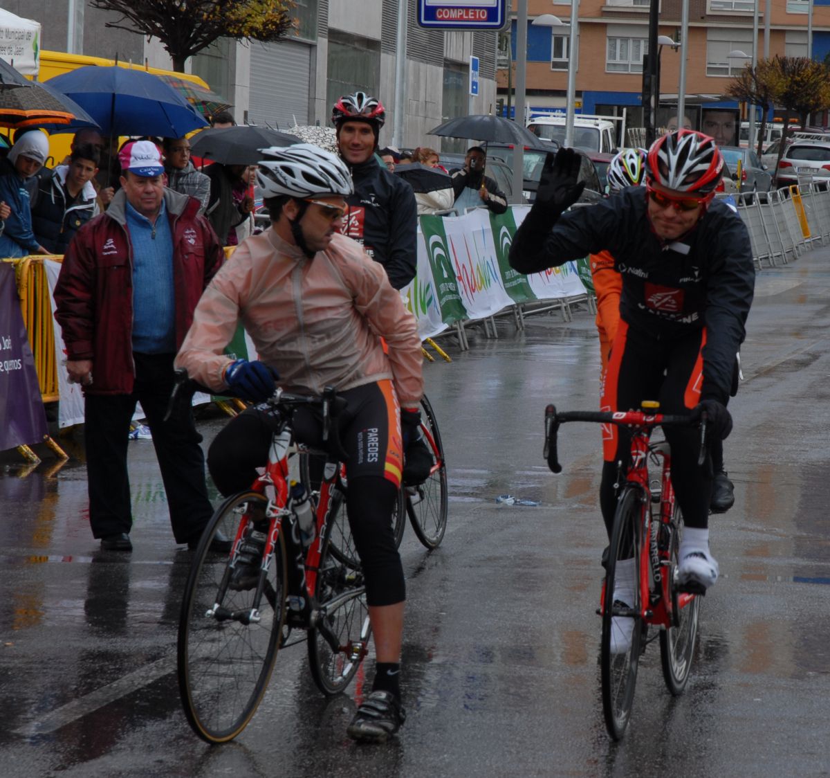 ![]() Ciclistas preparandose para la salida con los chubasqueros, el hombre del Froiz, Marcos García, Luis León, Benitez, Javi Moreno.. |