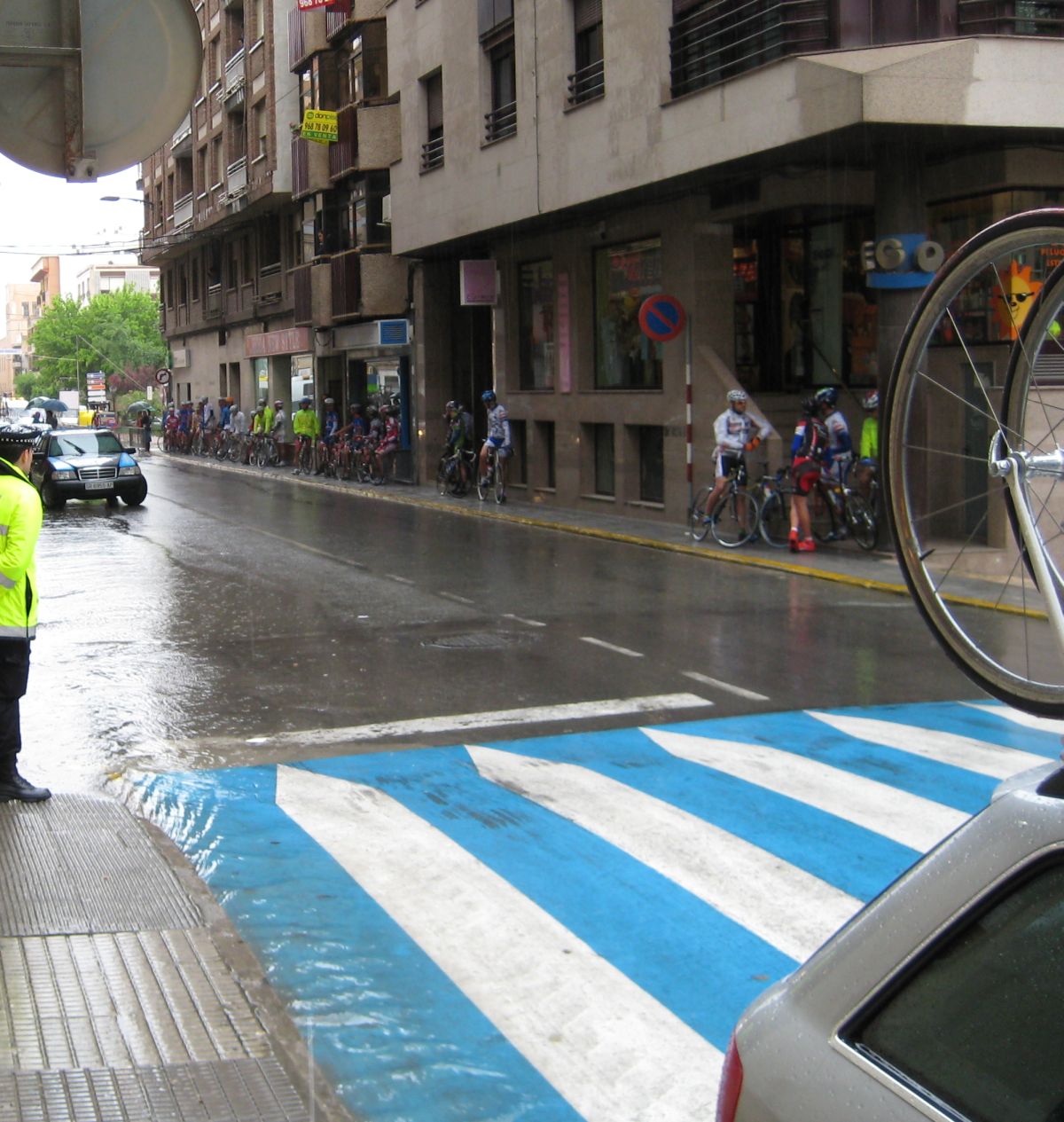 Al final cesó un poquito la cosa y ya los jueces nos mandaron para la salida para hacer el corte de cintas, y salida lanzada, a bloquee, a reventar a los que estuviesen dormidos, se hizo un cortecillo de salida, yo arranqué hasta que me metí con ellos y ya poco a poco fue enganchando todo el pelotón, bueno, todos no, hubo ya muchas bajas en la salida loca con la lluvia, y antes de la salida, que el Trujillo prefirió no salir viendo el percal.