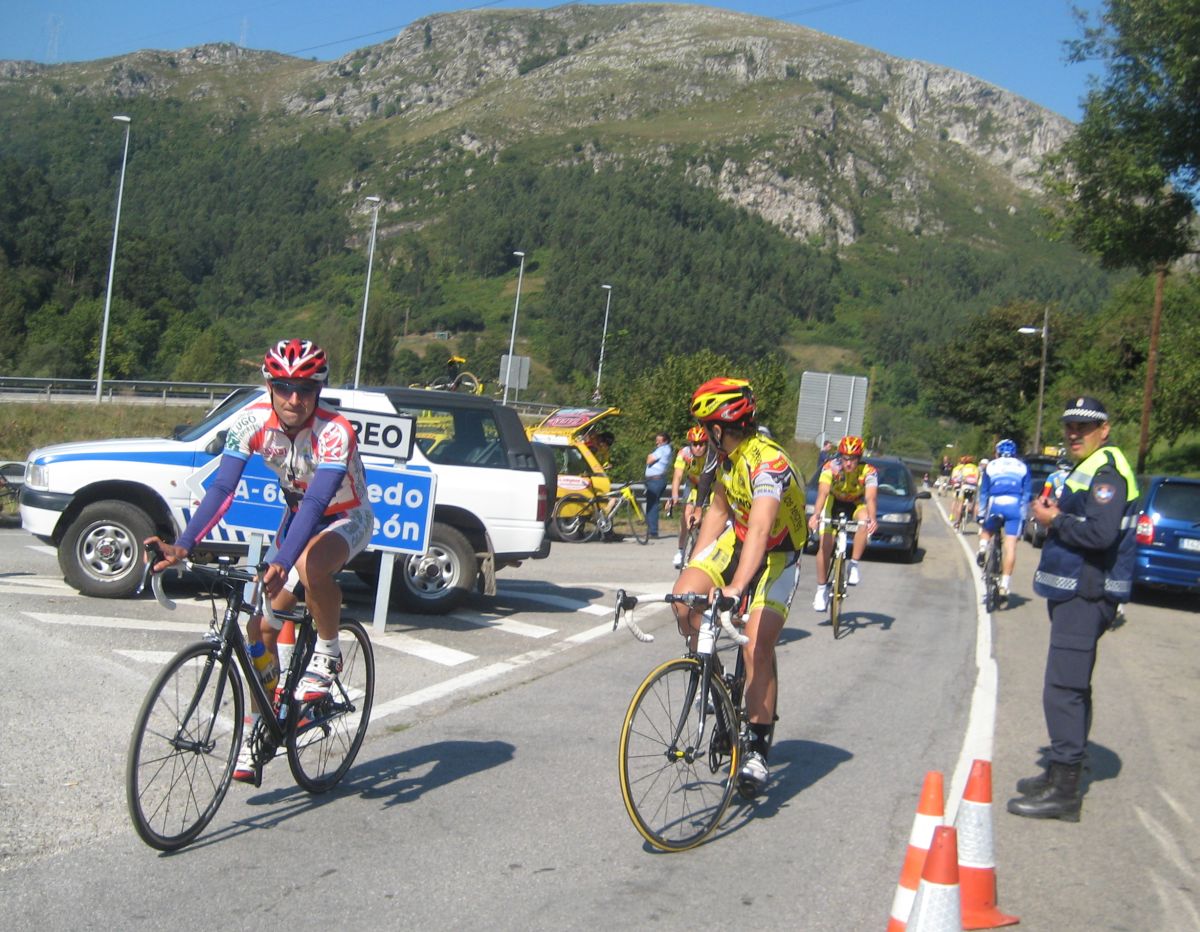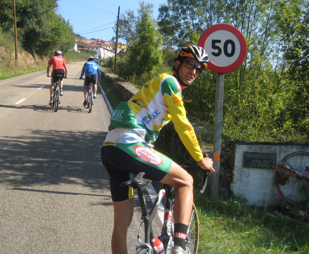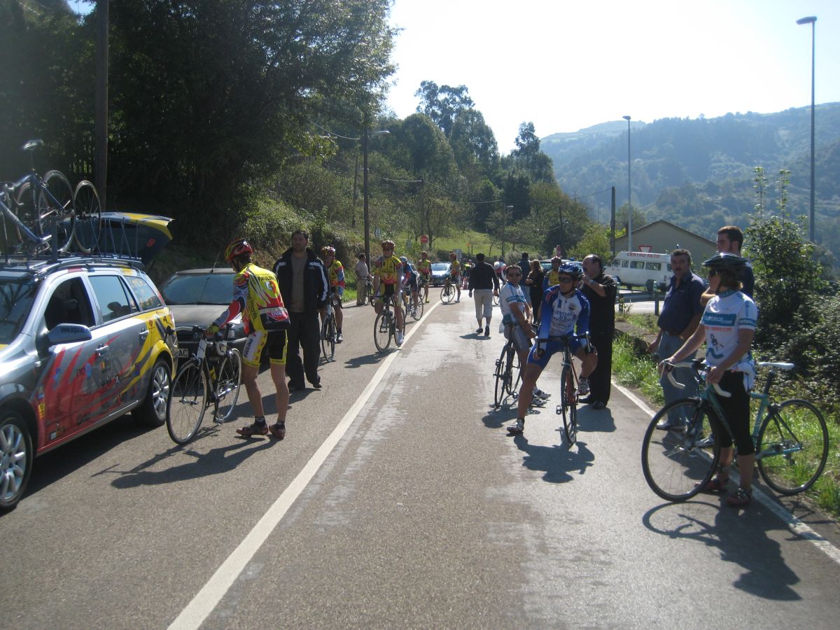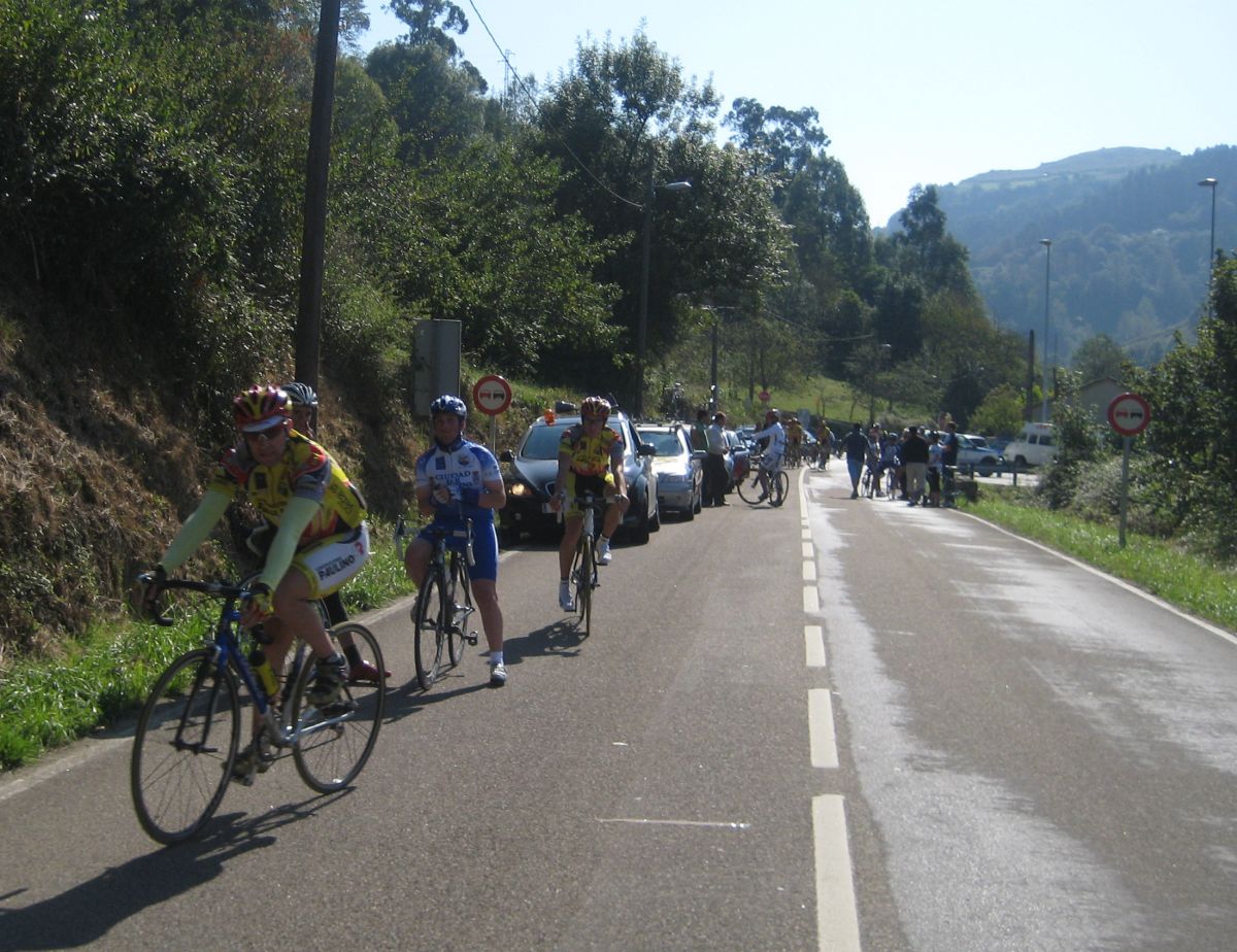 Llegamos a la primera subida, nadie quería atacar, todos con miedo en el muro del 14%, en el paso por la rueda de recuerdo a Alessio Galleti, fallecido allí en la subida al Naranco del 2005. Parecía la subida a Montjuic de profesionales, todos subiendo despacio las primeras subidas, no queriendo gastar las balas al principio. Yo iba observando el percal, mirando atrás a ver como iba la gente subiendo a ese ritmo cómodo, algunos se iban quedando, al fondo alguno buscando agarrarse a los coches y todo.