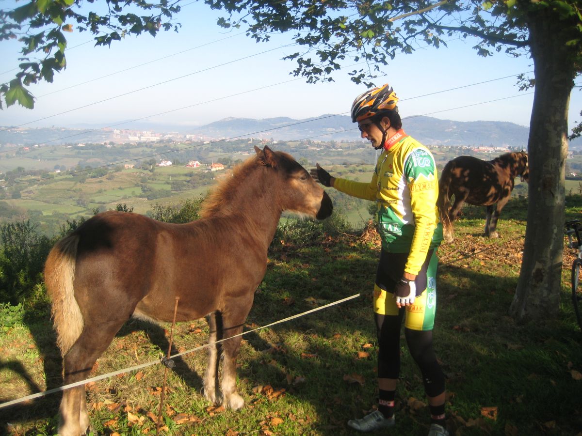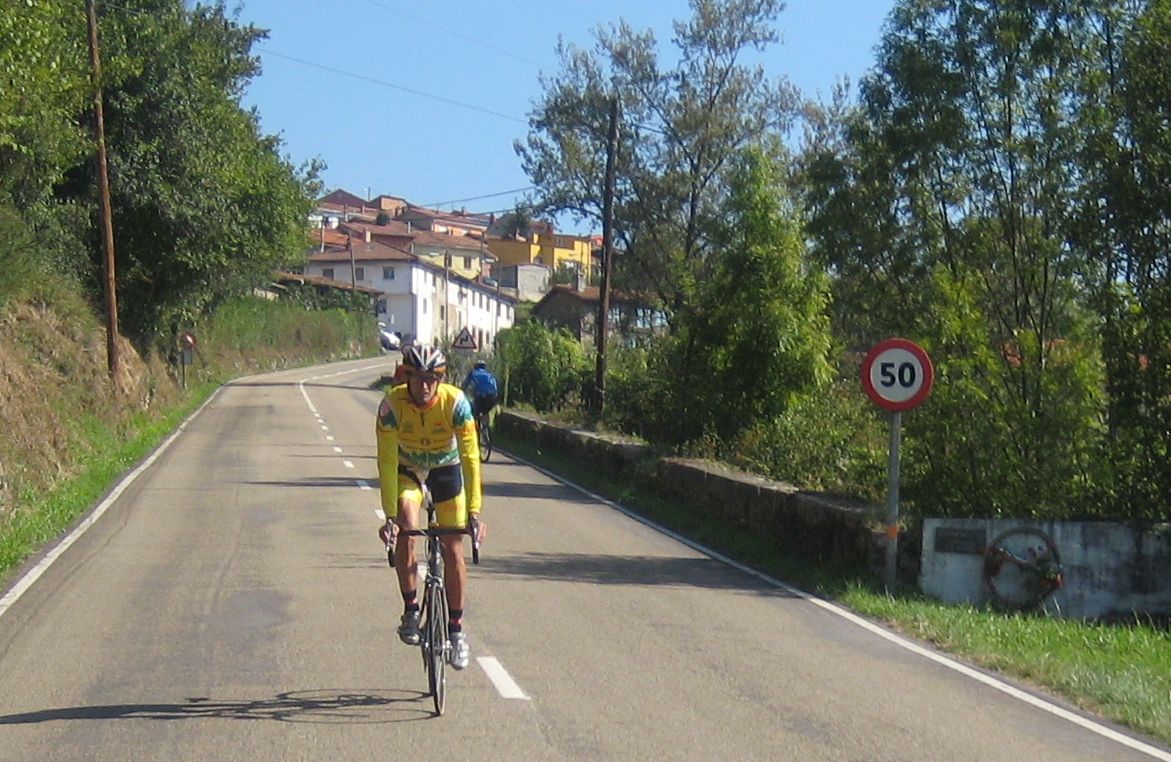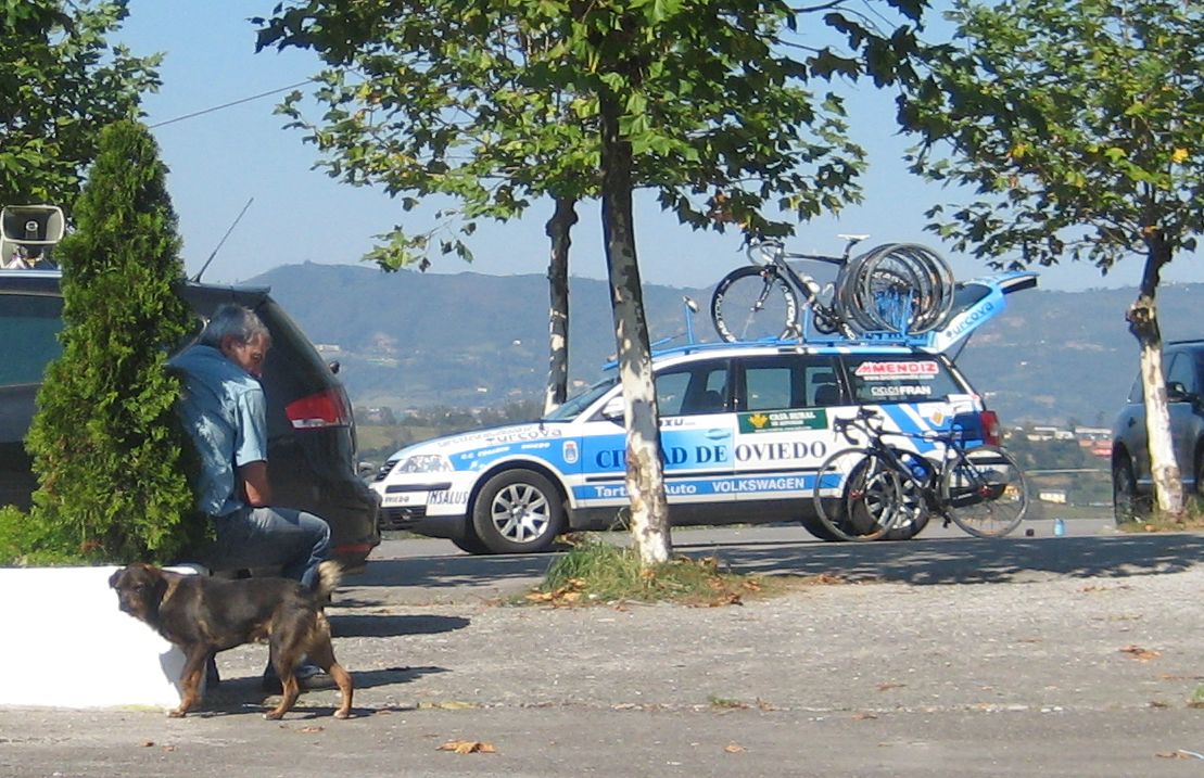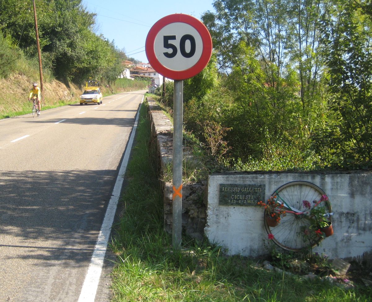 Llegamos a la primera subida, nadie quería atacar, todos con miedo en el muro del 14%, en el paso por la rueda de recuerdo a Alessio Galleti, fallecido allí en la subida al Naranco del 2005. Parecía la subida a Montjuic de profesionales, todos subiendo despacio las primeras subidas, no queriendo gastar las balas al principio. Yo iba observando el percal, mirando atrás a ver como iba la gente subiendo a ese ritmo cómodo, algunos se iban quedando, al fondo alguno buscando agarrarse a los coches y todo.