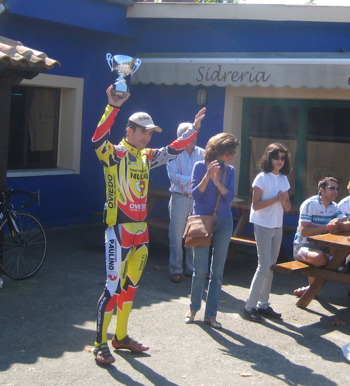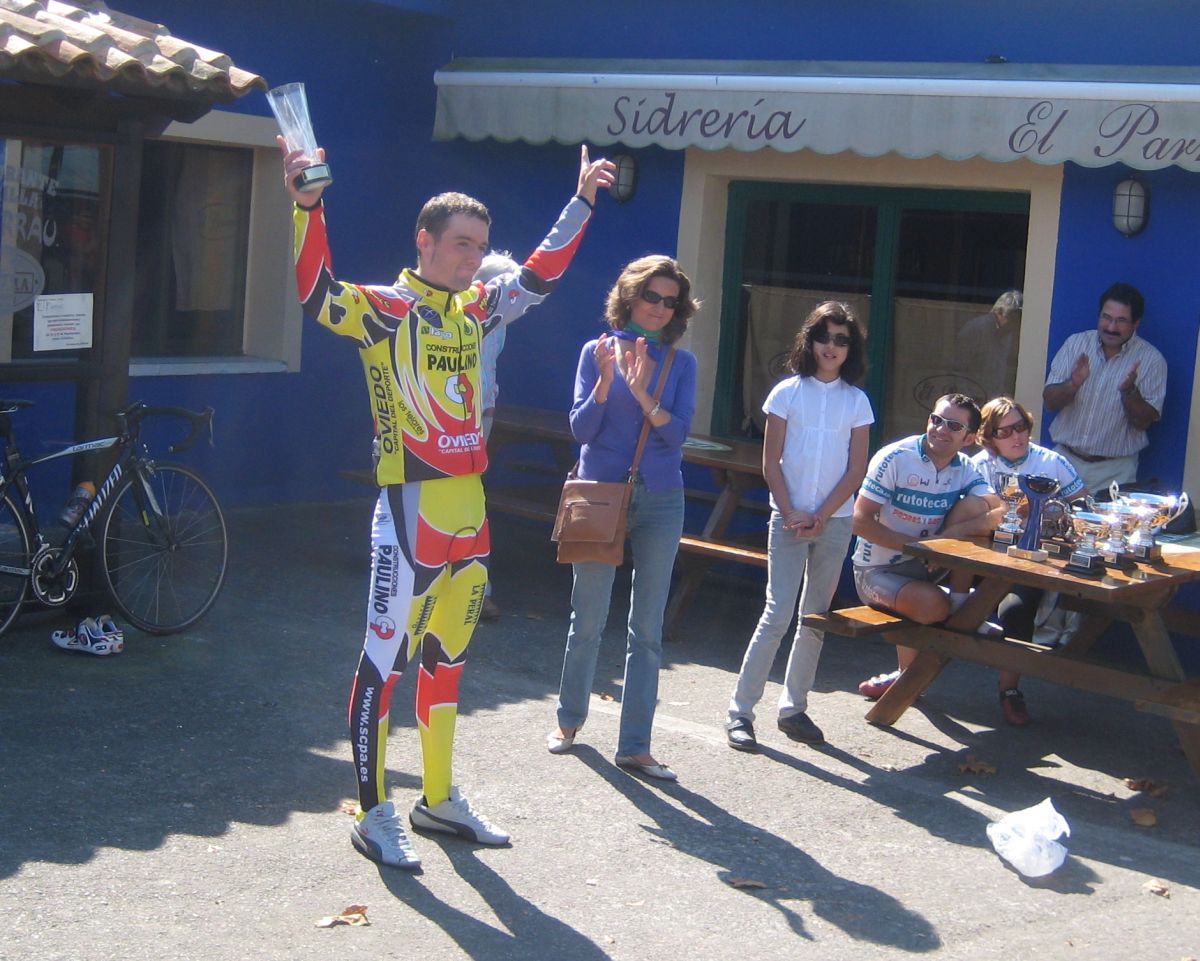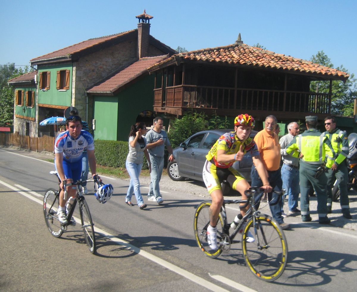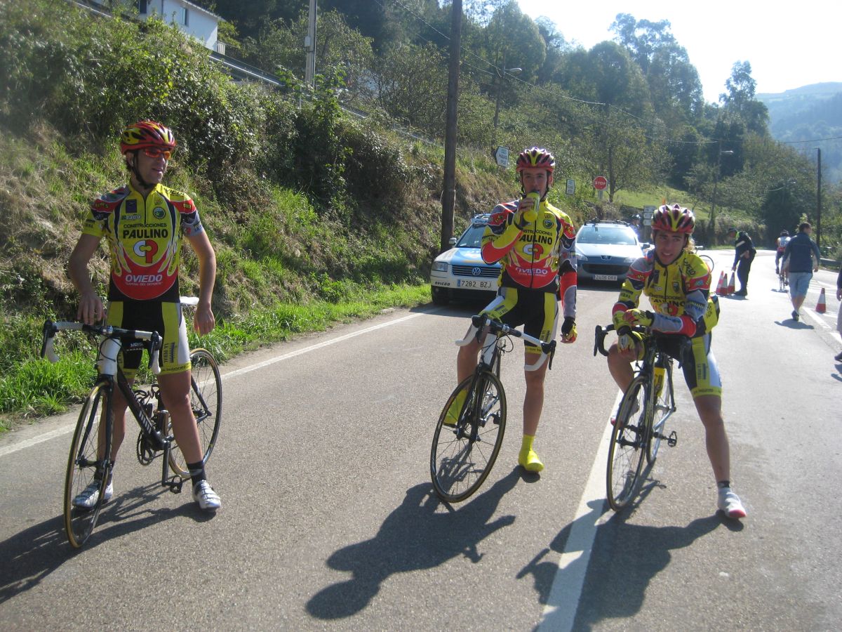 Ya en el último km, metí el plato y ataqué, ya esaba harto de tanta ostia, de tanto paseo, me fui con algunos mas, que salieron muy cucos y me ganaron el sprint por la montaña, yo pasé tercero por el Alto de la Manzaneda, San Esteban de las Cruces, a la altura de la Sidreria Parrau, donde estaba situada la línea de meta. Parecía que se animaba la carrera, con mi ataque y el sprint de la montaña nos habíamos marchado 4 hombres, 2 Paulinos, Treceño y yo, me puse a dar continuidad con Treceño, al principio los Paulinos no pasaban y eso que eran mayoría, no iba su capitán Mario de Sarraga y eso les creaba dudas.