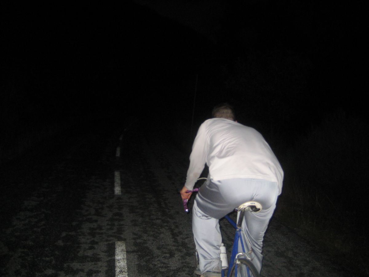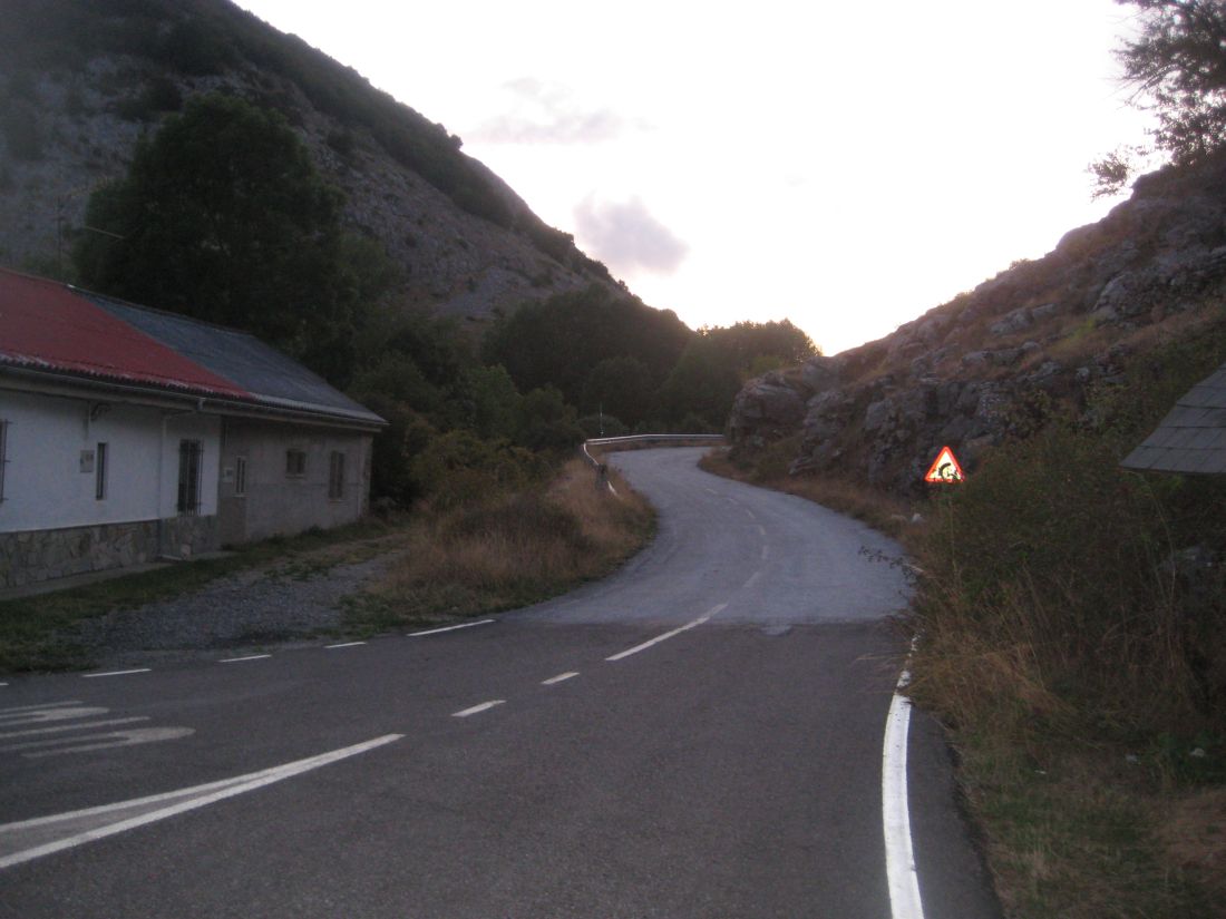 Ya totalmente de noche con la carretera mojada, que no se ha secado en todo el día a la sombra de los hayedos.