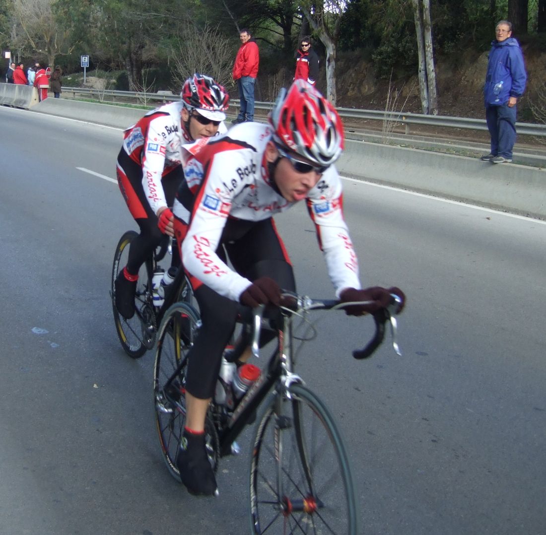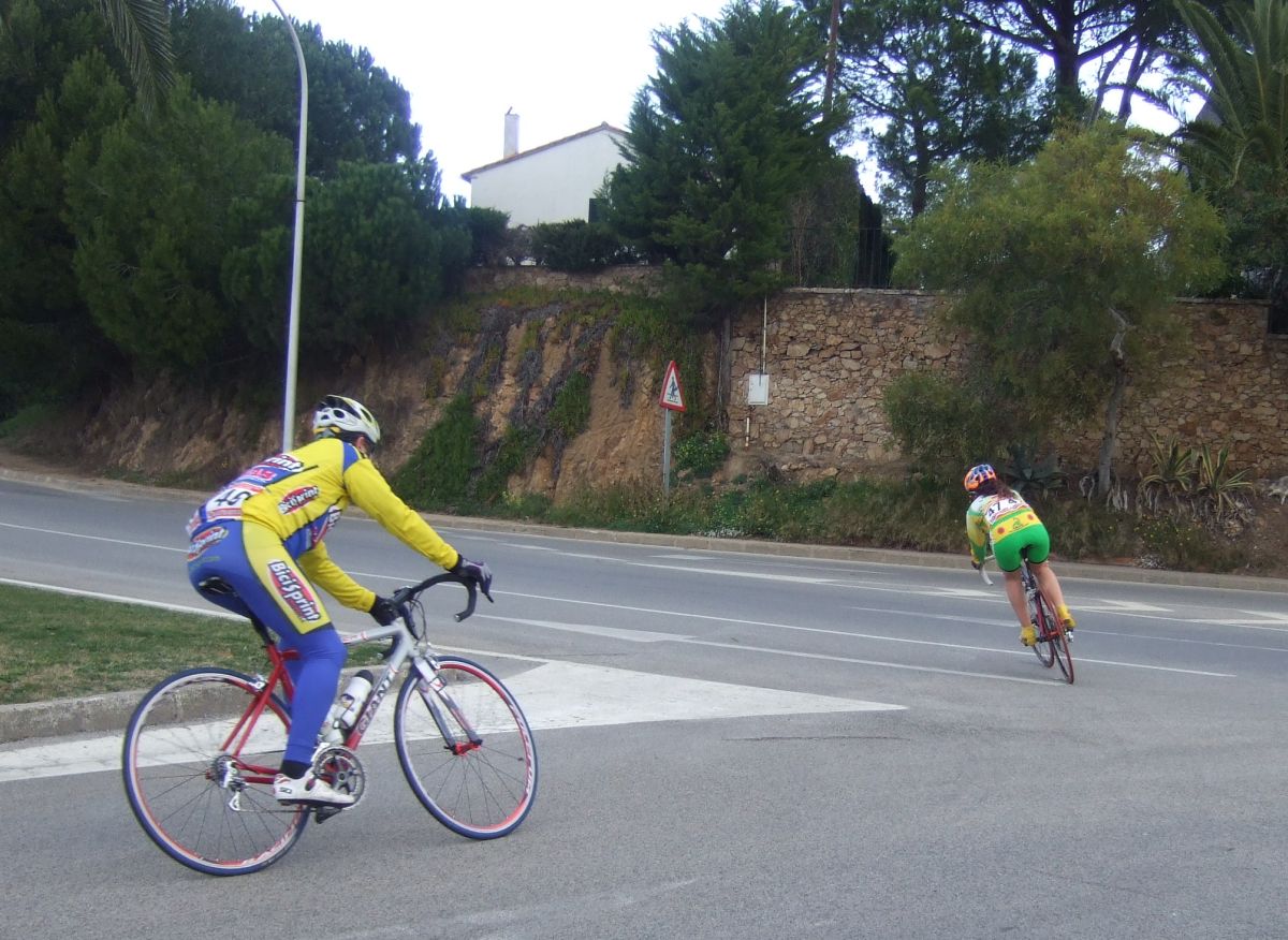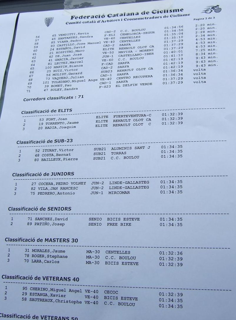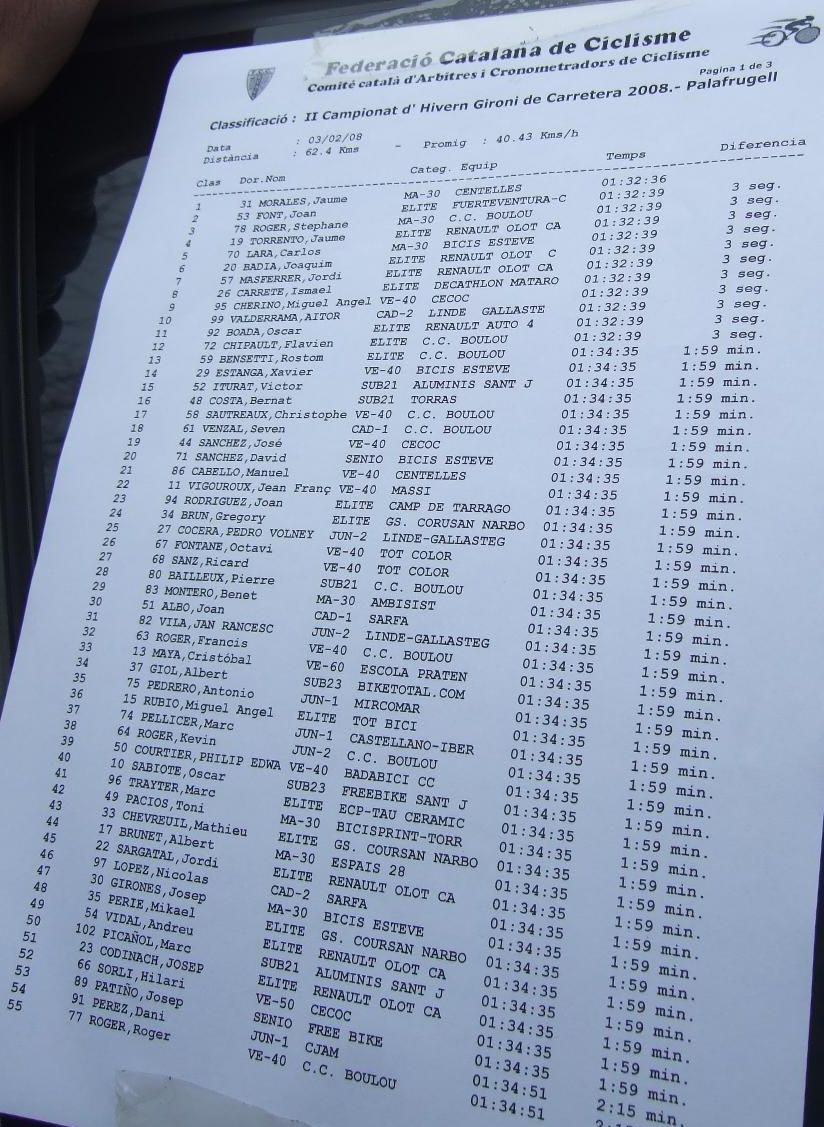 En la tercera vuelta intento de fuga con Quim Badia de mi equipo, Jordi Sargatal y yo mismo, pero la cosa no ha funcionado, solo a servido para meter el pelotón en fila al salir de la curba cerrada. Finalmente ha hecho acto de presència la lluvia y esto ha puesto la carrera un poco peligrosa, cosa que han aprovechado mis compañeros, Jaume Torrentó, Jordi Masferrer y Quim Badia para abrir hueco con otros corredores como el mítico Morales, el socialomano de Cataluña Joan Font y alguno que otro francés de esos. La escada esa ha sido la buena, pero por detrás las ostias no paraban y tanto Andreu, com Jordi y yo hemos ido manteniendo el pelotón unido y sin que nos marchará demasiado ningun “infiltrado”. La escapada ha llegado, victoria del mitíco Morales, que se ha escapado a falta de media vuelta en solitario, segundo Joan Font, 3ro un franchuti, 4º Jaume Torrentó, que de esta manera ha hecho 2n elite, 6º Quim Badia, dando el 3r puesto Elite para el equipo de Banyoles, Jordi Masferrer ha obtenido el octavo puesto.