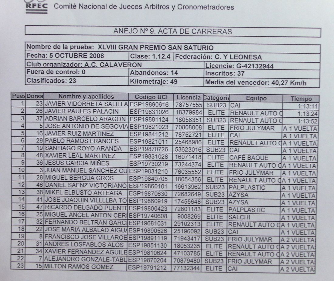 Clasico trofeo de san saturio en soria, supone el cierre a la temporada de muchos elites de los equipos cercanos a la provincia soriana.Circuito de 1.5 kms con mitad de subida suave y constante, y otra mitad de bajada rapida que acaba en curva peligrosa, y donde todos los años se cae alguien