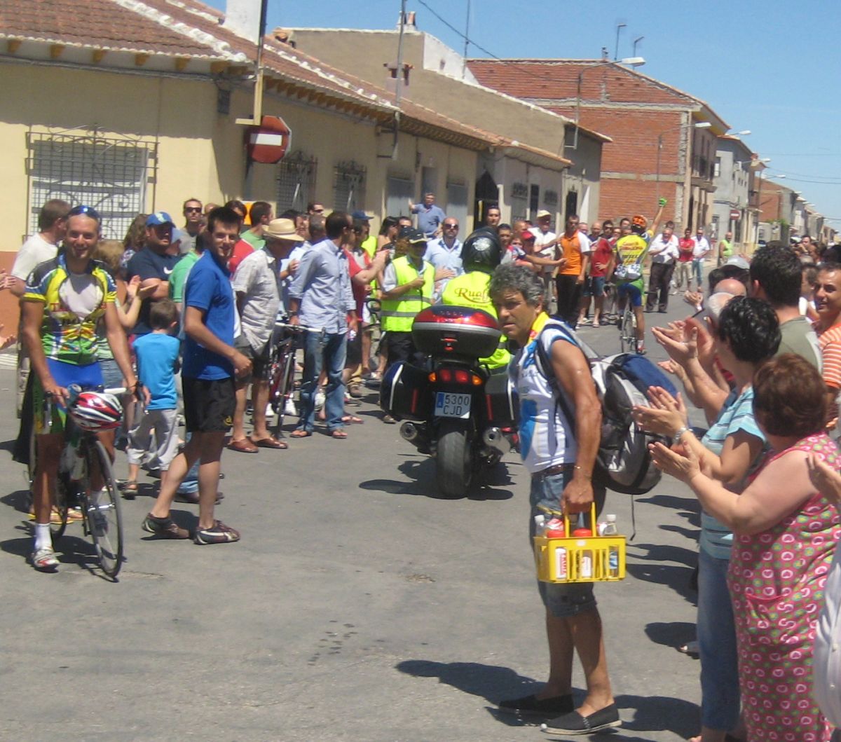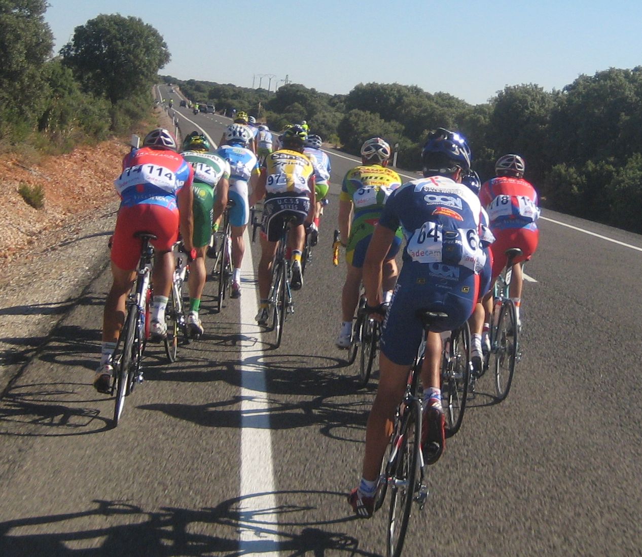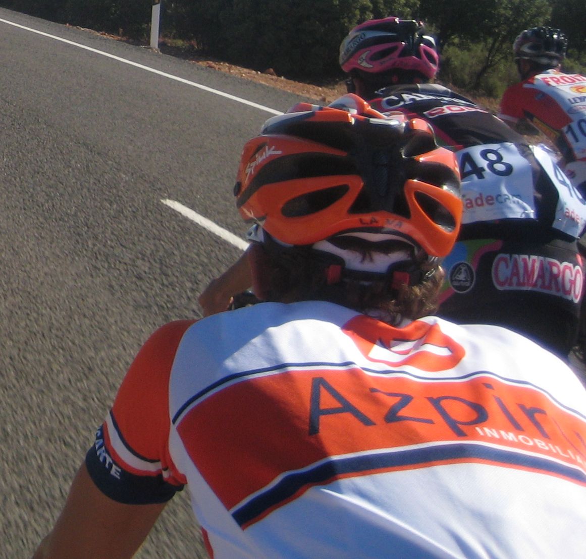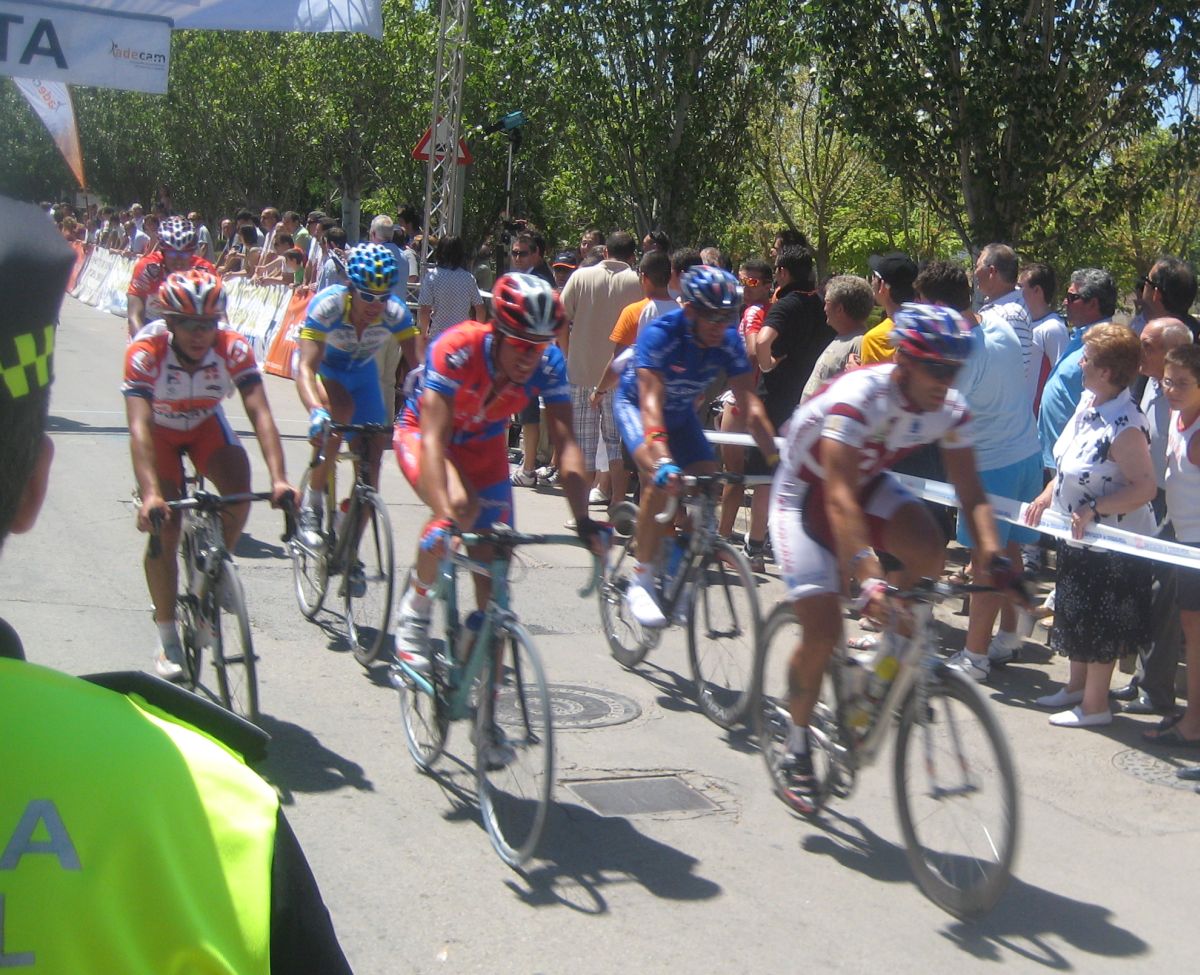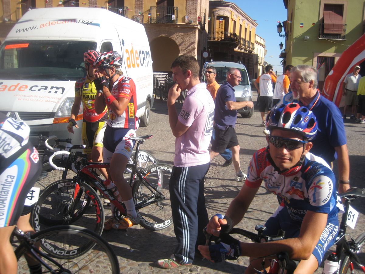 Confié en que sería el tipico corte tonto que se aborta con un látigo de pelotón, pero no hubo látigo, lo que si hubo fue una caida de un Camargo, en la cabeza, se cayó mientras intentaba arrancar, al chocar con otro. Fue delante de mí, yo pasé entre el ciclista y su bici, y luego me toco perseguir, con la caida hubo un pequeño parón y los que habían arrancado bajando con el impulso tenían ya mucho hueco. La caida del Camargo fue determinante para el desarrollo de la escapada, de unos 30 corredores, donde no metimos ninguno, y donde se fue, se escapó la carrera, salvo para algunos, para aquellos que son capaces de grandes remontadas, como David Vitoria y sus 6 minutos de la segunda etapa de Castellón con aire de cara, Vitoria iba atrás, con David gutierrez, pero esos kapos remontarían mas adelante.