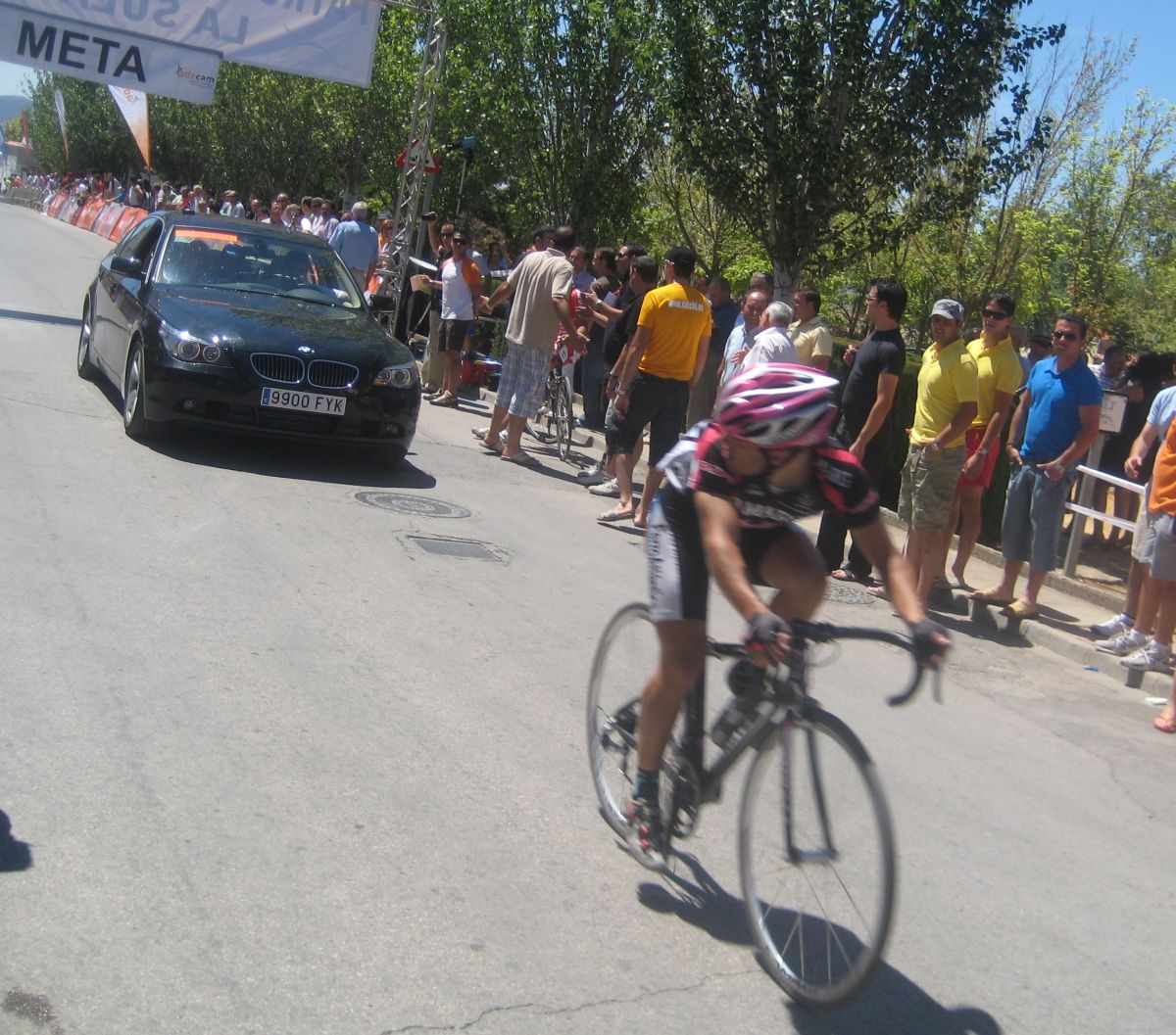 Arriba después de coronar el pelotón se había reducido mucho, el ritmo había pasado factura a mucha gente, el ritmo que no el puerto que no era gran cosa, pero hace mas daño siempre la velocidad que la pendiente. Ya empezé yo a meterme en muchos cortes, me cebé demasiado, pero lo estaba haciendo bien, por que era el momento donde se iba a hacer, estaba yo en la parte delantera del pelotón, en el medio, cuando veo que arrancan muchos bajando, unos por la izquierda y otros por la derecha. Era el típico parón que los que vienen de atrás lanzados aprovechan para atacar, atacaron por los flancos, y yo que estaba en medio me quedé encerrado, con ganas y fuerzas para salir, pero sin poder hacerlo.