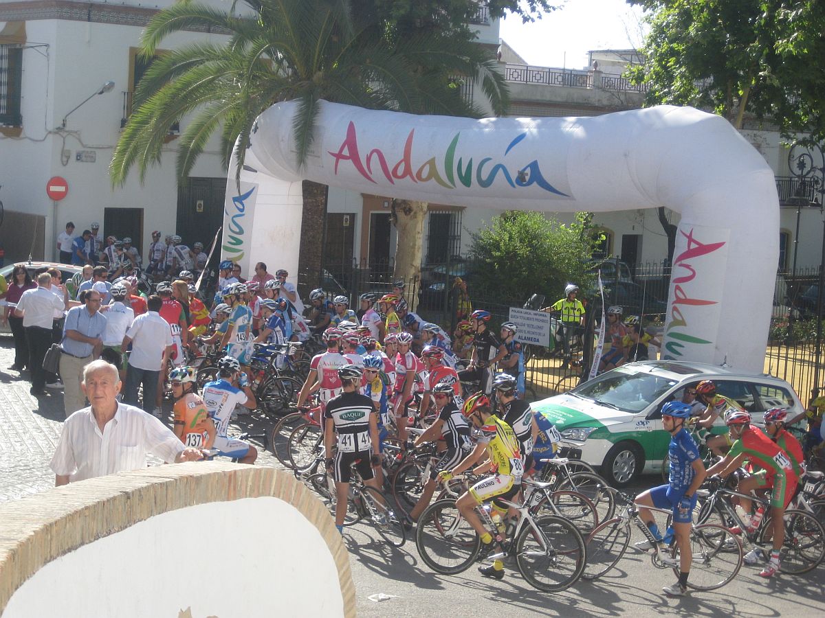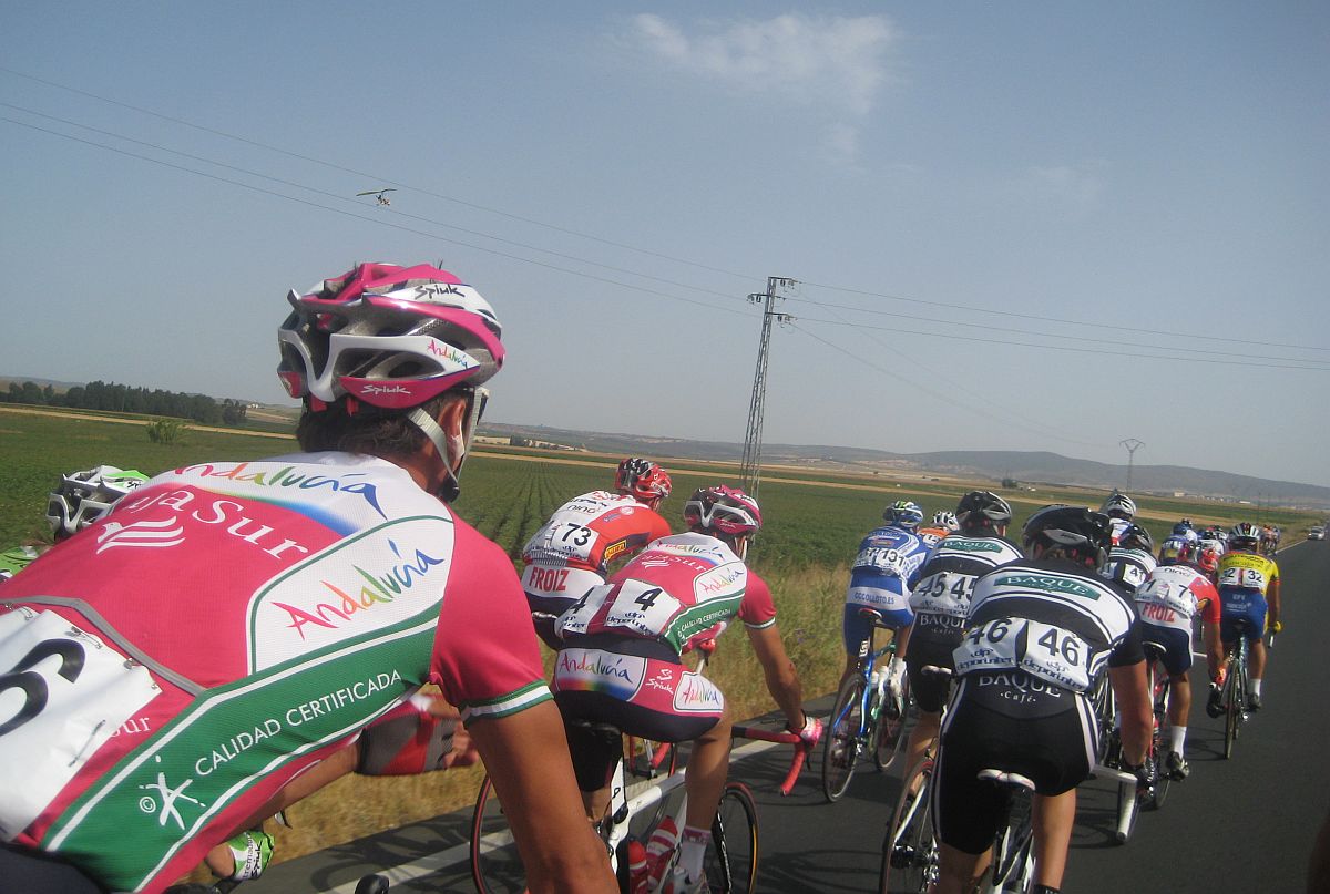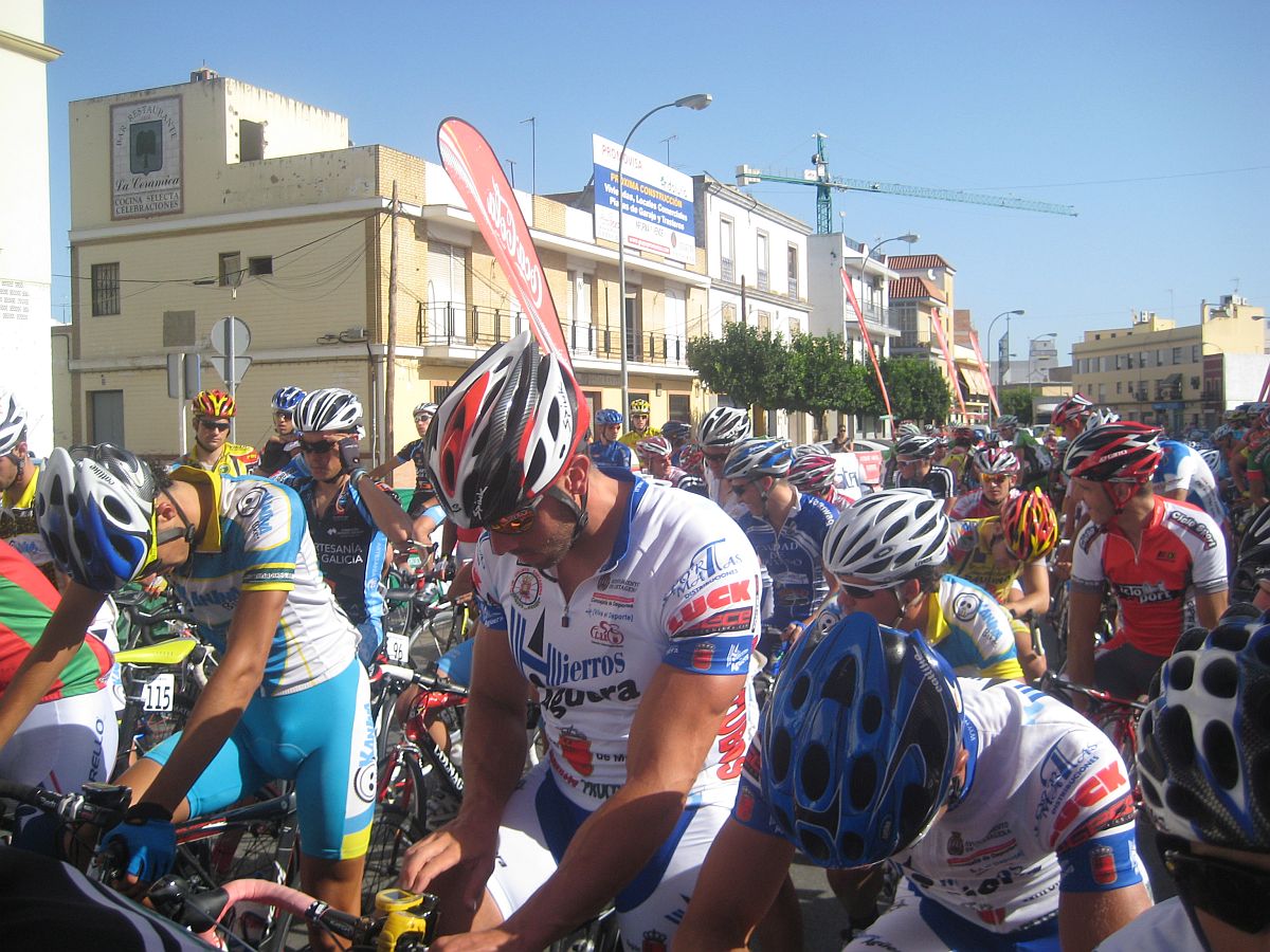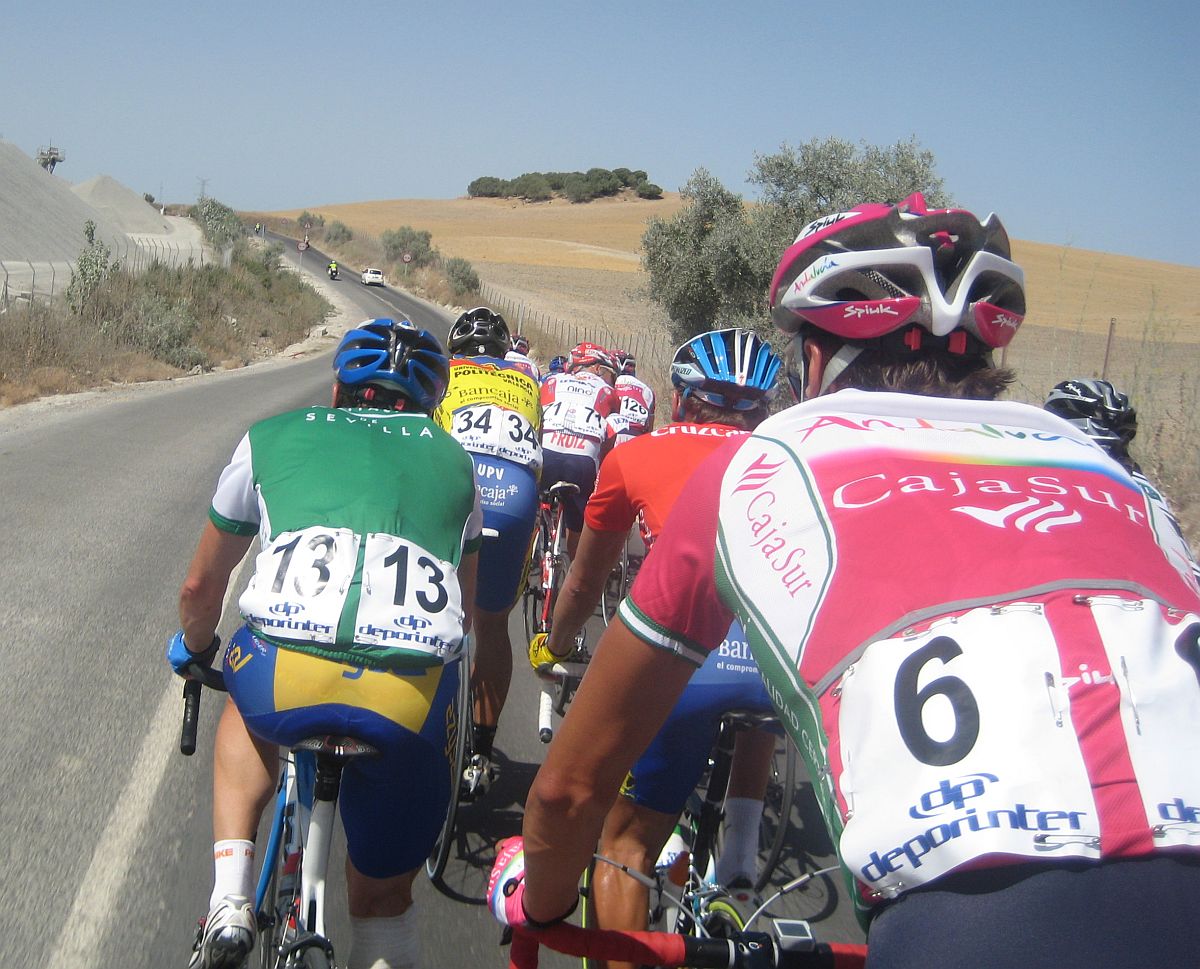 Ahí nos acomodamos a rueda, iban tirando los Cajasur para Montenegro, por delante iba una fuguilla con Alvaro García, Alexis, Tiago.. los mas escaladores, pero entre varios equipos tirando acabaron anulando la fuga poco antes de Lora del Río.