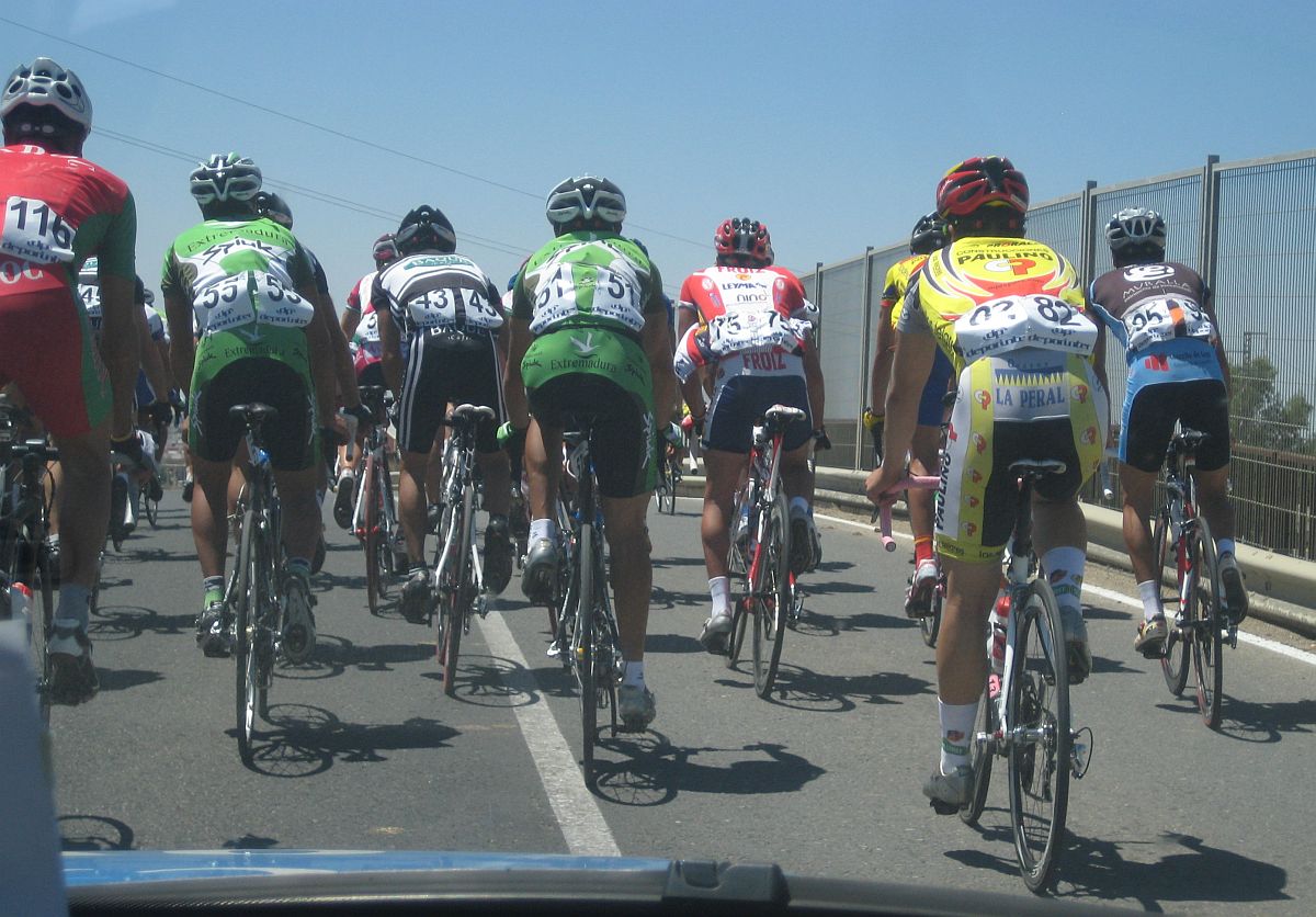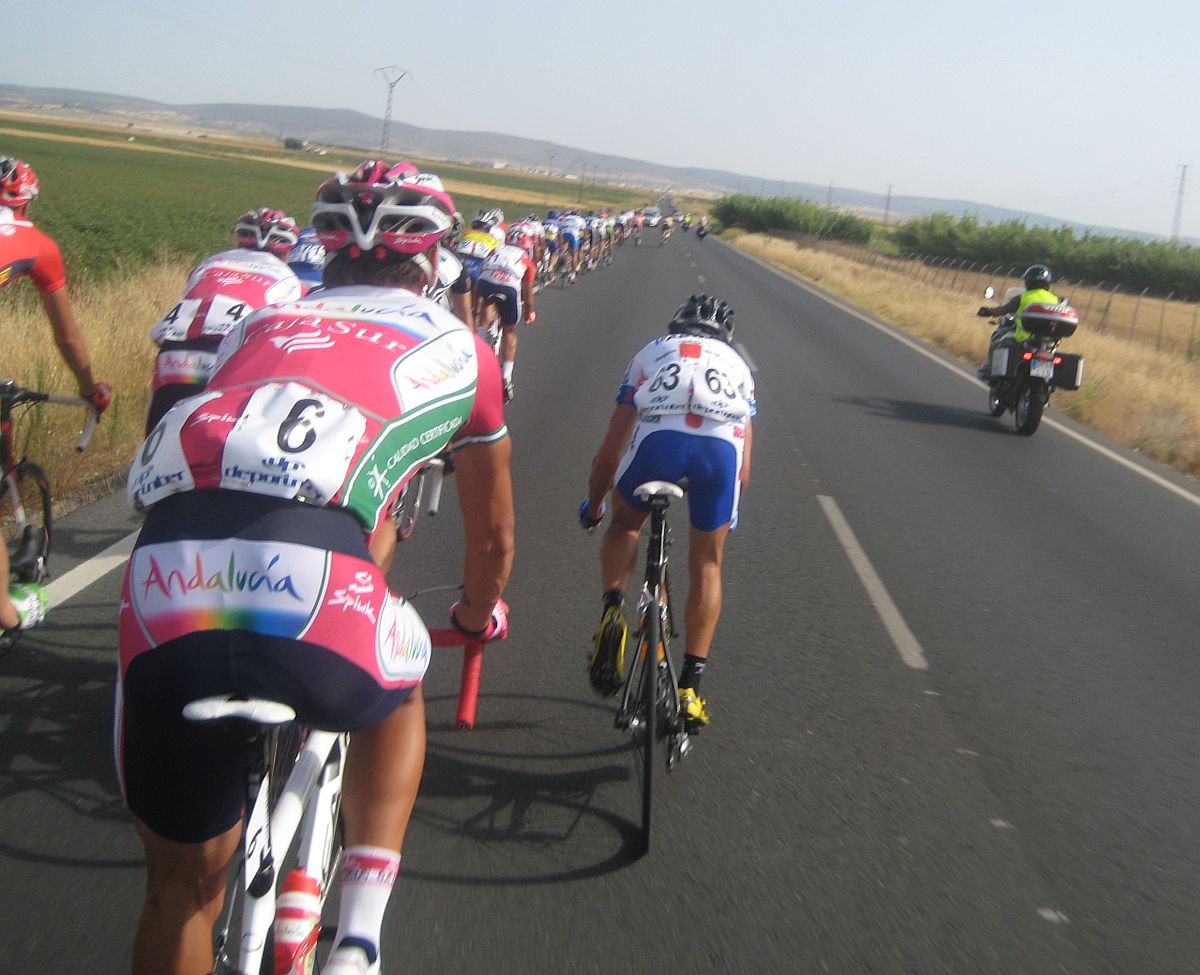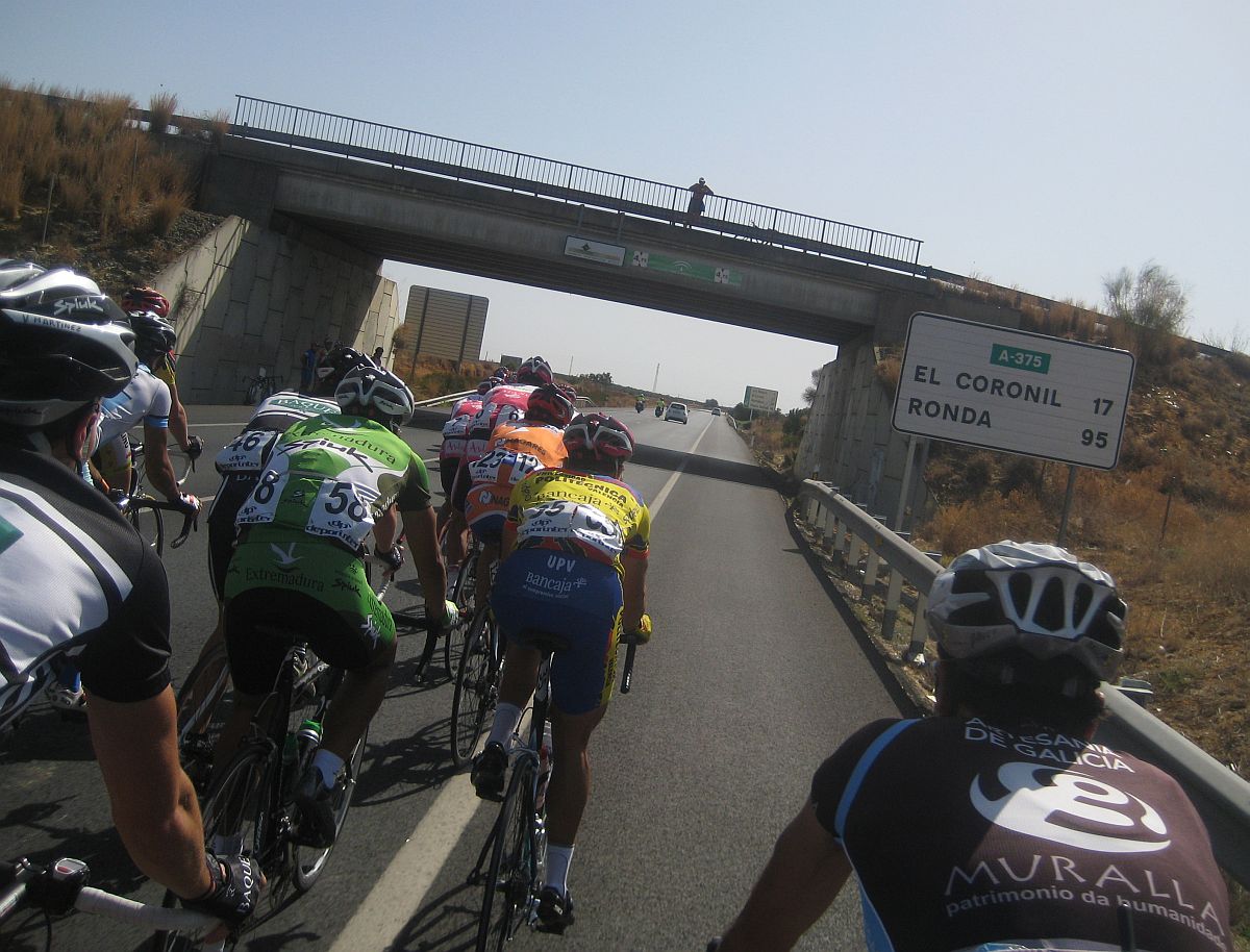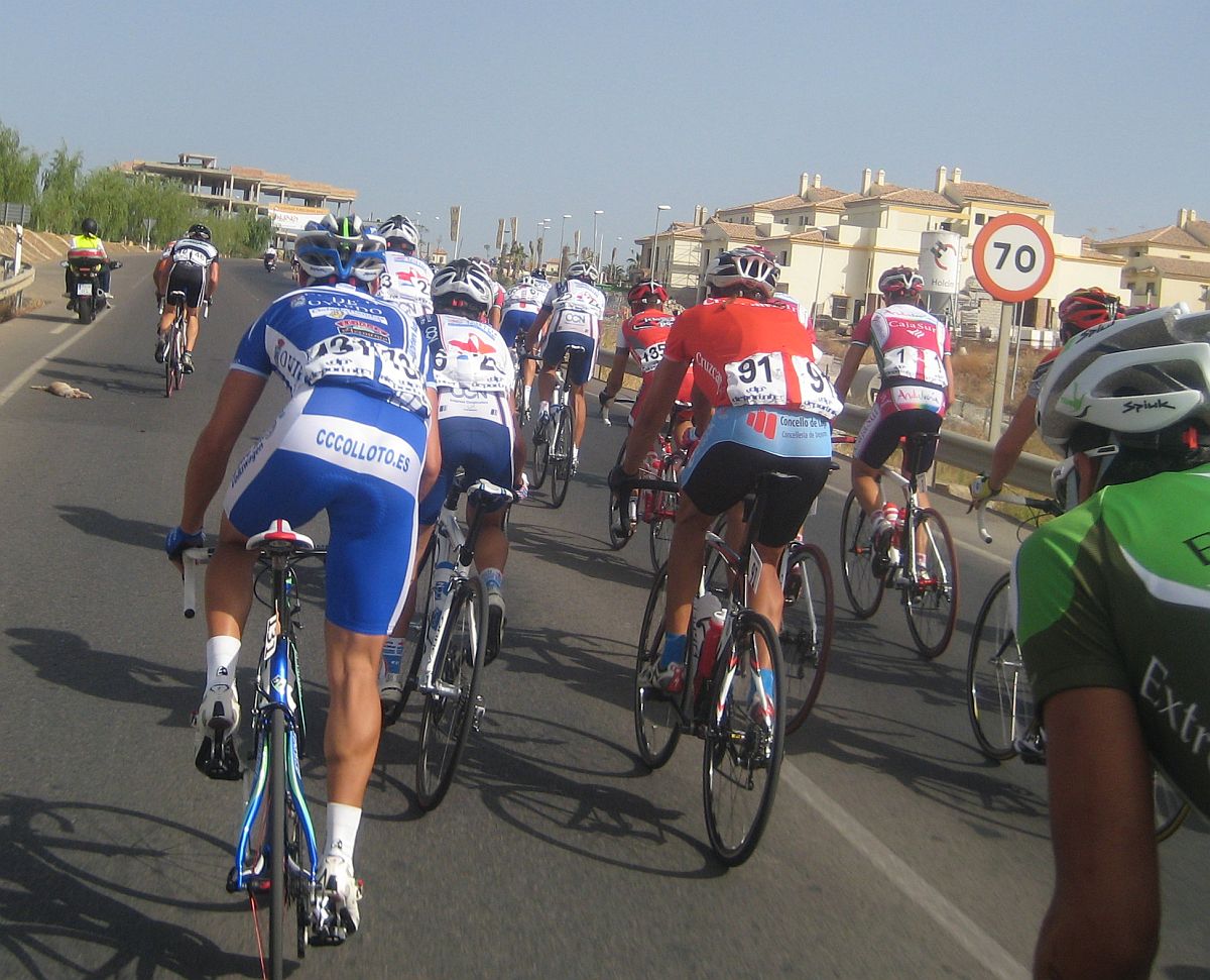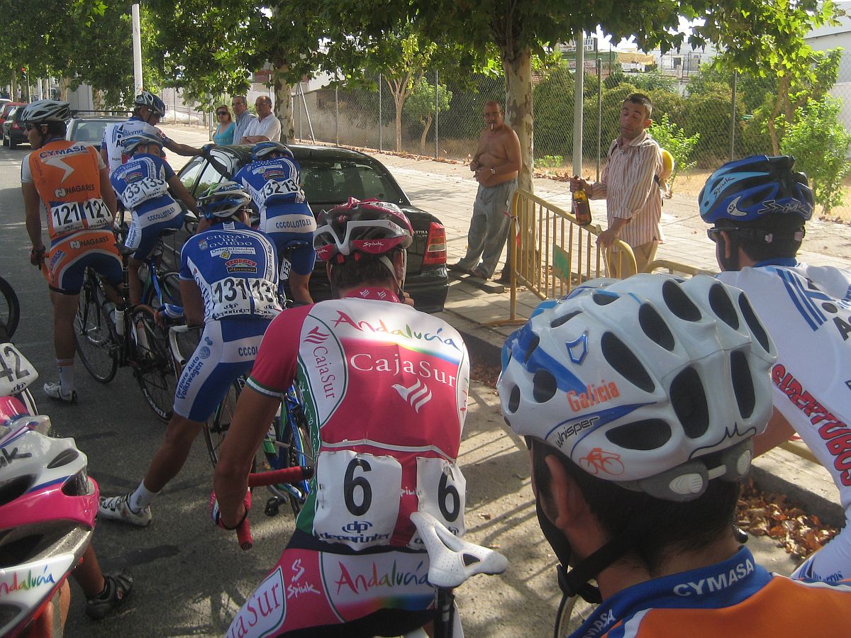 Ahí nos acomodamos a rueda, iban tirando los Cajasur para Montenegro, por delante iba una fuguilla con Alvaro García, Alexis, Tiago.. los mas escaladores, pero entre varios equipos tirando acabaron anulando la fuga poco antes de Lora del Río.