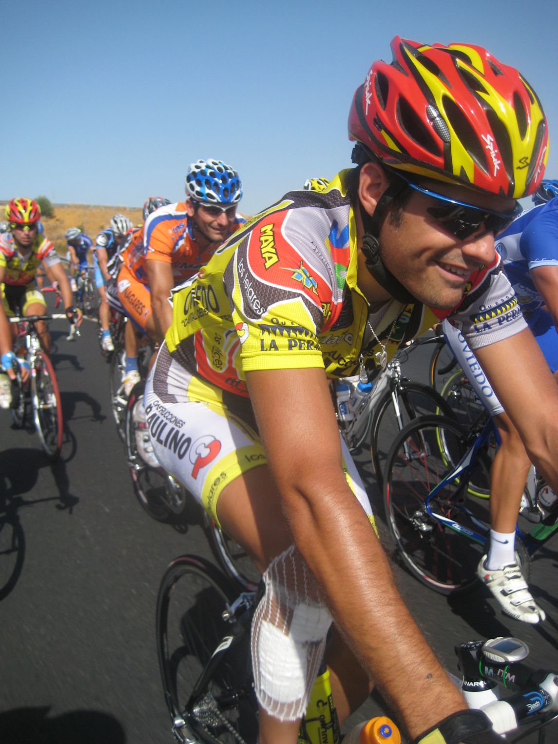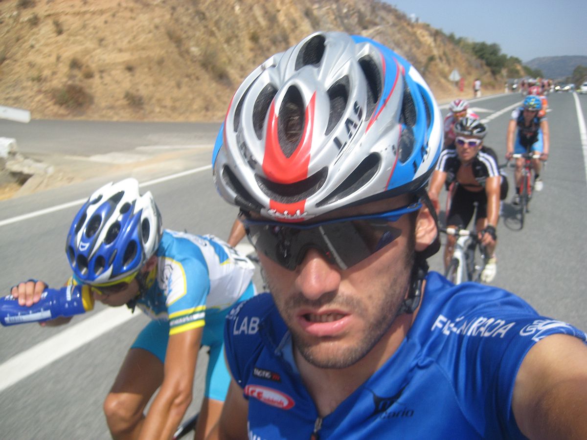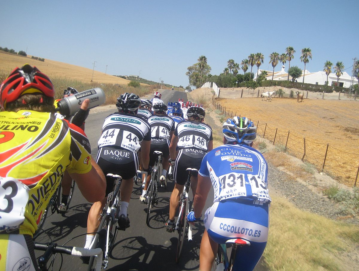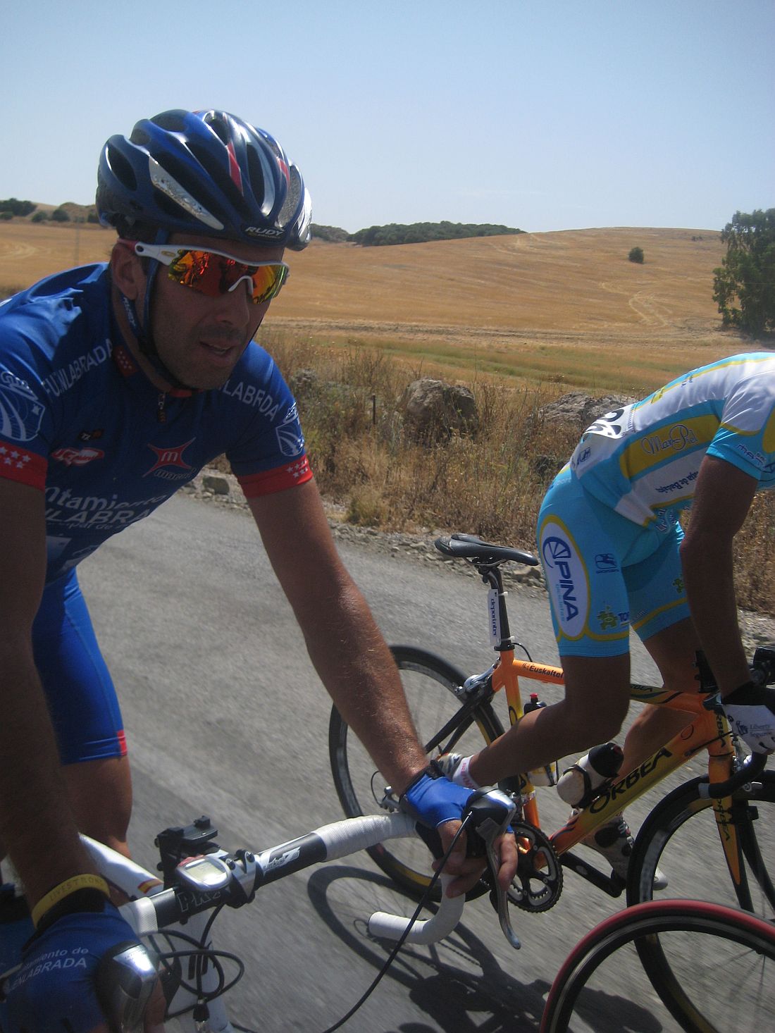 Llegamos al primer puerto duro, ahi aguante en el grupo subiendo como podía pero en el siguiente puerto el grupo paró, vi que gente como Salgueiro o Antonio García se quedaban ahí y tuve que arrancar a plato para irme y coger alante, que era donde estaba la carrera, pillé a David que iba en medio y los dos nos pegamos una remada haciendo todo el durisimo tramo de puertos de la sierra sevillana hasta que entrando en un pueblo pillamos al grupo de alante, que eran unos 30, menos mal!!