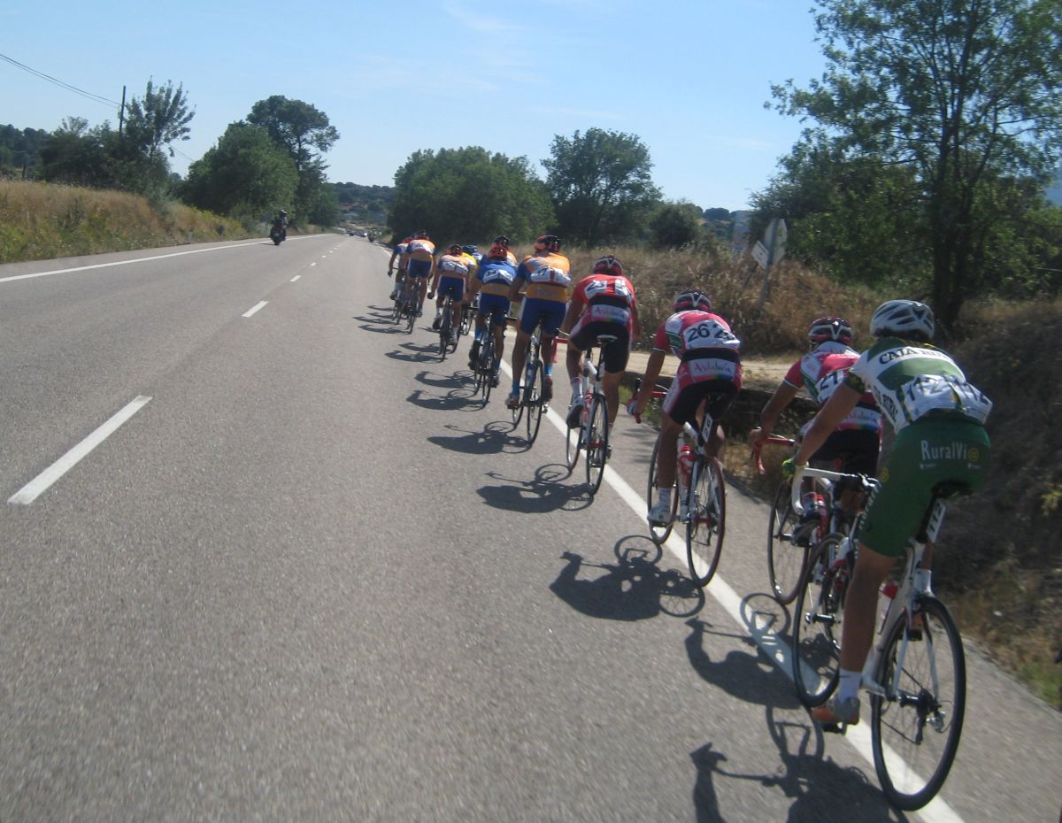 El pelotón pilló la fuga intermedia y nos fuimos por delante Carratalá, Abenamad, Navalón, un León y yo. Alante del todo estaba la fuga de Abel con 3 Leones, 2 Sanses..