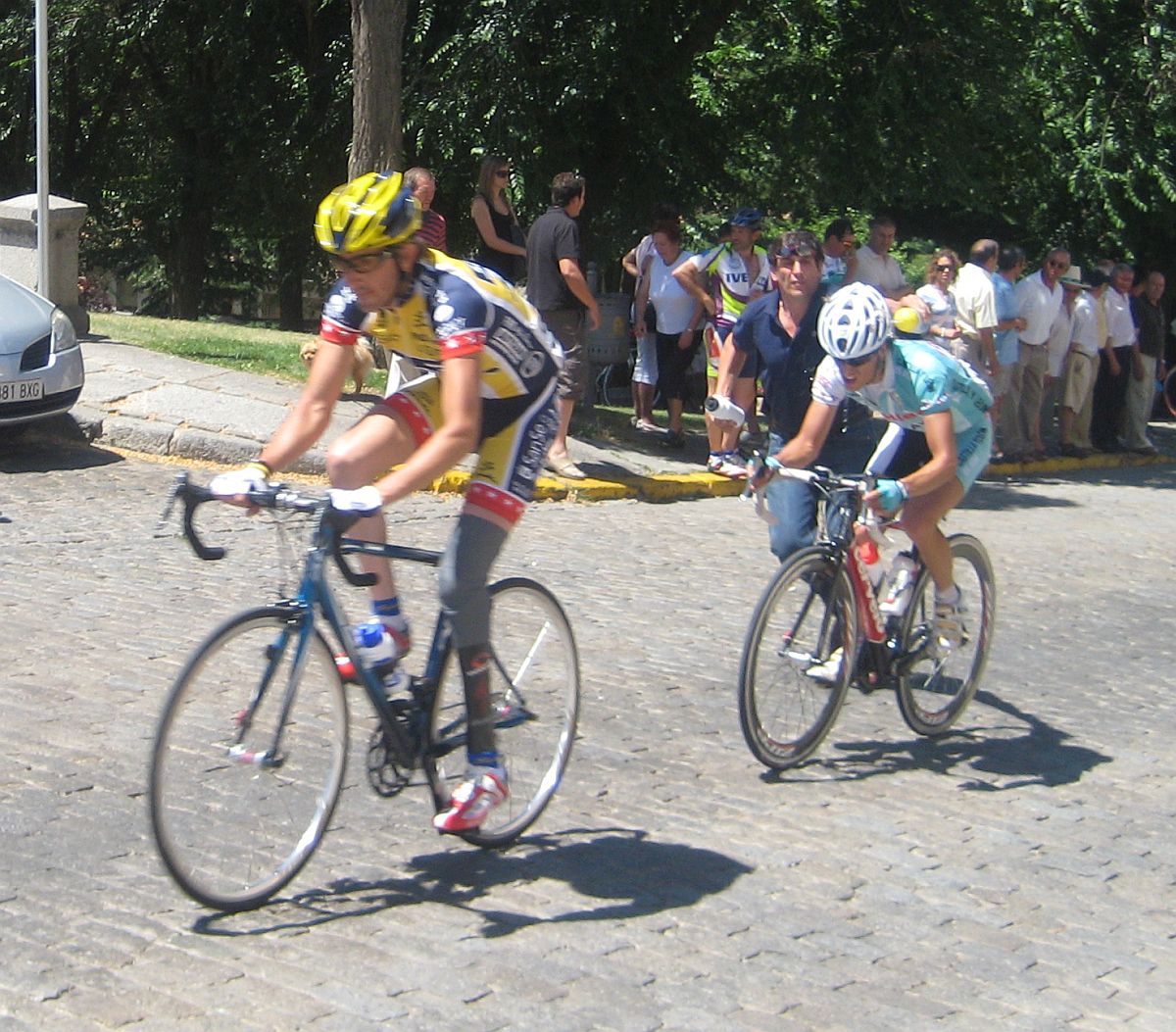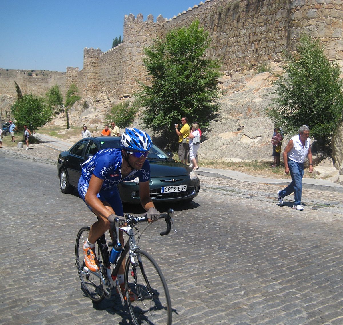 Y abrimos 3 minutos con el pelotón, pero 3 tios tirando es un desgaste que ibamos a llegar a las murallas medio muertos, y con otra escapada delante, aunque los de delante se iban descomponiendo en ataques, cogimos a un Caja Rural y a Pagani entrando en Avila, y comenzó la fiesta del adoquín.