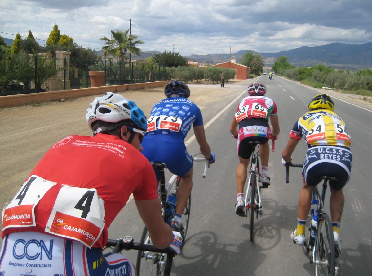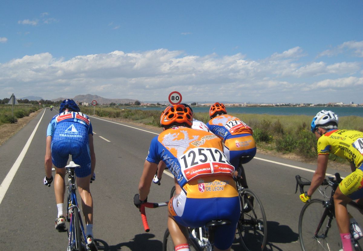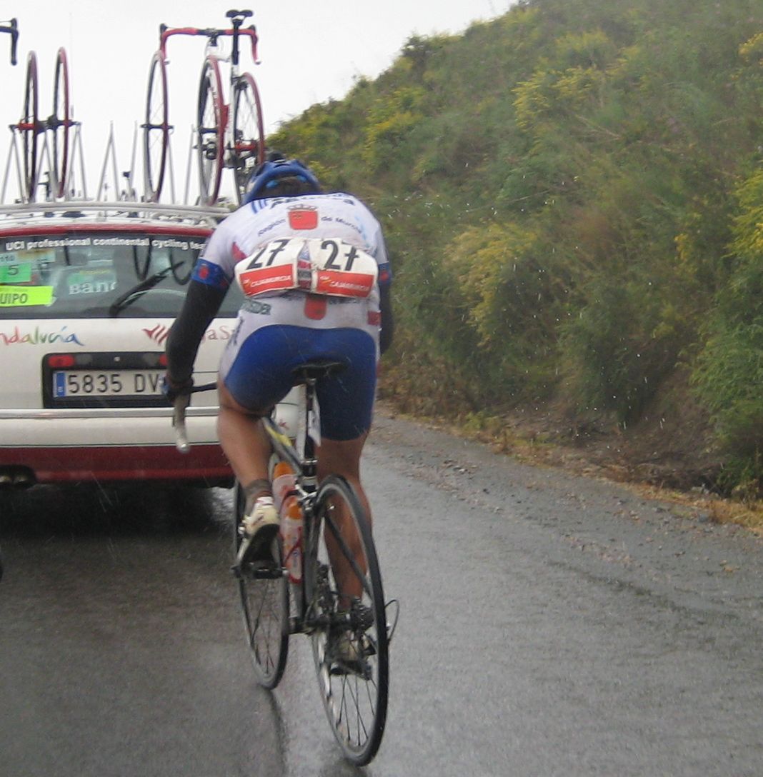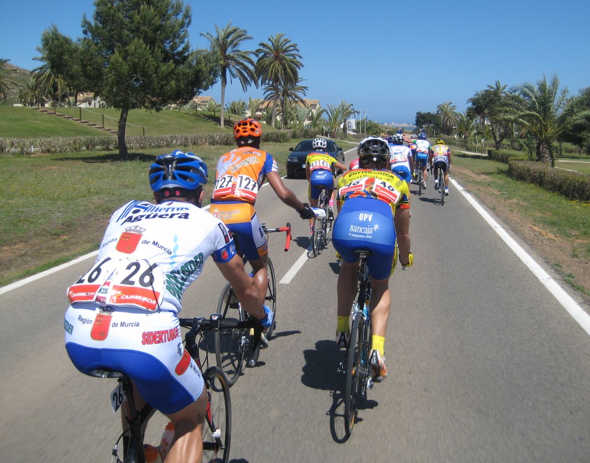 En esas grandes rectas por la zona de Fuente Alamo de Murcía iba yo solo, con la lluvia, el aire de cara.. ya paré, vi que no iba a ningun sitio, estuve unos 10 kms quemando las calorías que luego me iban a hacer falta, aflojé de los 40 por hora con el aire de cara a los 34 que me costaba mantener, y se iban acercando poco a poco, venían por la cuneta, cuando me cogieron solo venían 20 tios, se había cortado con el aire, mi ataque había tenido su significado, pero, pronto engancharon 30 tios mas, se jodió la cosa.