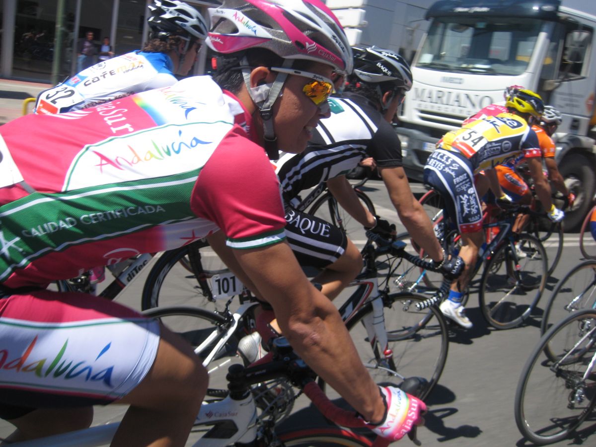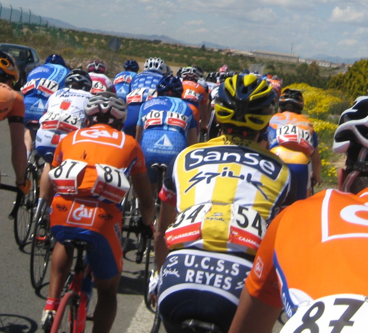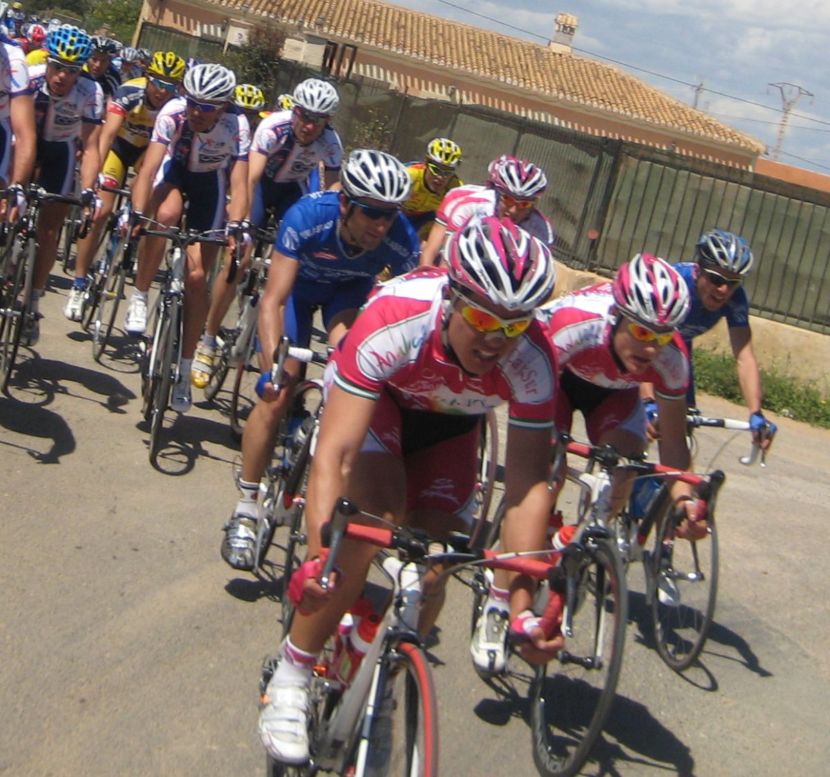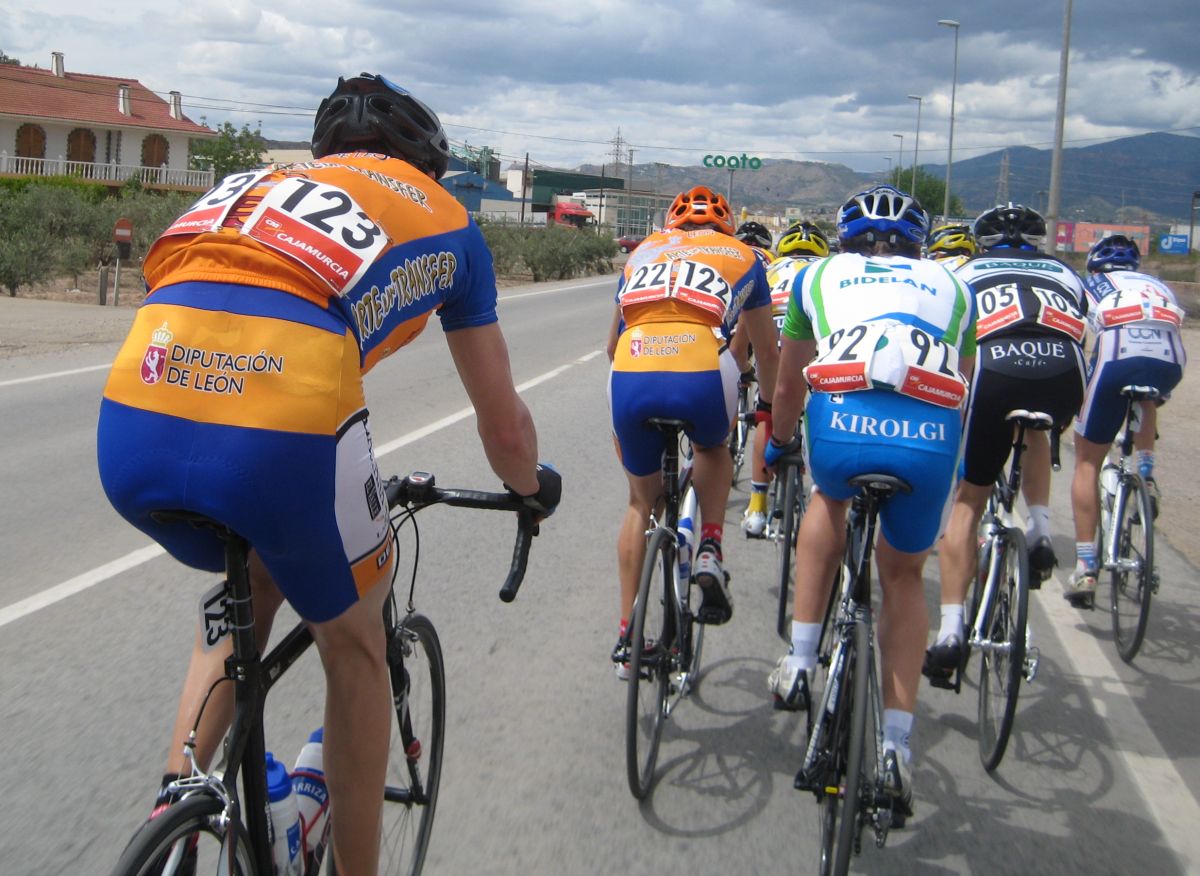 En esas grandes rectas por la zona de Fuente Alamo de Murcía iba yo solo, con la lluvia, el aire de cara.. ya paré, vi que no iba a ningun sitio, estuve unos 10 kms quemando las calorías que luego me iban a hacer falta, aflojé de los 40 por hora con el aire de cara a los 34 que me costaba mantener, y se iban acercando poco a poco, venían por la cuneta, cuando me cogieron solo venían 20 tios, se había cortado con el aire, mi ataque había tenido su significado, pero, pronto engancharon 30 tios mas, se jodió la cosa.