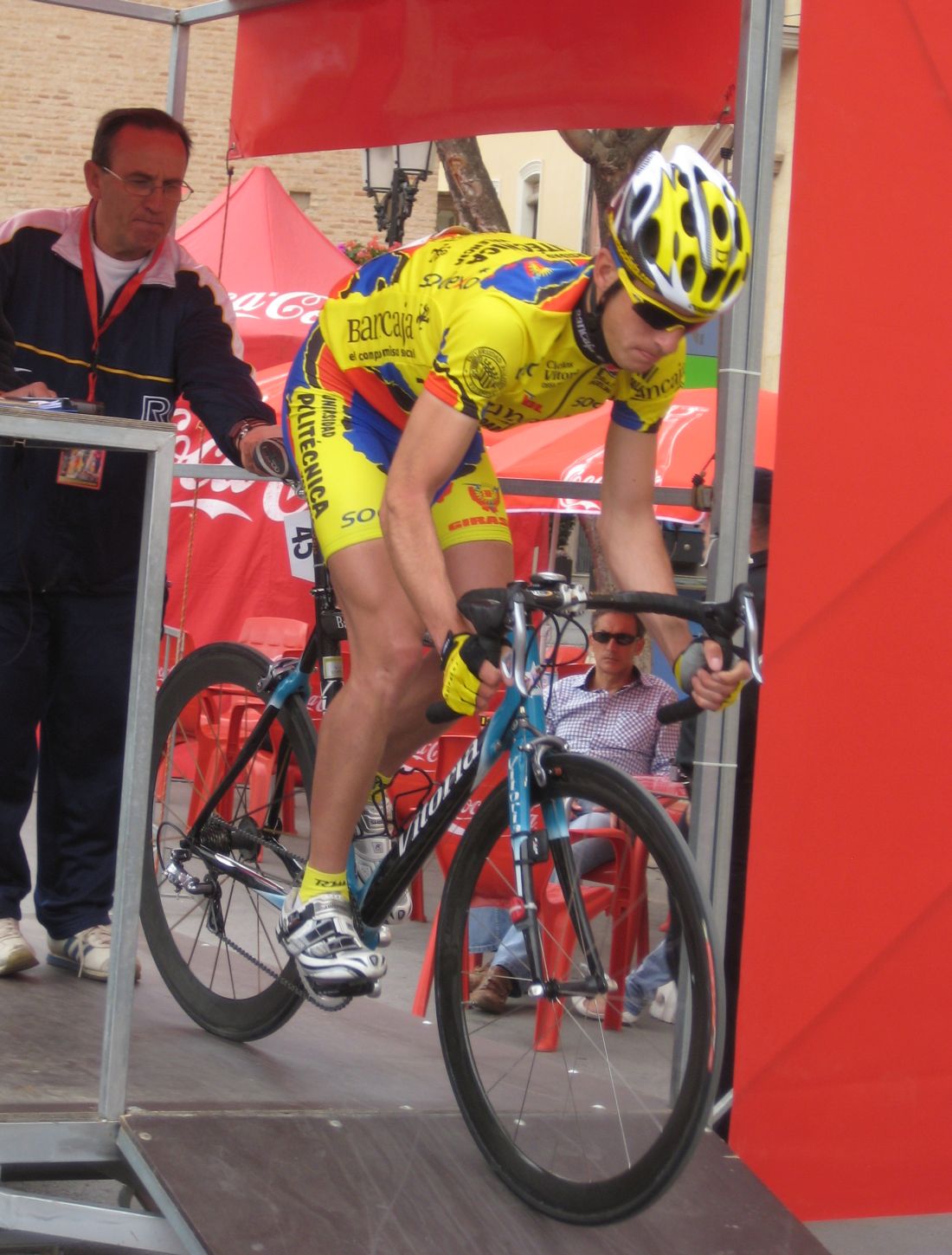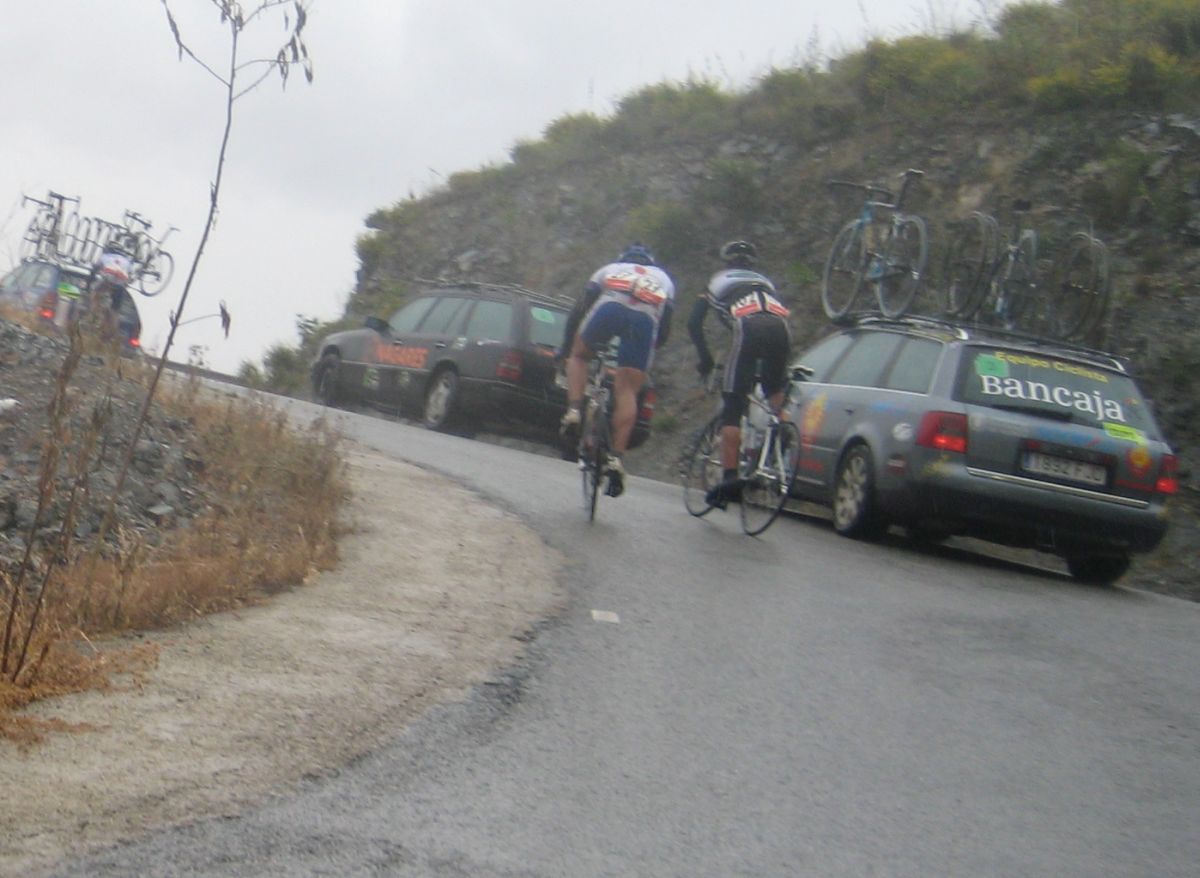 En esos momentos se hizo el corte bueno, en el que no metimos a nadie, asi que Jose nos mandó tirar, todo el equipo a tirar, Andujar, Dani, Ebel, Máximo, Pizarro y yo tirando con los Cajasur, yo que no tenía buenas sensaciones intenté encontrarlas tirando, pero tampoco cogía buen ritmo, ademas nos tocó tirar con el aire de cara, la gente a rueda iba bien y el desgaste lo haciamos nosotros, cuando llegamos a las estribaciones del primer puerto empezaron a atacar, ahi si pegaba de costado y me mandaron al palco.