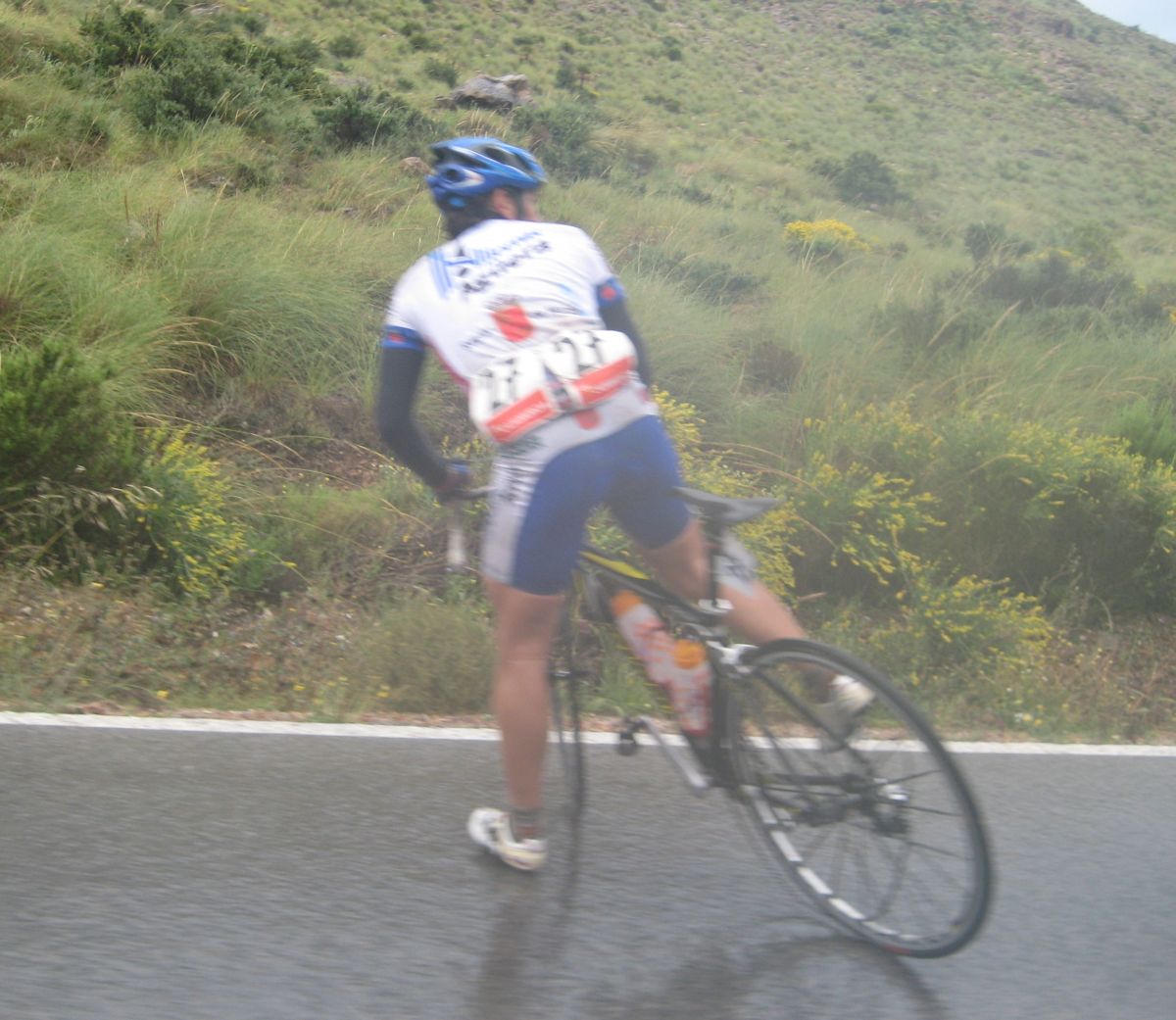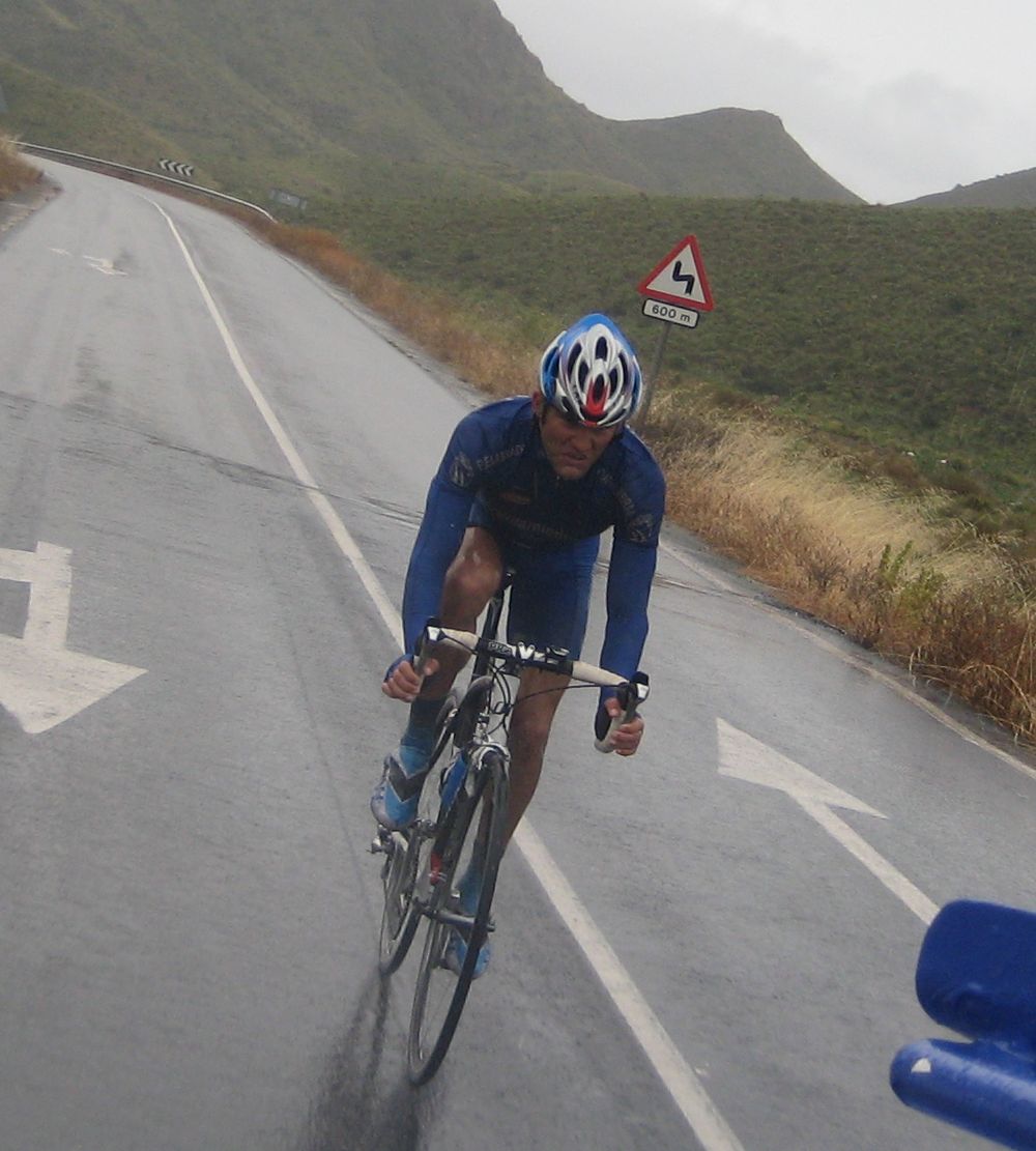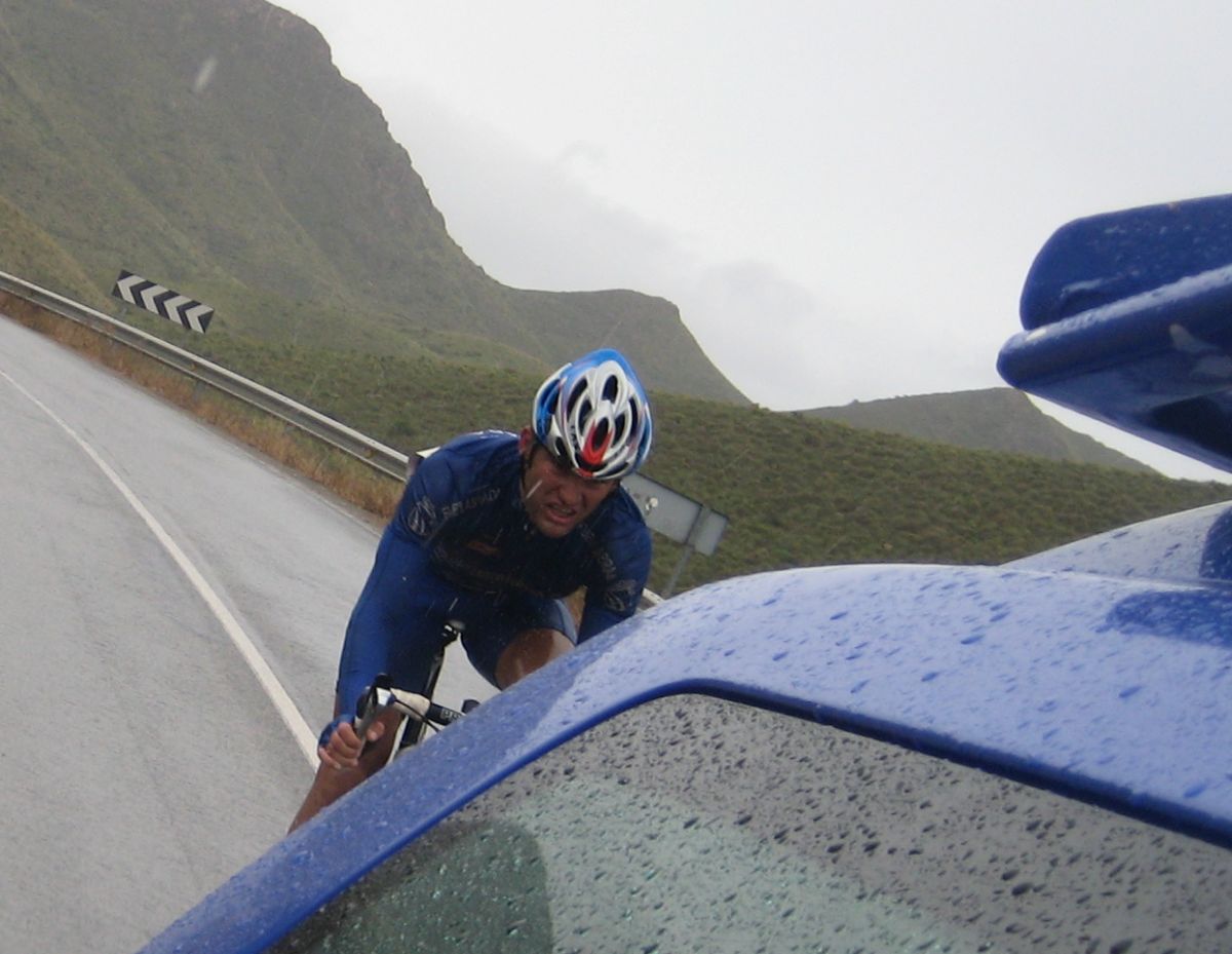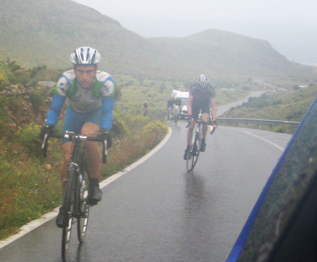 Pasaron todos los coches, de repente me veia ahí solo bordeando la playa de Mazarrón, con un frio humedo del mar y la lluvía que no paraba, pueblos sin nada de gente vacios, nadie, no había naiden!! y yo temblando de frio, tiritando, malisimo, con un maillot cortito cayendo agua helada a 9 grados, me había quedado hasta sin comida, no se commo podía hacer tanto frío por allí.