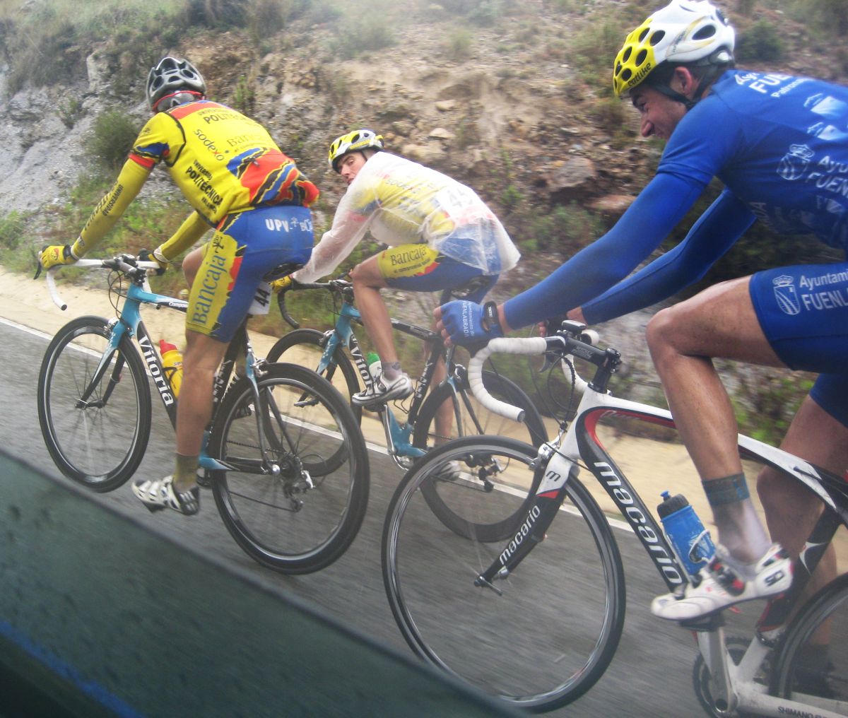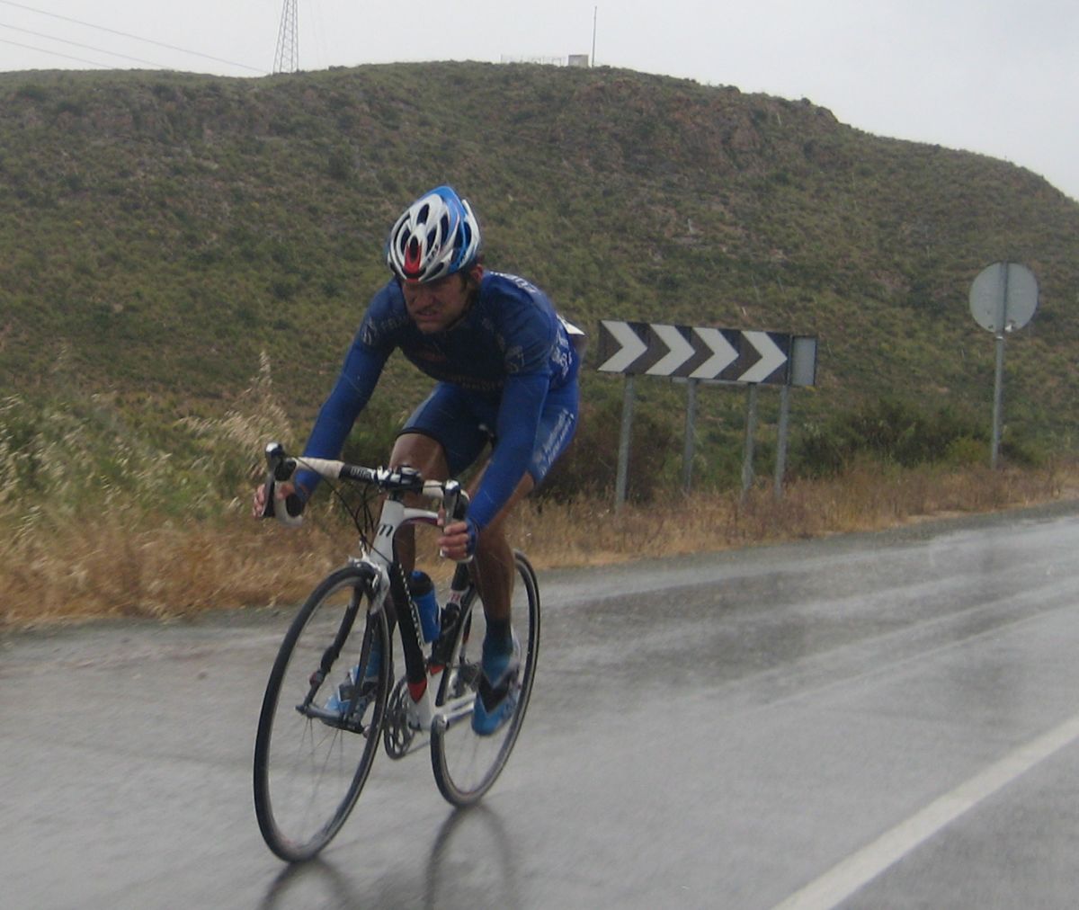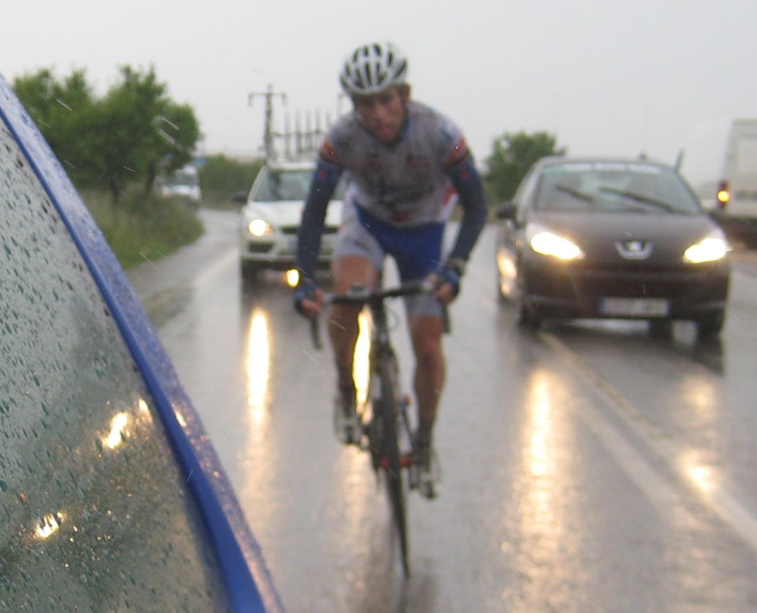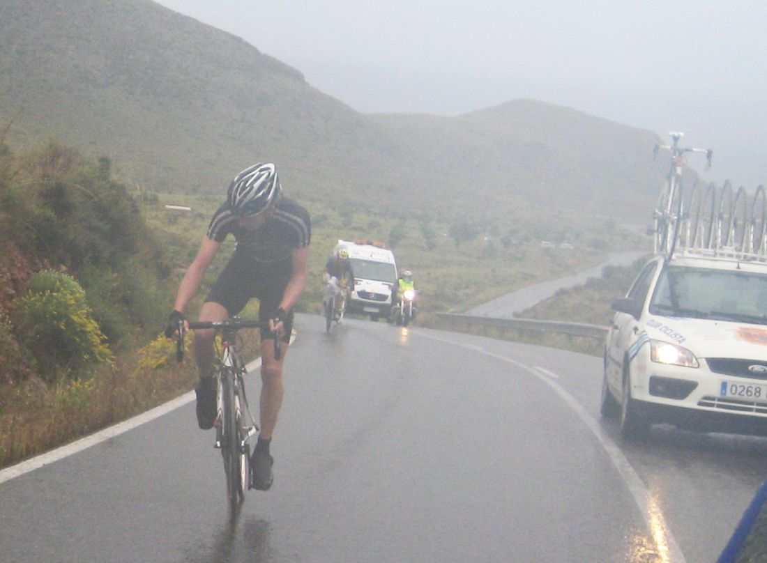Pasaron todos los coches, de repente me veia ahí solo bordeando la playa de Mazarrón, con un frio humedo del mar y la lluvía que no paraba, pueblos sin nada de gente vacios, nadie, no había naiden!! y yo temblando de frio, tiritando, malisimo, con un maillot cortito cayendo agua helada a 9 grados, me había quedado hasta sin comida, no se commo podía hacer tanto frío por allí.