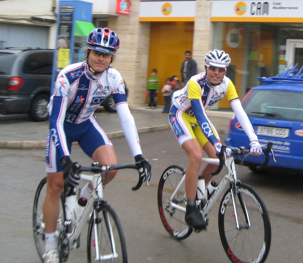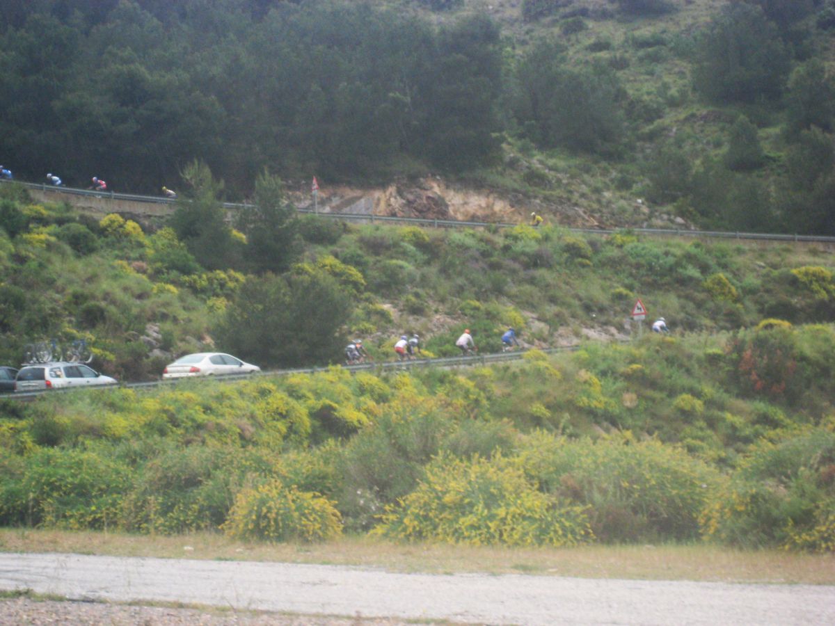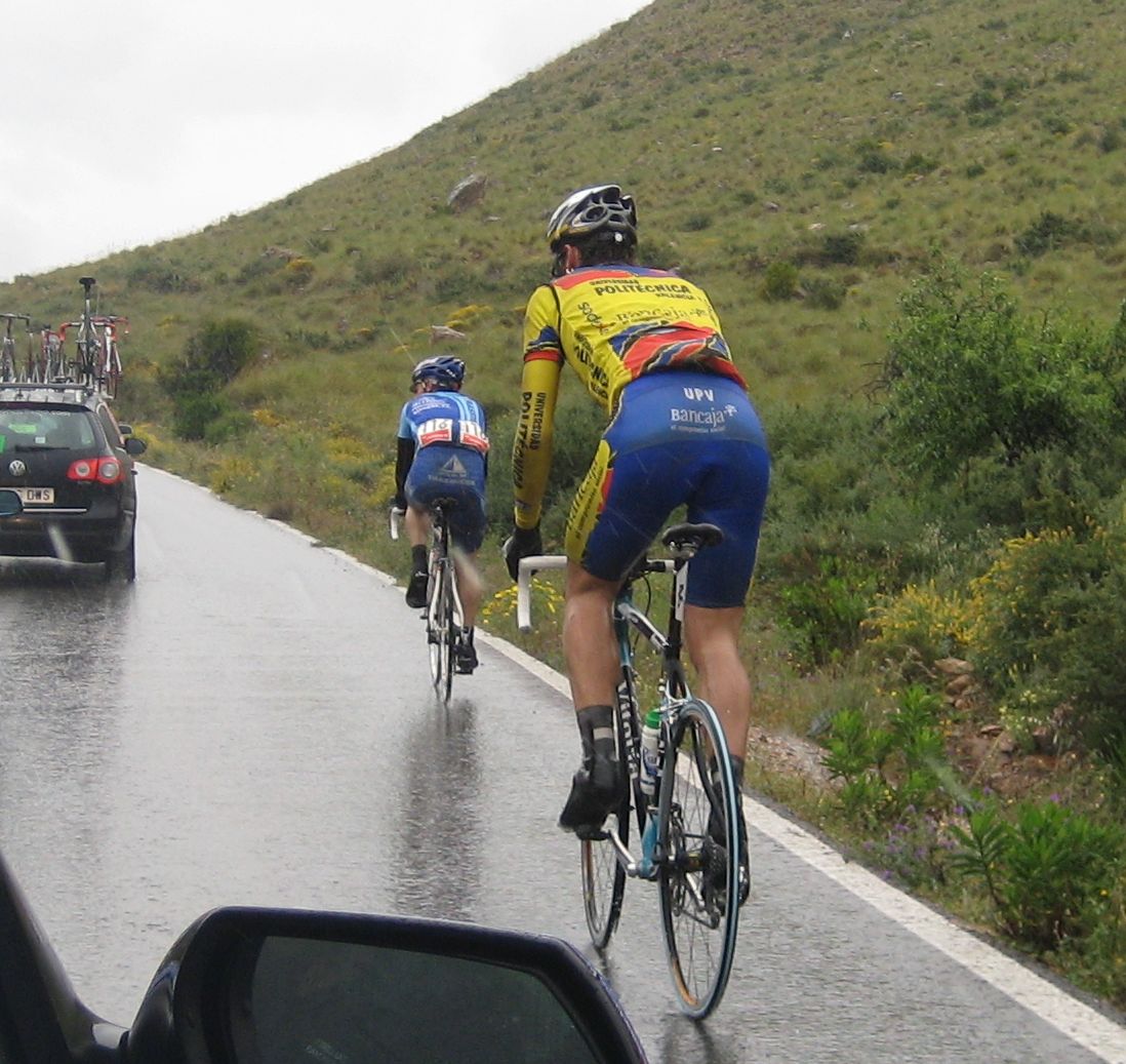 Asi pues, nos tuvimos que conformar con quedarnos a rueda en el pelotón, bajo el ritmo de los CNN Valencia, subiendo Cedacero por el lado tendido, tan tendido que el lider Torrella se paró a mear, con el consiguiente parón a favor de la escapada. Tuvimos suerte de que paró de llover, asi la bajada del Cedacero, rapidisima a 100 por hora, no dió tanto repelús.