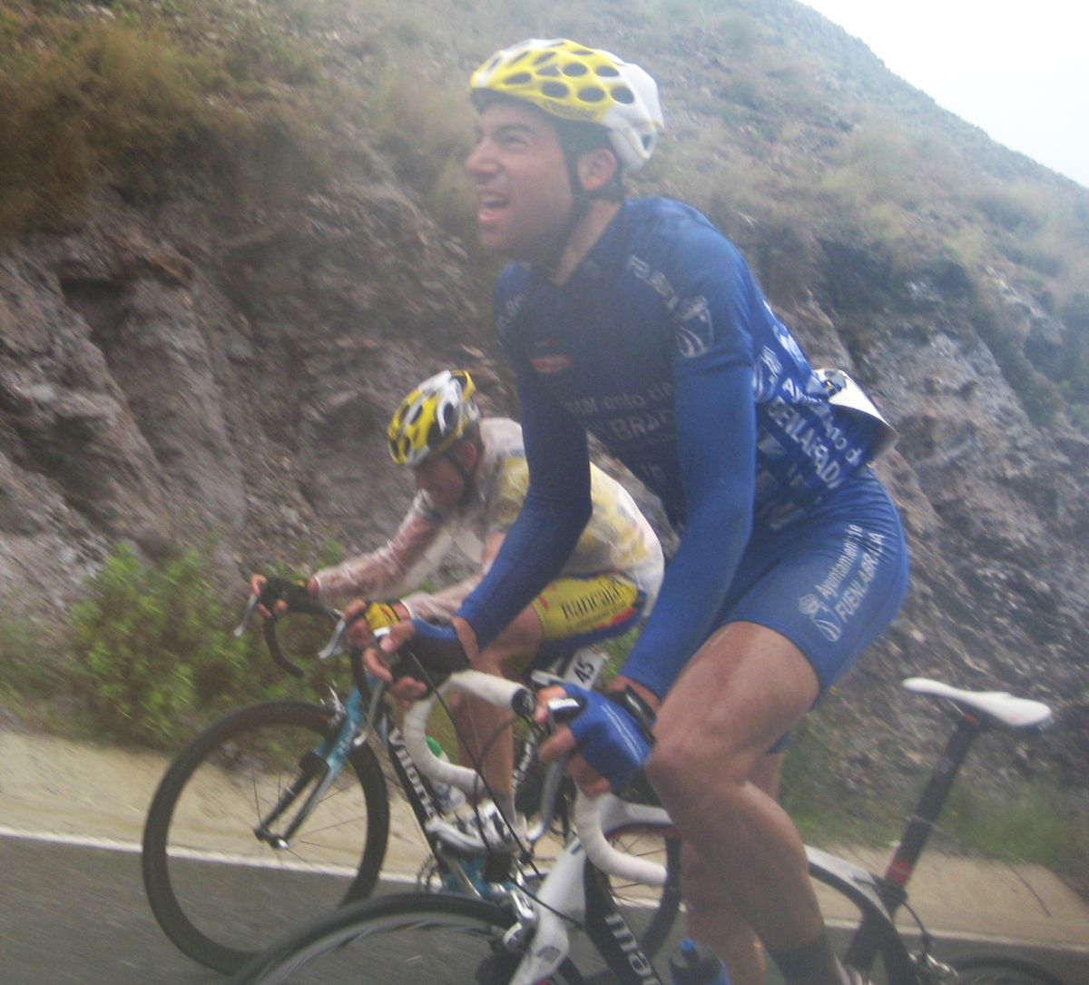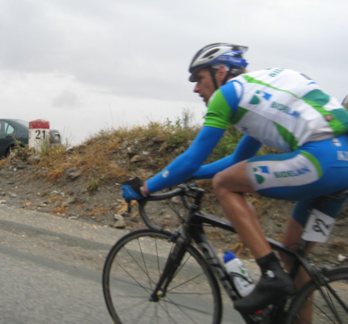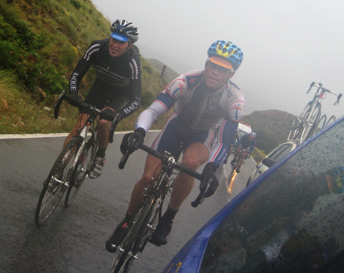 Giramos y aire de culo, ahí empezó mi crisis, mucha lluvia, el frio empezó a apoderarse de mi, a rueda tenia frio, no iba bien, deseando de llegar al puerto para calentar, el puerto de la Cuesta, se subió muy muy rápido, enfiladisimos, yo no iba mal, iba ahí en el látigo subiendo asqueado por mi ataque que me había quitado opciones, cuando coroné iba a meter el plato y no tenía fuerzas en las manos, que miseria.. y bajando no frenaba la bici, bajé hecho un seto, me pasaron 30 tios bajando o mas, todos los que se quedaron subiendo me pasaron bajando, iba temblando de frio en las curvas, se me iba la bici, que horror, fue de golpe, el frio me cogió de golpe.
