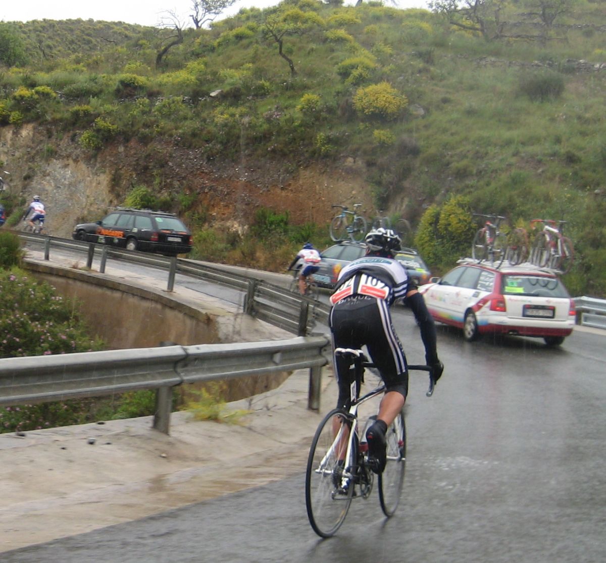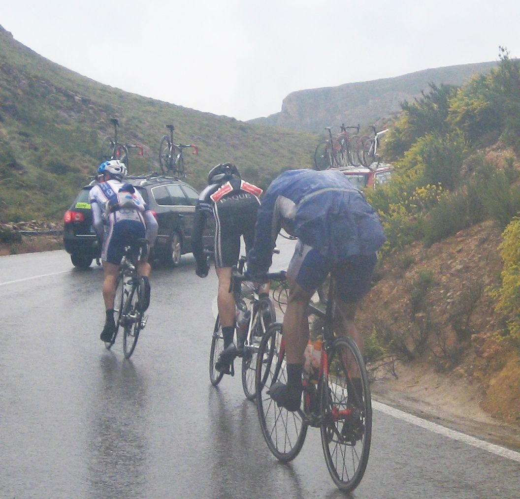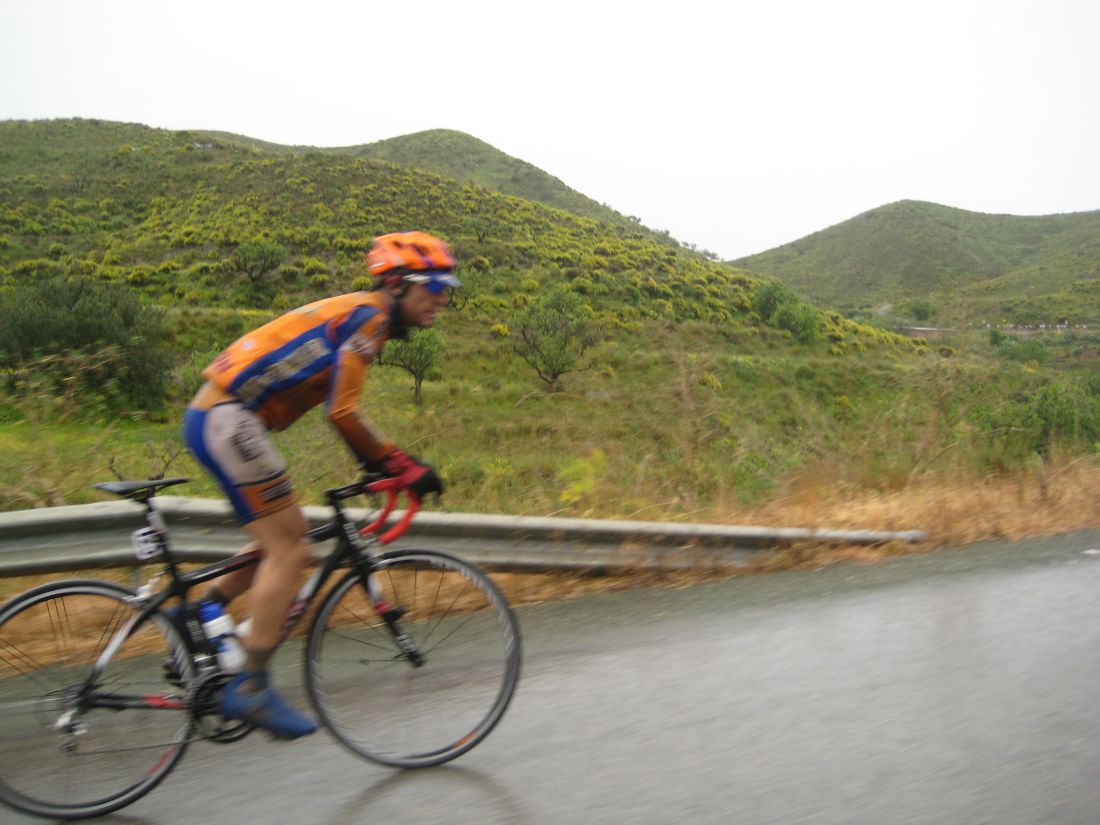 Menos mal que aparecieron esos 3 hombres, el Belda tirando para arriba quitandome el aire, coroné lo que quedaba de puerto y arriba tenía que ir a tope para coger calor, menos mal que era una bajada de dar pedales, me puse a to lo que daba, a 50 por hora, los demas no me cogieron rueda, me supo bastante mal no esperarles pero no podía ir despacio, tuve que ir apretando a tope los 15 kms que quedaban hasta meta, rodando por ahí no iba tan mal, por fin crucé meta, perdi 13 minutos en 20 kms, cuando me dijo Jose que fuera al hotel en bici.. ahí si que me retiré, pero no ves lo malo que estoy!! me metí al coche y hasta que no me duché en el hotel no me puse bien, quien ha ganao con este día?? El Cebolla! Que ídolo. Al día siguiente dejó de llover y subío 10 grados la temperatura.