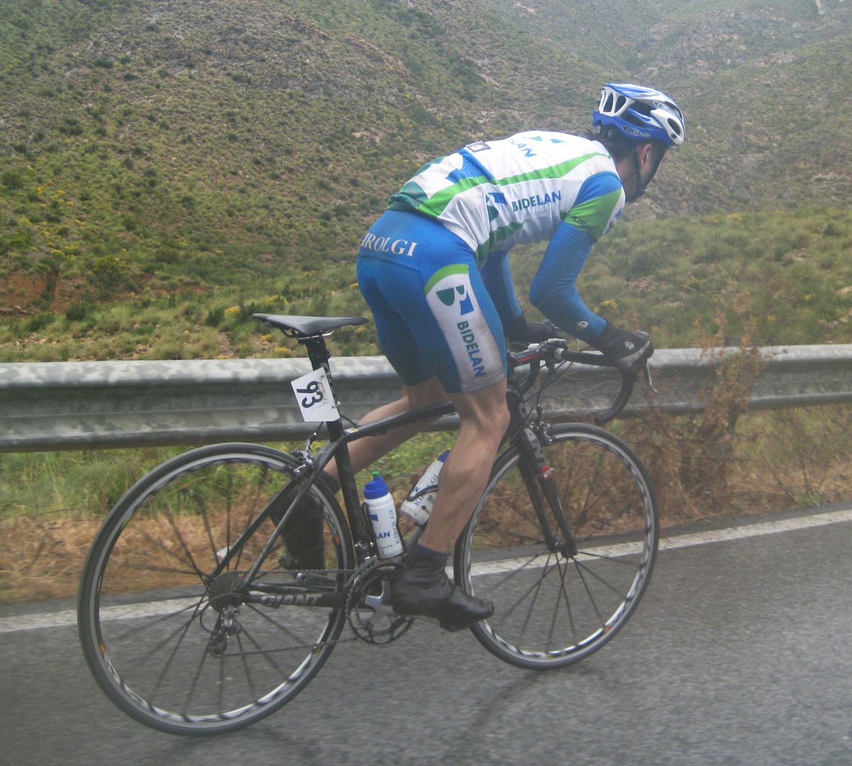 Digo joder que malo voy, esto no puede ser, me he quedado pajarito total, esto como ha sido, en Beasain hacía mas frio y llovía mas fuerte pero allí iba mejor, claro también iba mas preparado de ropa. Iba todo hundido por un pueblo antes del Cedacero cuando la unica persona que se veia en la calle dijo - Retiraté ya!! Primero te dan ganas de pararte y decirle 4 cosas, luego mi espiritu de contrariedad me animó a no retirarme, me dió fuerzas para seguir apretando, acordandome del tio ese que me decía que me retirara, llegué al inicio del cedacero, y mortal, allí vi al Peque y a otro parados con el chubasquero encima.