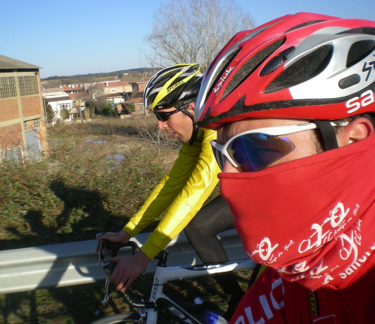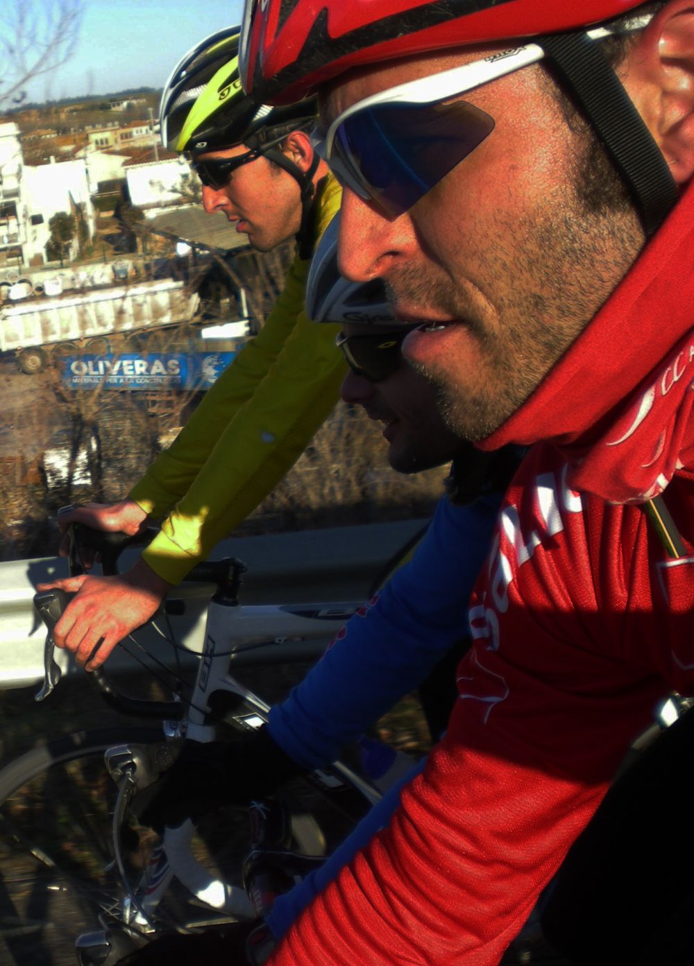 Primer plano de Xavi, lateral, donde podemos ver tres ciclistas en paralelo, uno en medio escondido.