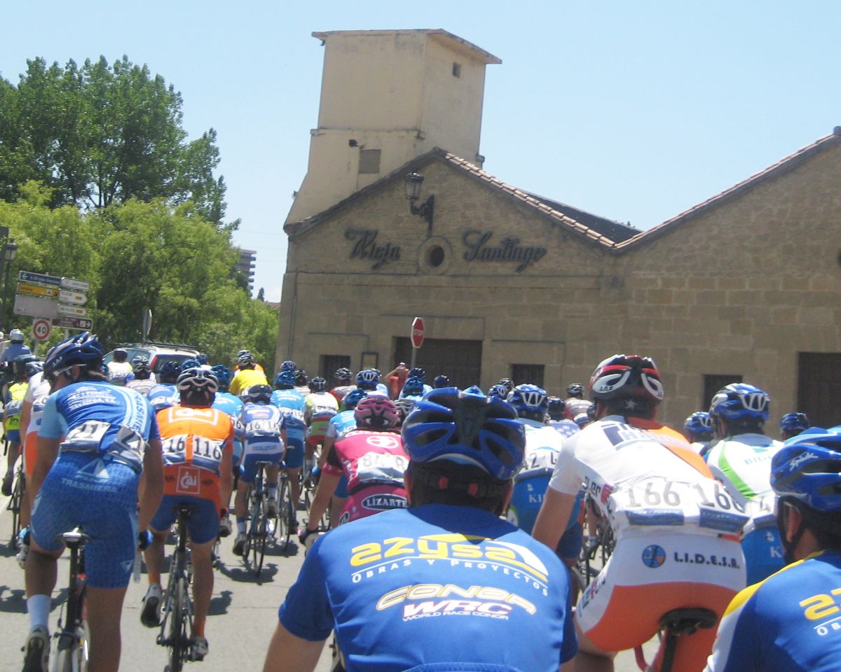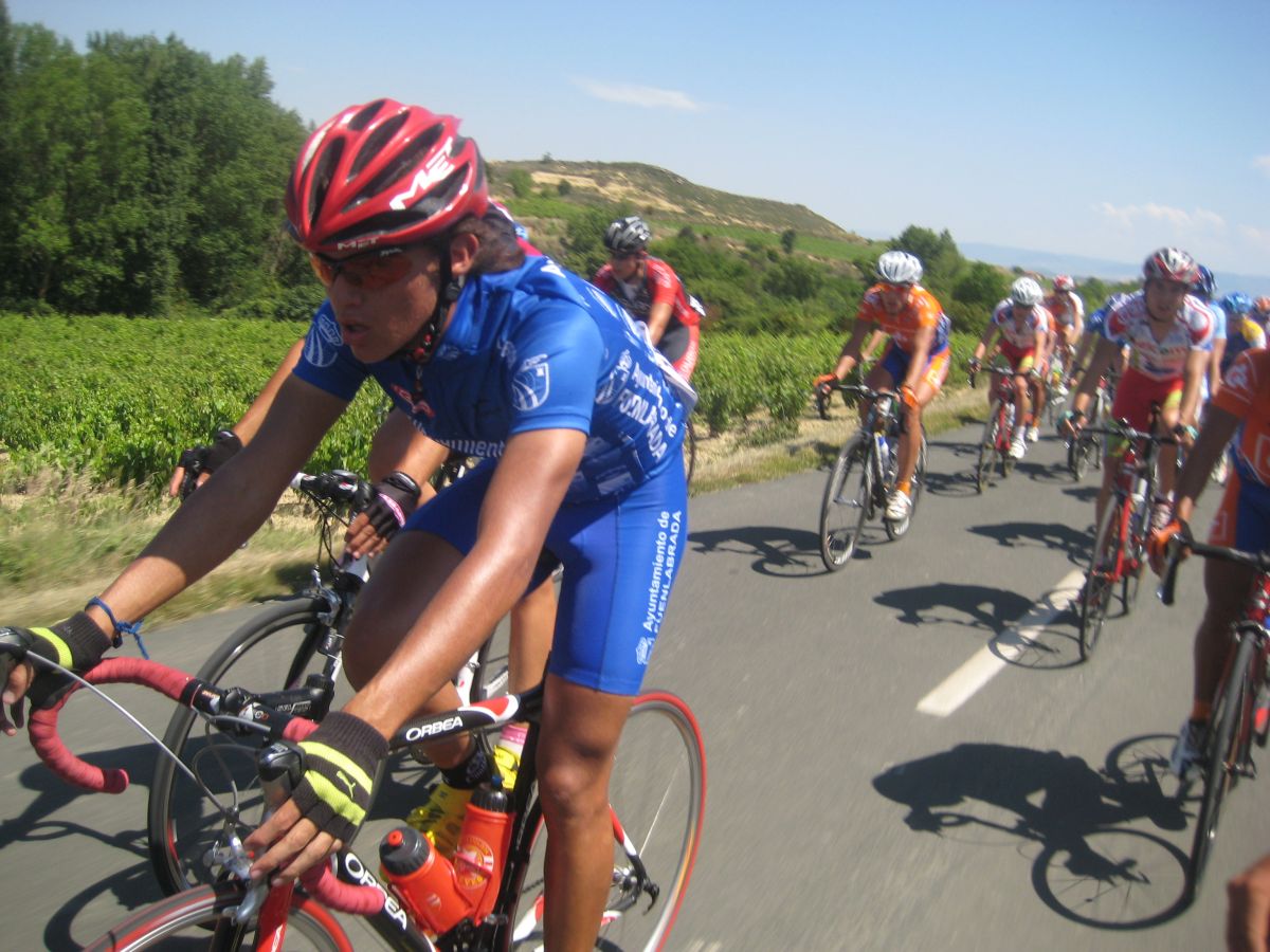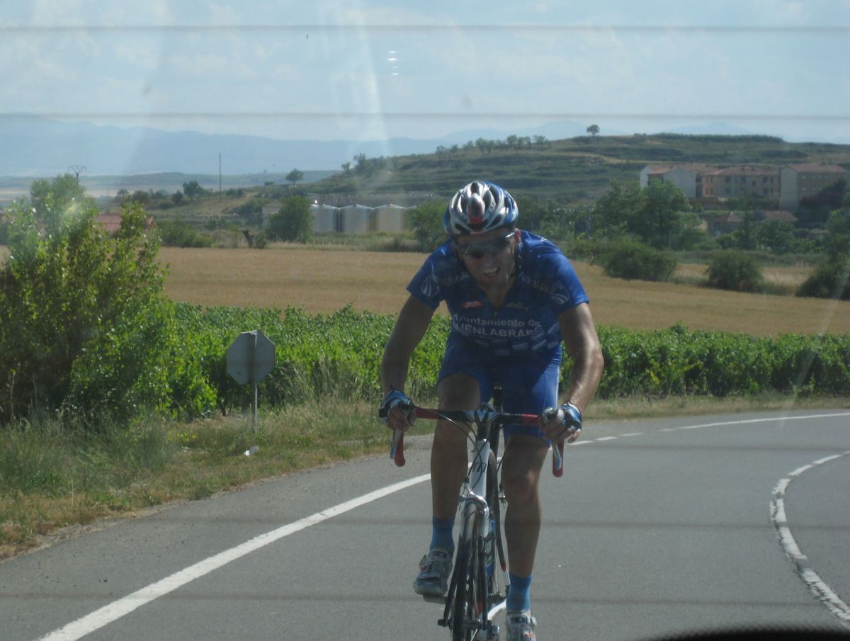 Espere a gustavo y yo solo tirando cogi a 2 Lerda Habitages que se habían quedado, hasta que entró por detrás el bicho Zugasti, venía el solo to follao, les había soltado a todos subiendo Paracuellos y pedía colaboración, Ey Diego ayudame que viene el lider ese del Seguros Bilbao a por mi, que me tiene vigilaoo!! Yo que no podía ni dar pedales en esa bici sentao aun le di un par de relevos pero en un puente que había al paso por las Bodegas Viña Tondonia el bicho me abrió alli que me quedé to espatarrao, eso si, me quede solo, los demas se habían abierto antes.