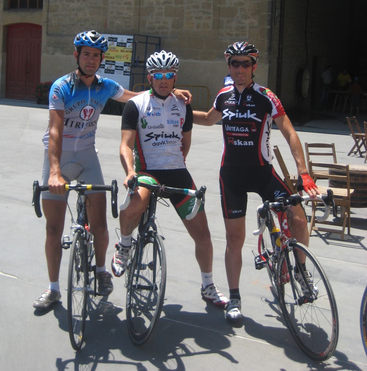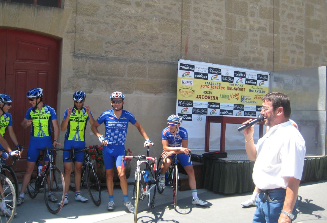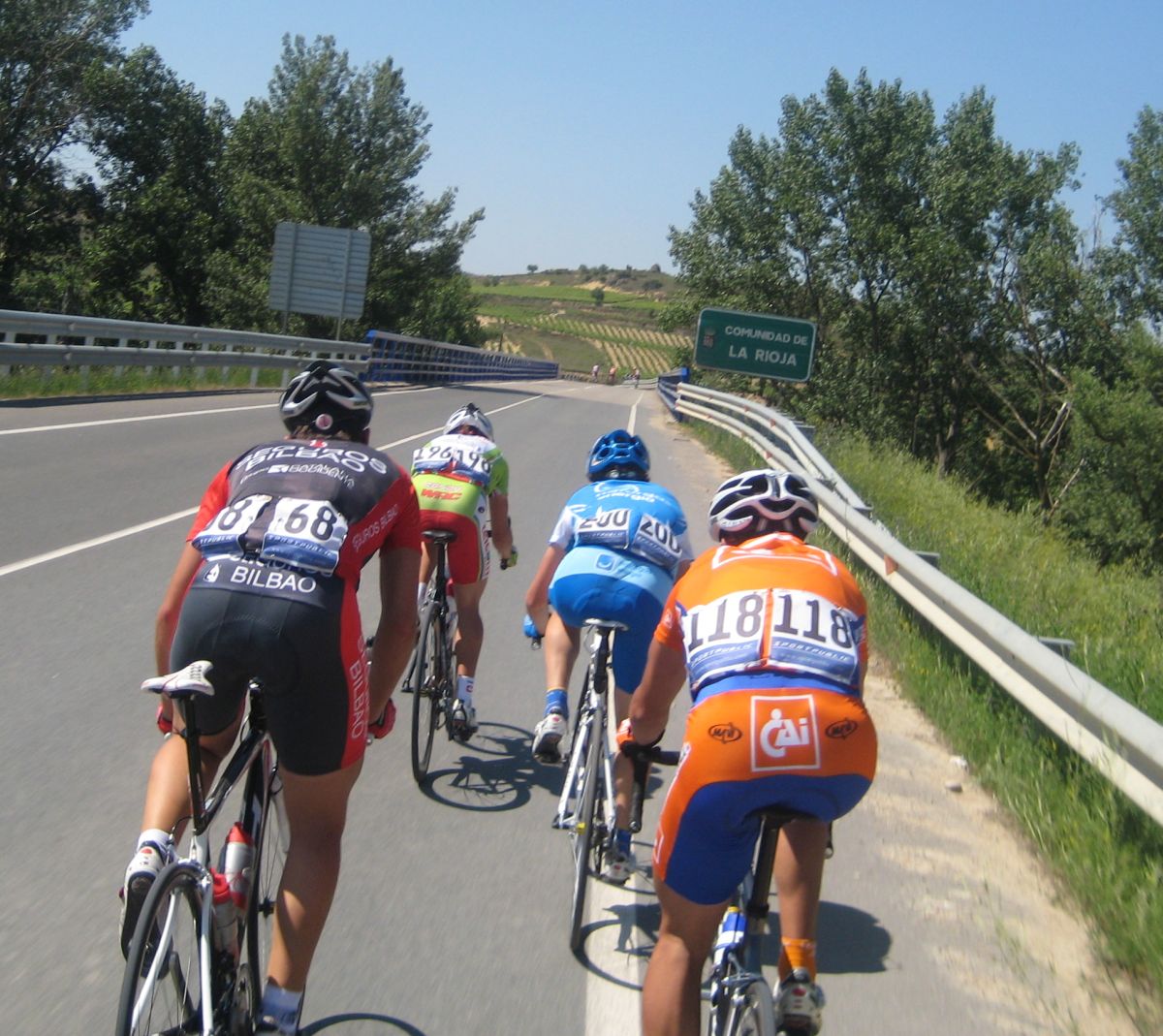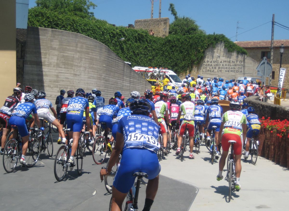 Espere a gustavo y yo solo tirando cogi a 2 Lerda Habitages que se habían quedado, hasta que entró por detrás el bicho Zugasti, venía el solo to follao, les había soltado a todos subiendo Paracuellos y pedía colaboración, Ey Diego ayudame que viene el lider ese del Seguros Bilbao a por mi, que me tiene vigilaoo!! Yo que no podía ni dar pedales en esa bici sentao aun le di un par de relevos pero en un puente que había al paso por las Bodegas Viña Tondonia el bicho me abrió alli que me quedé to espatarrao, eso si, me quede solo, los demas se habían abierto antes.