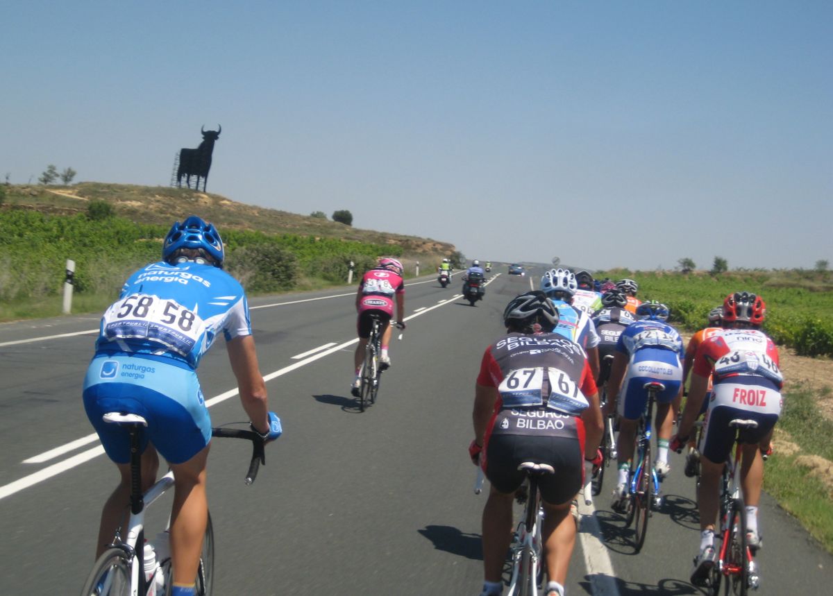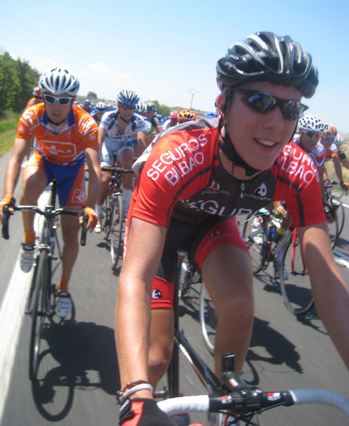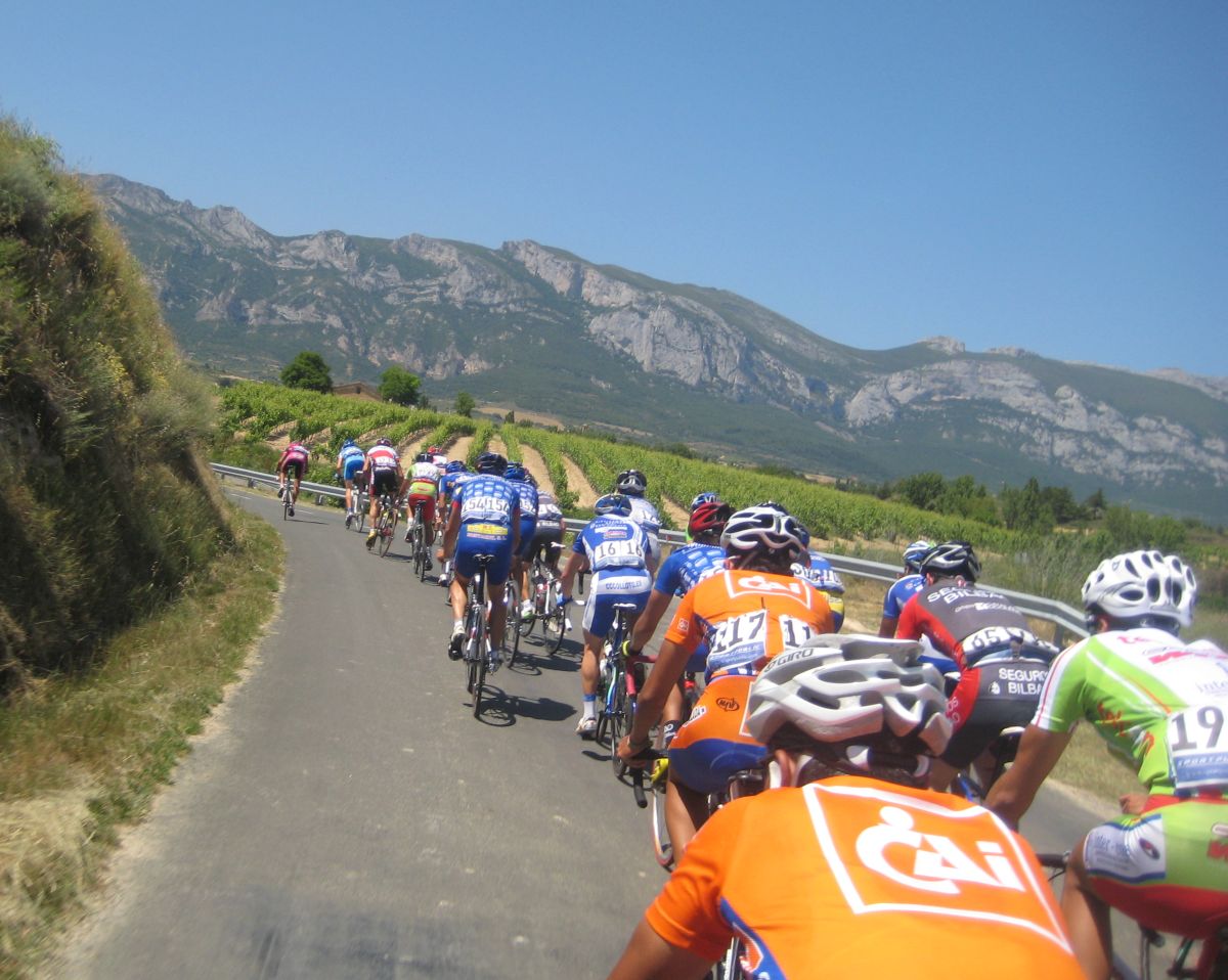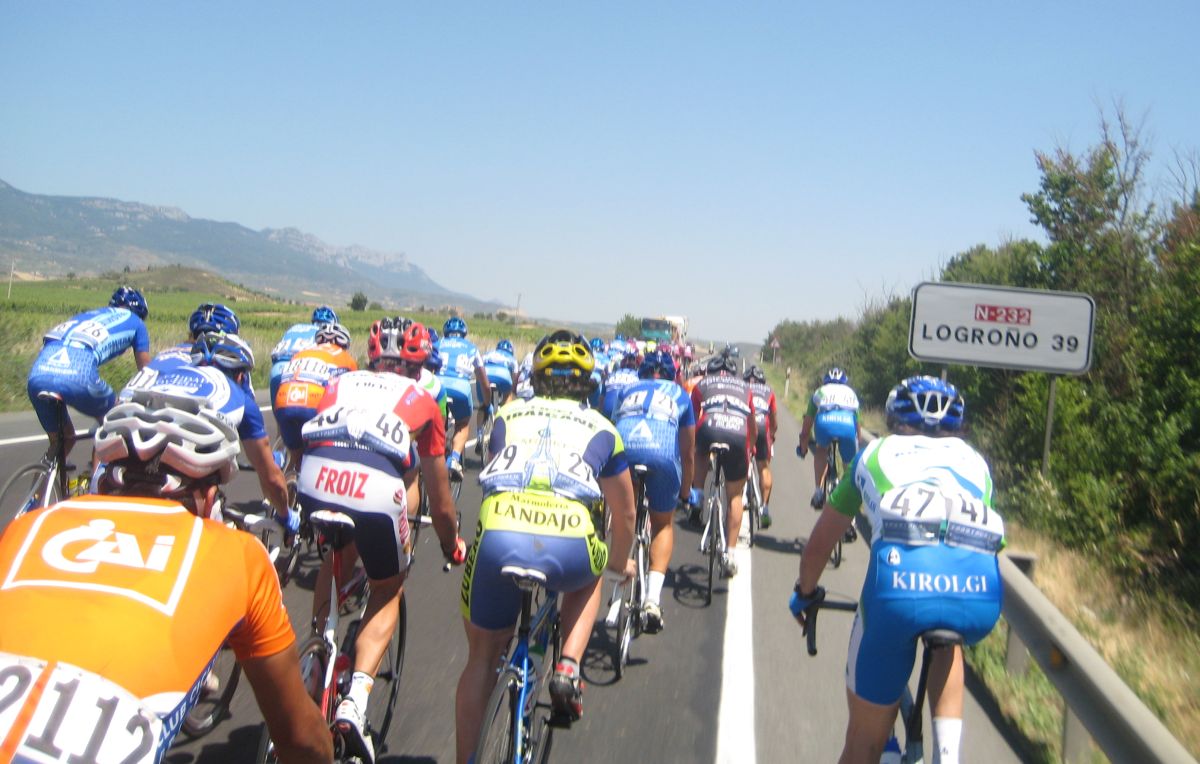 Menos mal que habíamos metido a Almeida, por detrás en el pelotón se puso a controlar el Seguros Bilbao para el lider de la copa Iberica Domenech. Yo me metí en un corte bajando para Haro pero en una glorieta nos confundieron a los que ibamos tirando y del corte pasé a cola de pelotón to cabreado. A rueda del Tren de Seguros Bilbao hasta que giramos a una carretera mala muy bacheada, alli pararon y empezó a arrancar la gente,