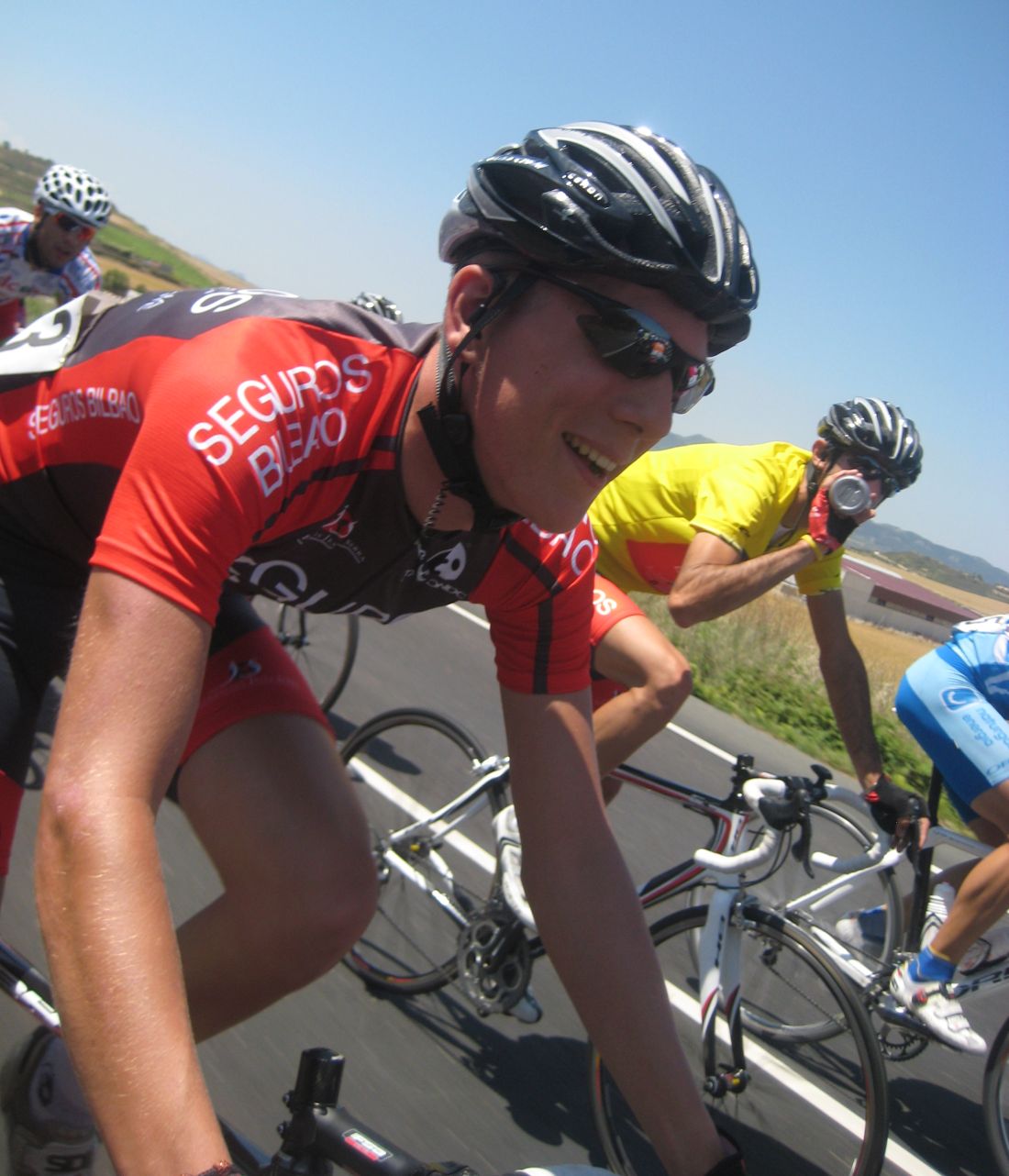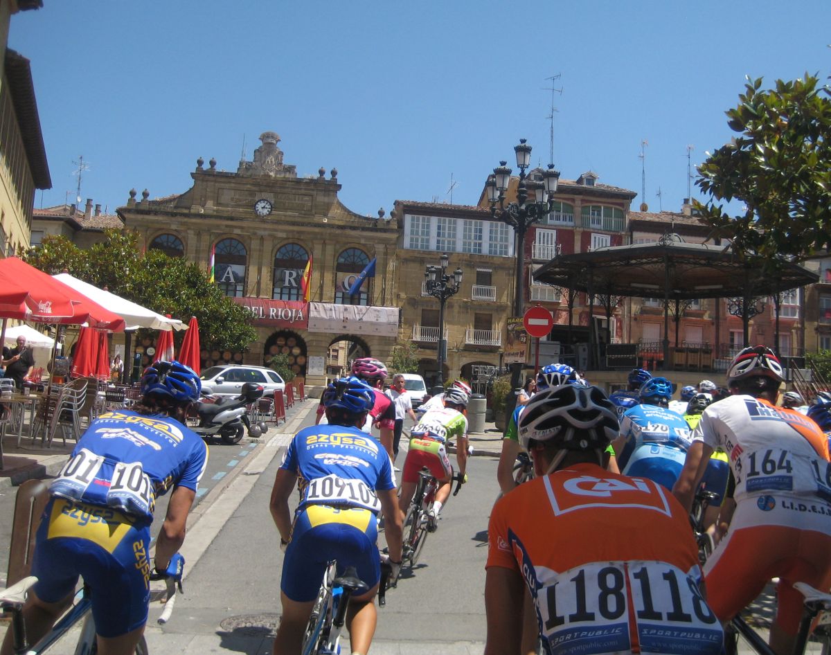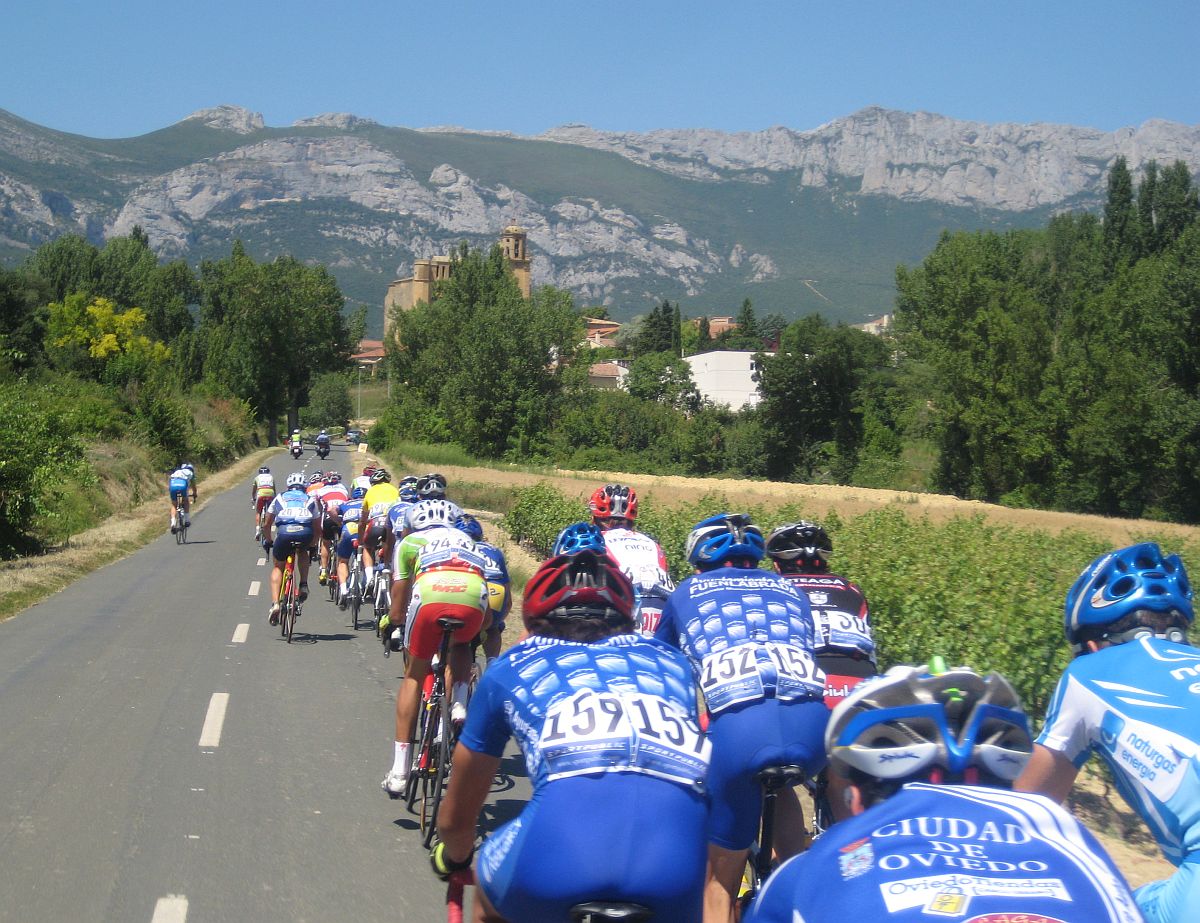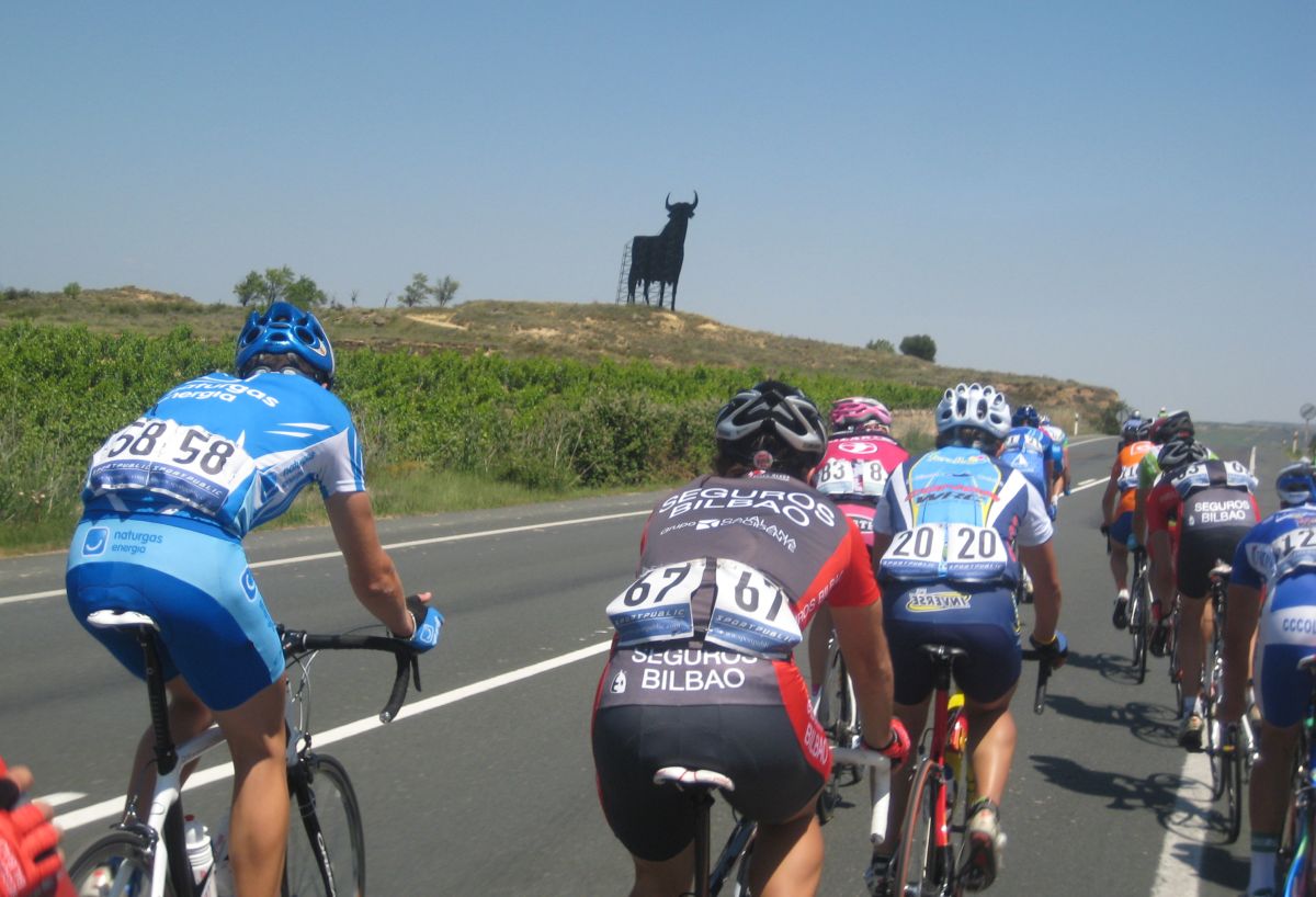 Menos mal que habíamos metido a Almeida, por detrás en el pelotón se puso a controlar el Seguros Bilbao para el lider de la copa Iberica Domenech. Yo me metí en un corte bajando para Haro pero en una glorieta nos confundieron a los que ibamos tirando y del corte pasé a cola de pelotón to cabreado. A rueda del Tren de Seguros Bilbao hasta que giramos a una carretera mala muy bacheada, alli pararon y empezó a arrancar la gente,