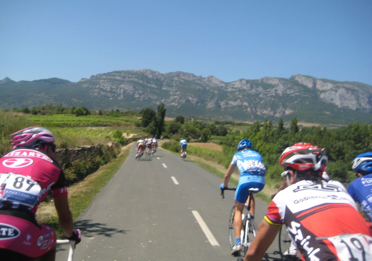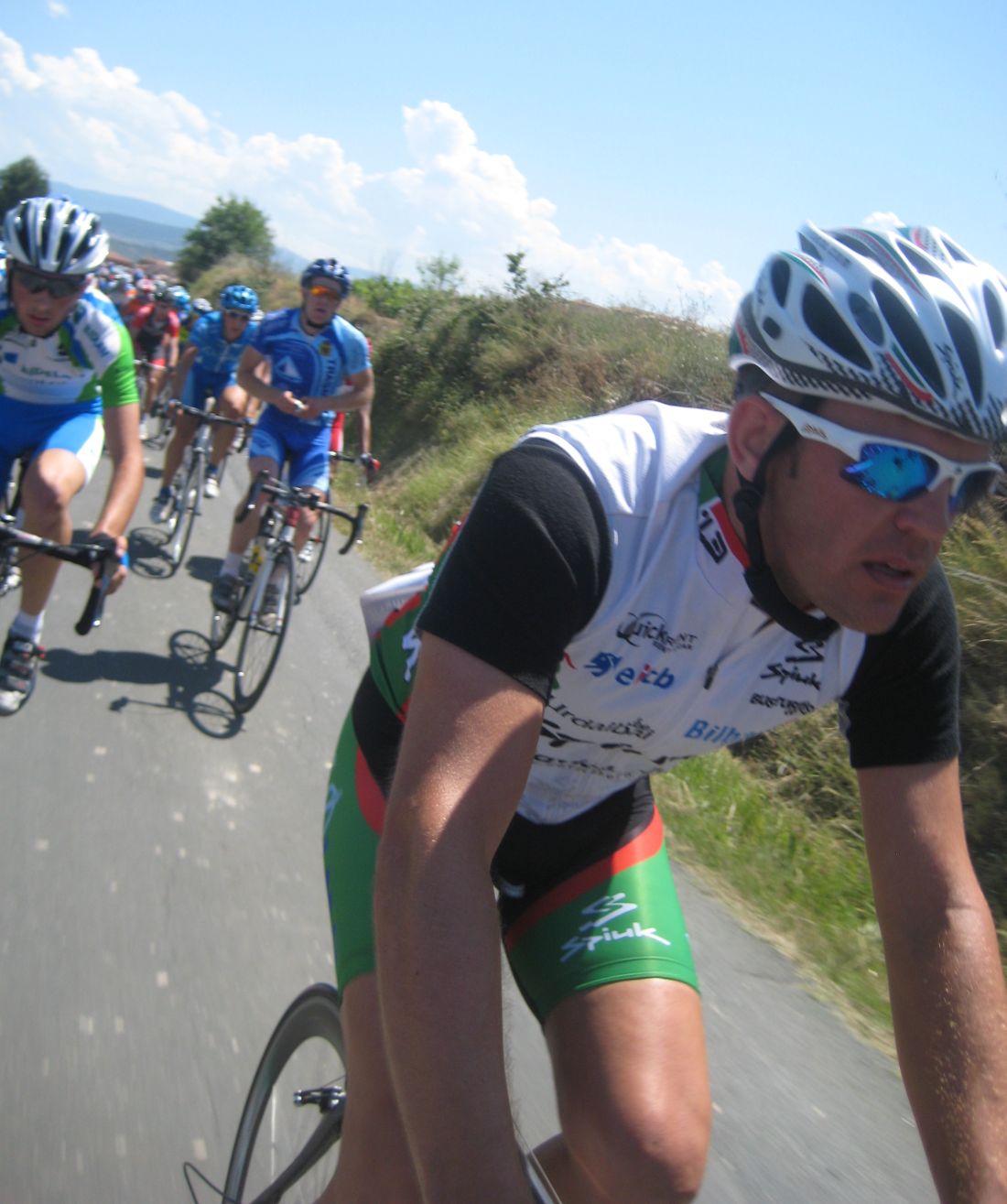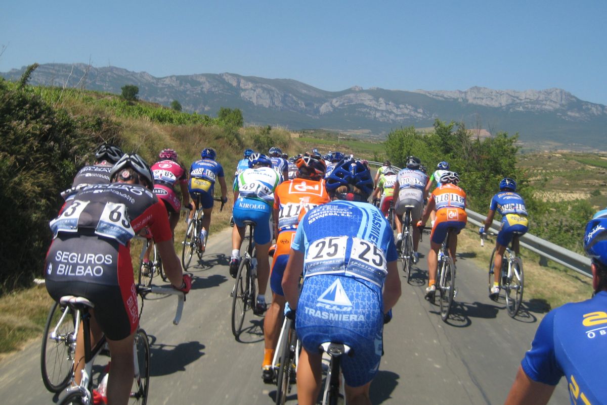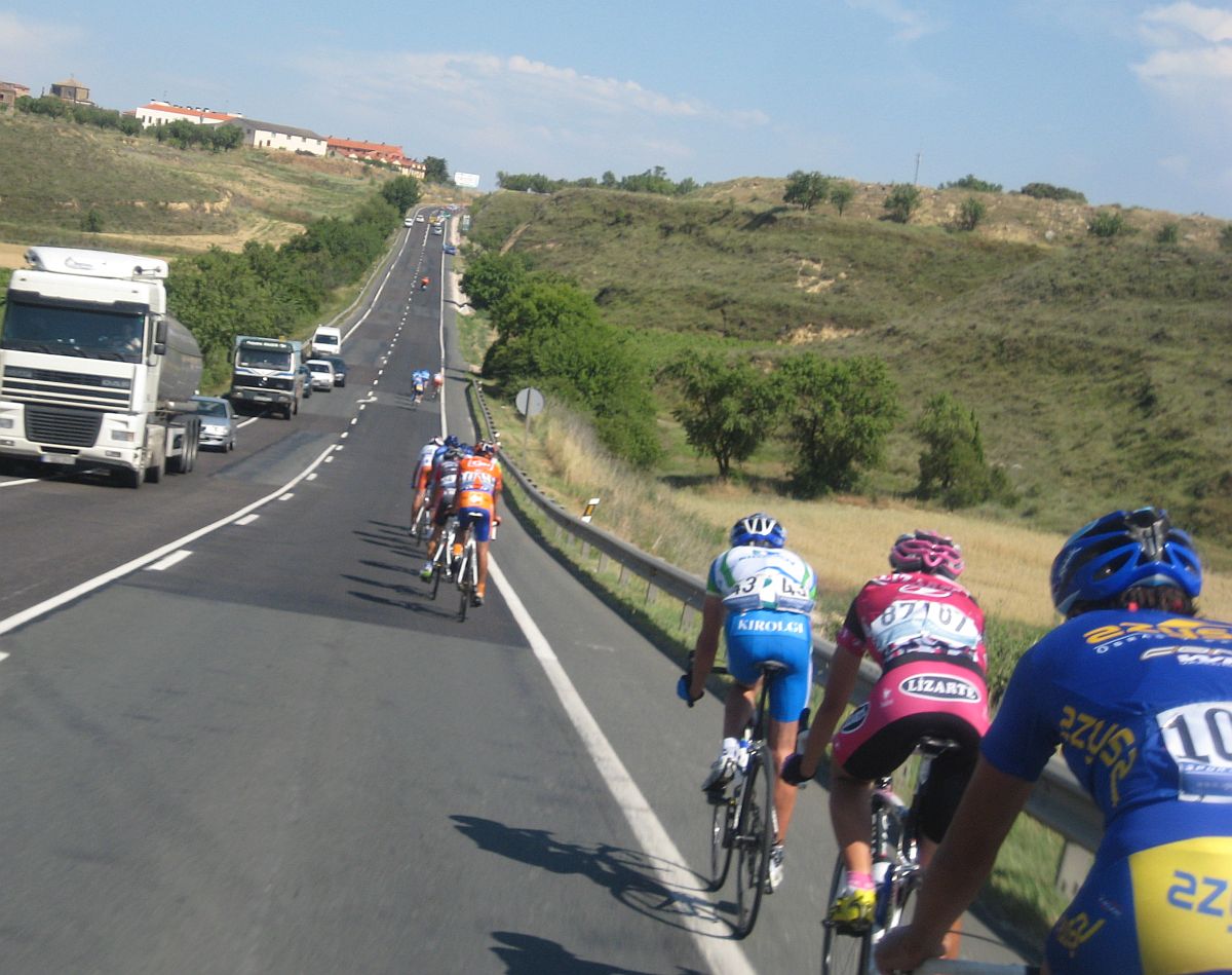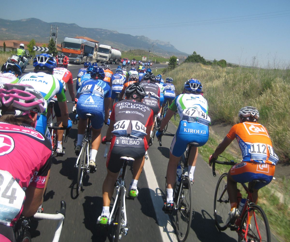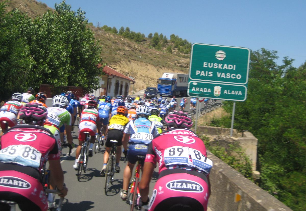 Primeros kms blandos, se iba muy deprisa y viendo el percal era mejor quedarse en la oficina mandando e-mails y enviando faxes esperando a que la gente madurara, cambiamos de carretera, cruzamos el Ebro, entramos en Euskadi y alli empezo a ascender la carretera, no iba mal pero iba jodido de la digestion de lo bien que habiamos comido alli en Haro solo un par de horas antes, no podía moverme del pelotón, demasiado lujo para mi, yo con un bocadillo de membrillo y jamon york ya voy listo para correr.