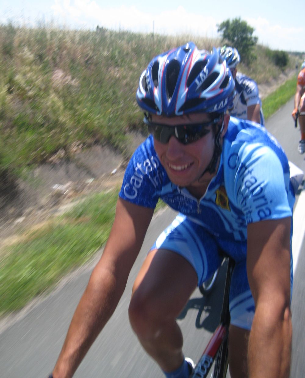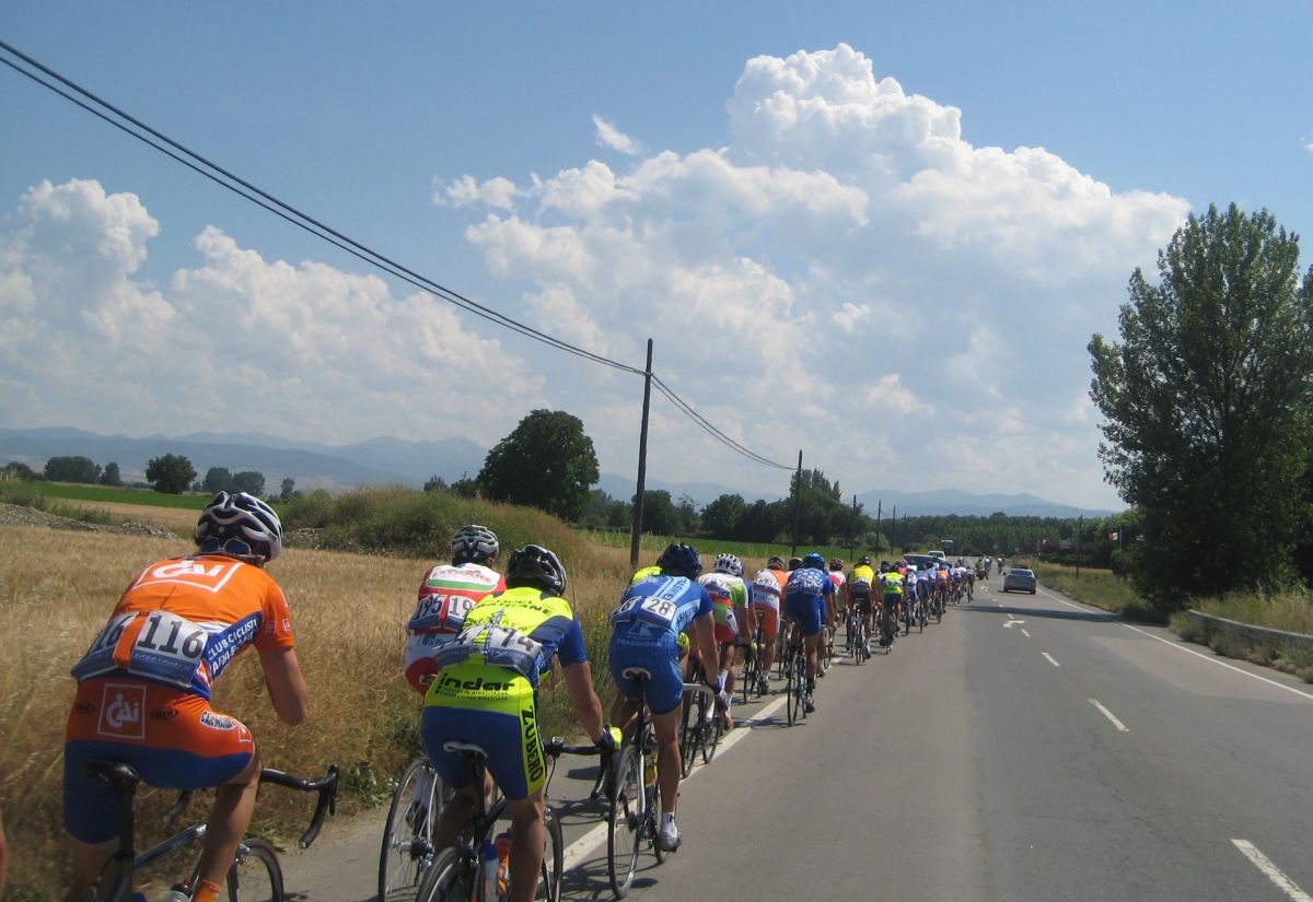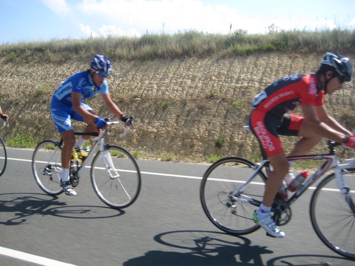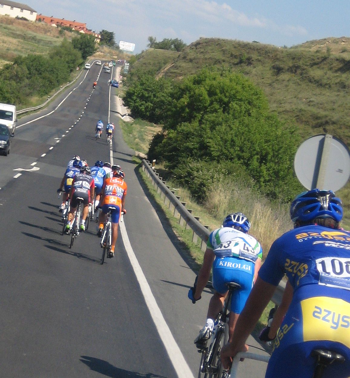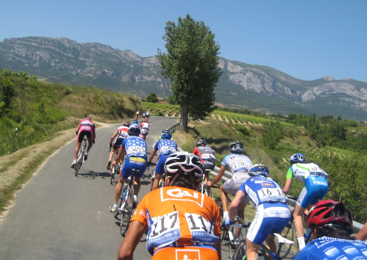 Primeros kms blandos, se iba muy deprisa y viendo el percal era mejor quedarse en la oficina mandando e-mails y enviando faxes esperando a que la gente madurara, cambiamos de carretera, cruzamos el Ebro, entramos en Euskadi y alli empezo a ascender la carretera, no iba mal pero iba jodido de la digestion de lo bien que habiamos comido alli en Haro solo un par de horas antes, no podía moverme del pelotón, demasiado lujo para mi, yo con un bocadillo de membrillo y jamon york ya voy listo para correr.