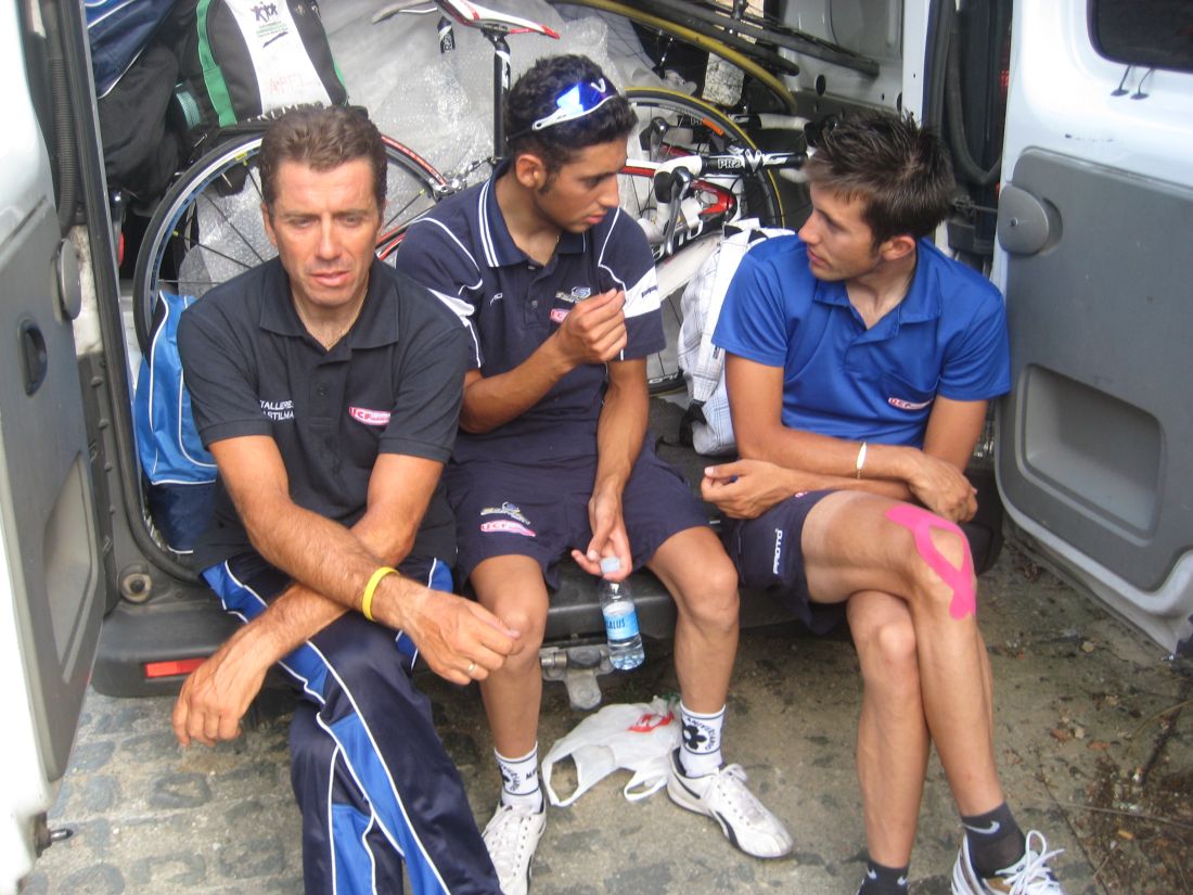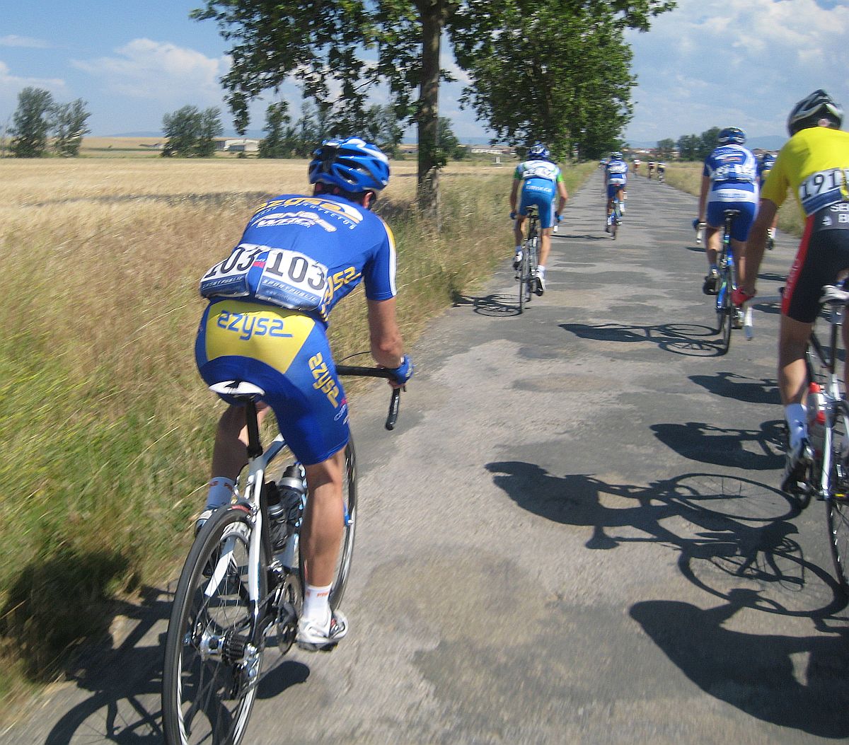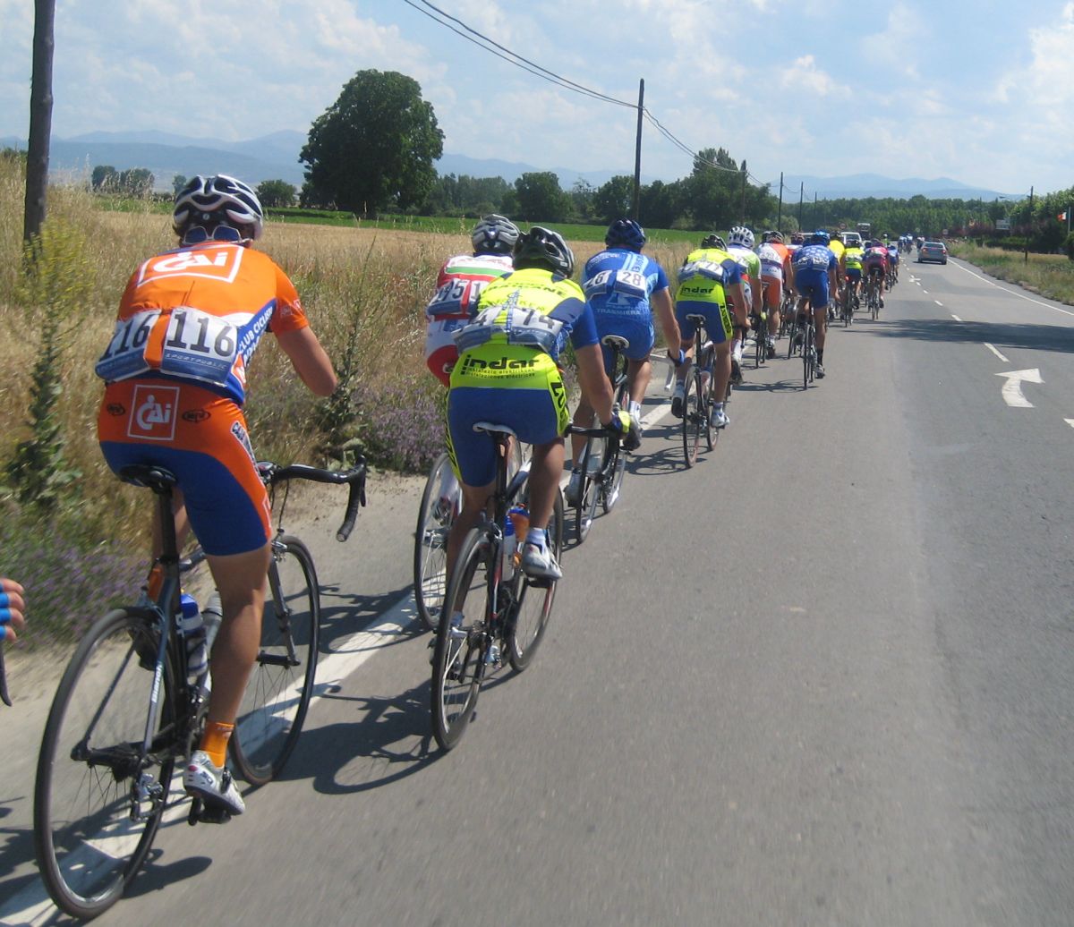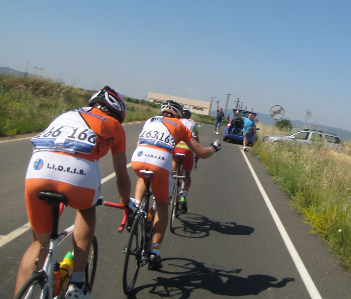No había demasiado orden en el grupo, un Azysa atacó y al salir por el tuve que cambiar bruscamente, y tuve una mítica avería, el cable del cambio roto y la cadena directa al 11, piñón fijo, le dije al coche mi avería y me prepararon la bici de Angel Mayordomo, que se había caido en los primeros kms.