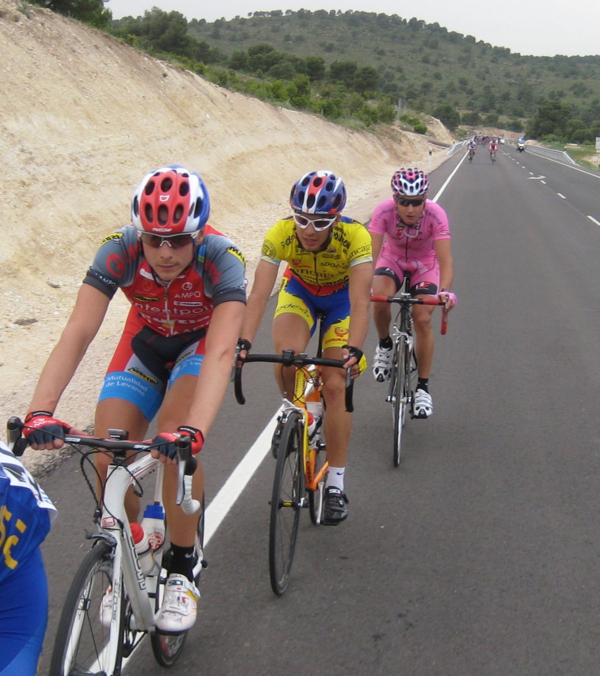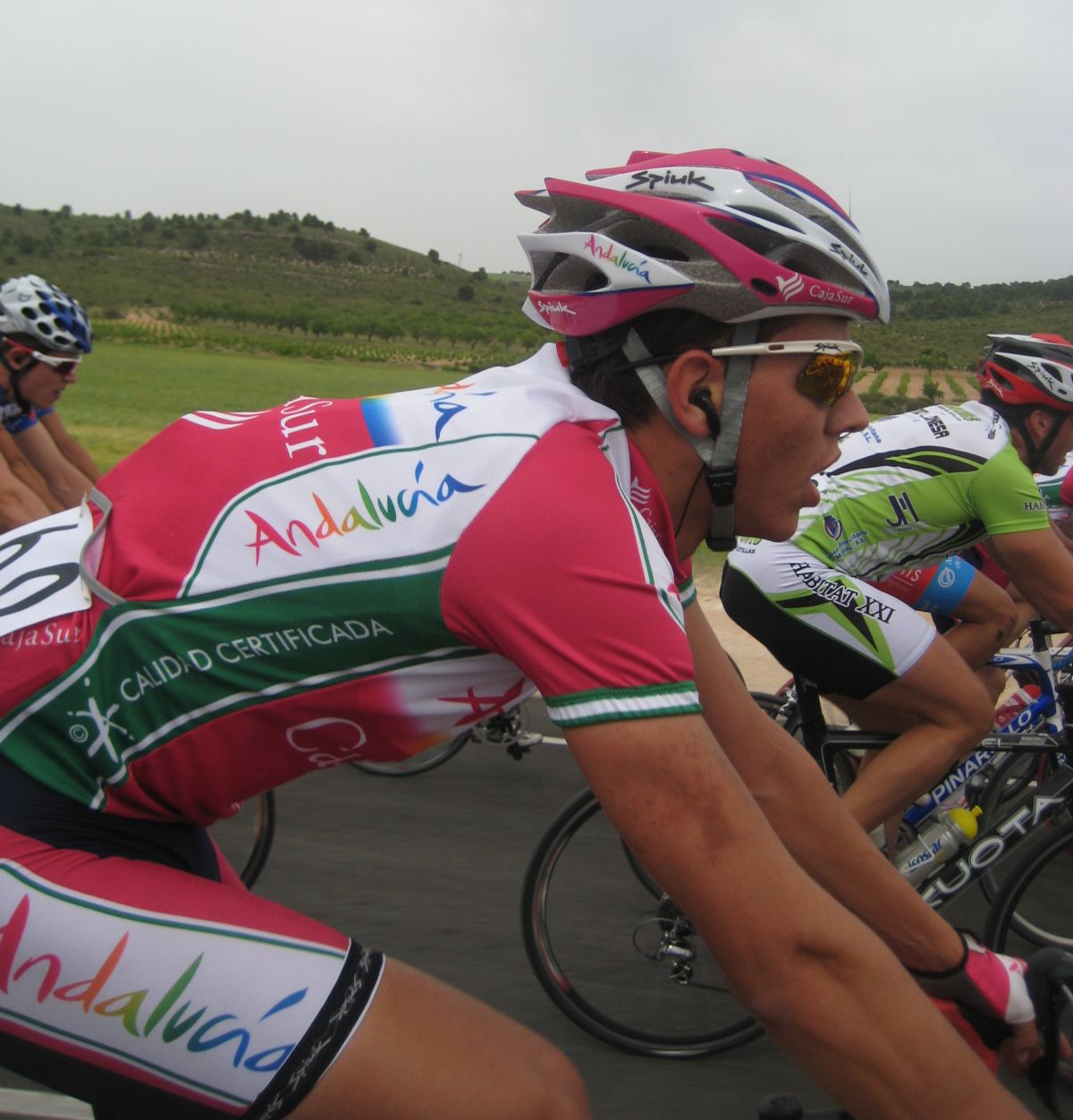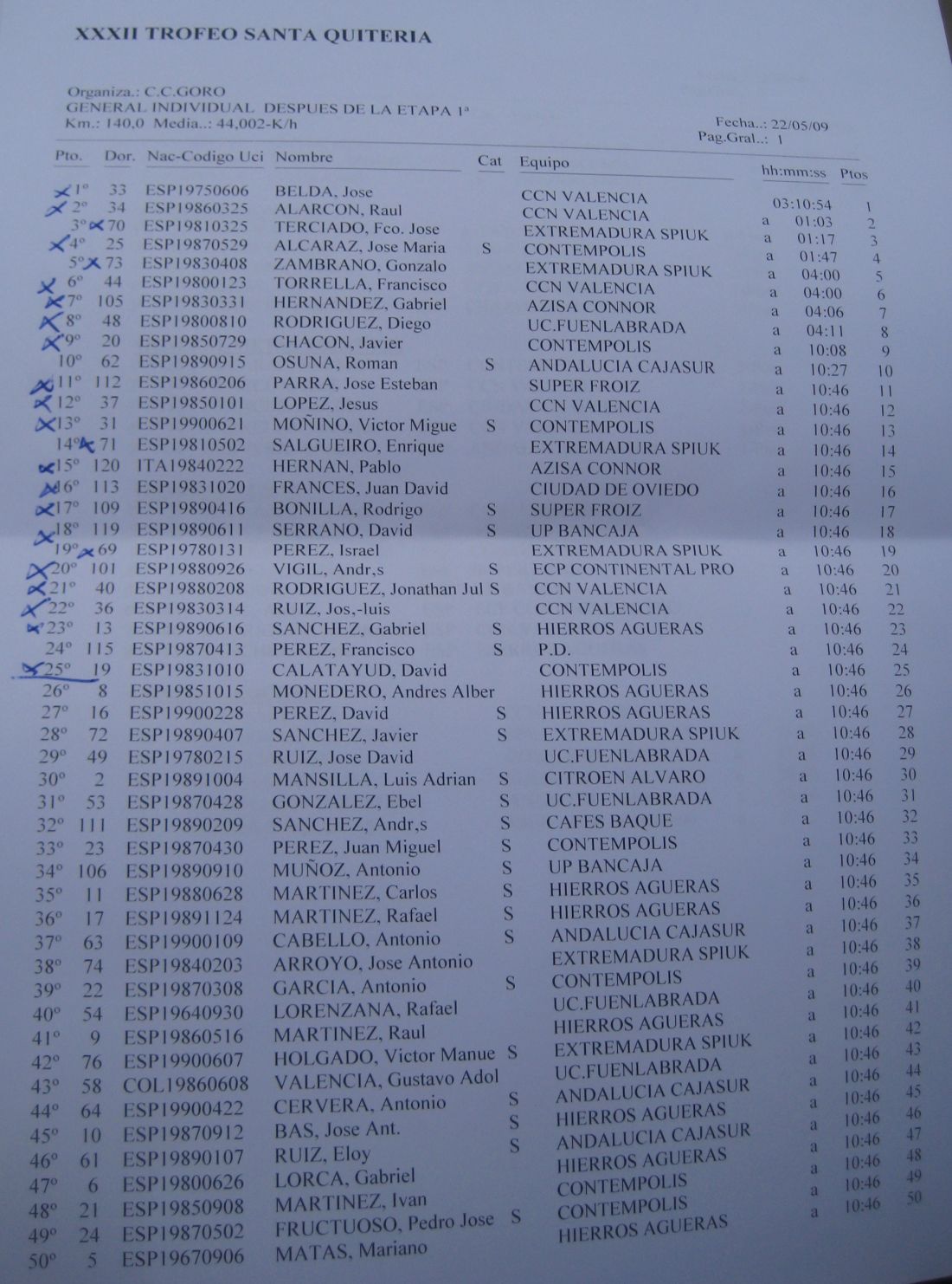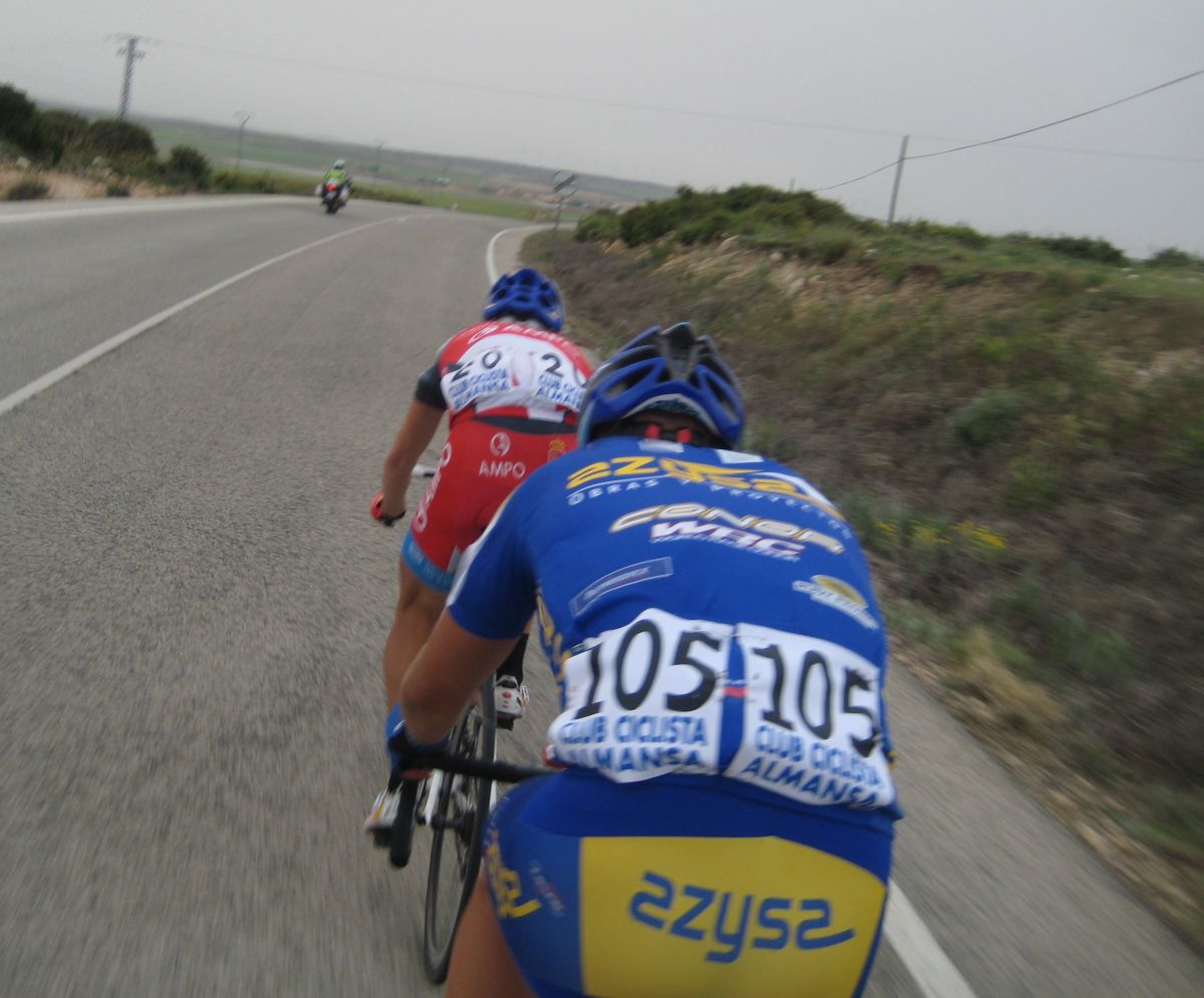 Yo iba solo del equipo asi que me metí a rueda hasta que empezaron los ataques en el puerto, los Extremadura y Comunidad eran mayoría, al final se acabaron marchando por delante Torrella, Belda, Zambrano, Terciado y Alcaraz, por detrás controlaban sus compañeros y les toco tirar a los 2 chicos de Cajasur que iban, Roman Osuna y Cervera, coronando arrancó Chacón y salí por el, luego atacó Gabi y al final nos acabamos marchando en el páramo con aire, Chacón, gabi y yo.