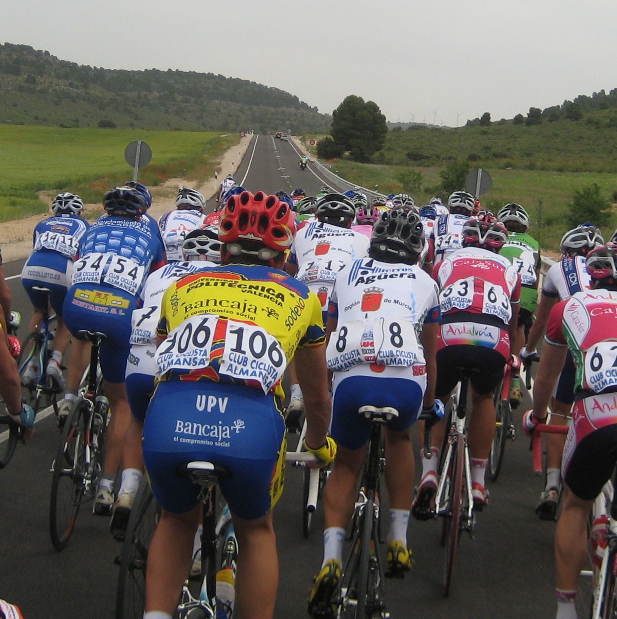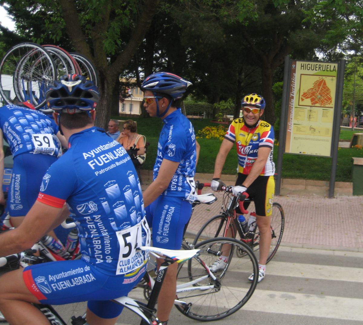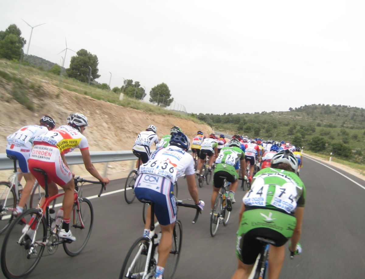 Yo anduve muy cauto, le tengo mucho respeto a esta carrera y no quise gastar fuerzas arrancando por que luego en cualquier encunetamiento si has gastado vas al palco fácilmente, asi que anduve escondido en la madriguera viendo el percal, se iba a mil por hora de salida, subiendo los molinos de pito, arriba a 70 por hora con el aire de culo, luego el descenso con la carretera nueva arreglada, una gozadisima ir por alli bajando a 80 por hora en el pelotón, eso era disfrutar de la velocidad de la bicicleta de carretera, asi nos tirabamos los 180 kms contentos, pero cuidadin con una caida a esas velocidades.