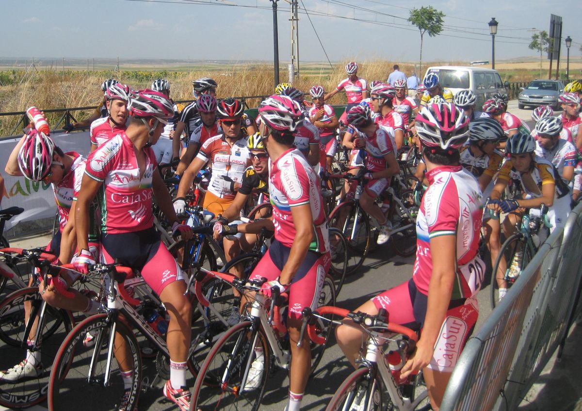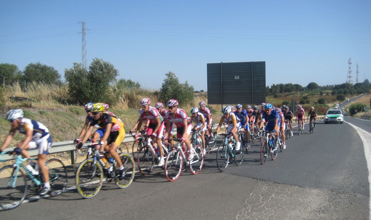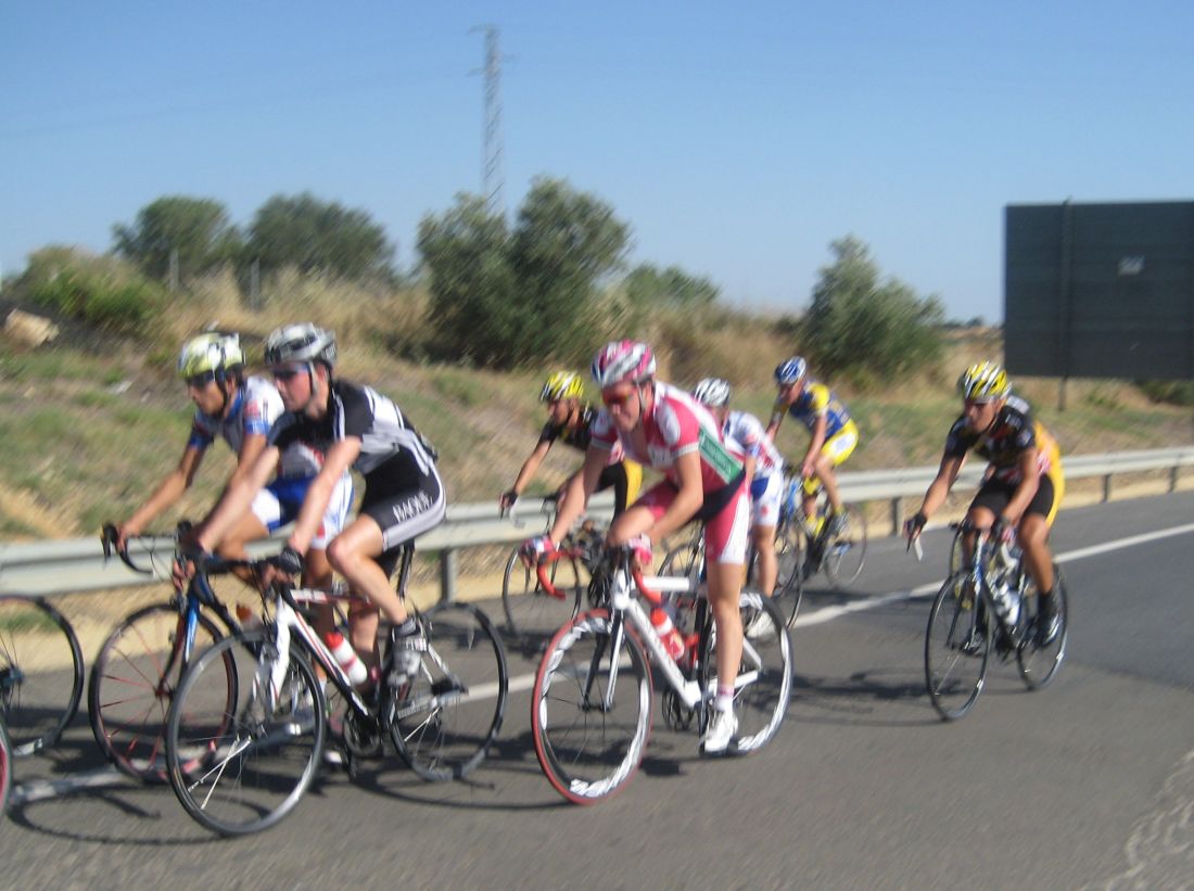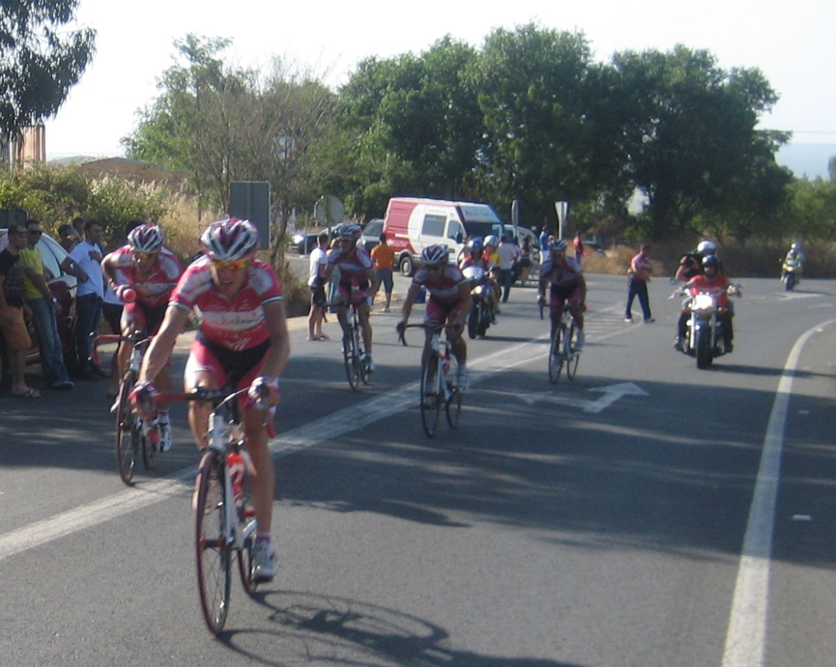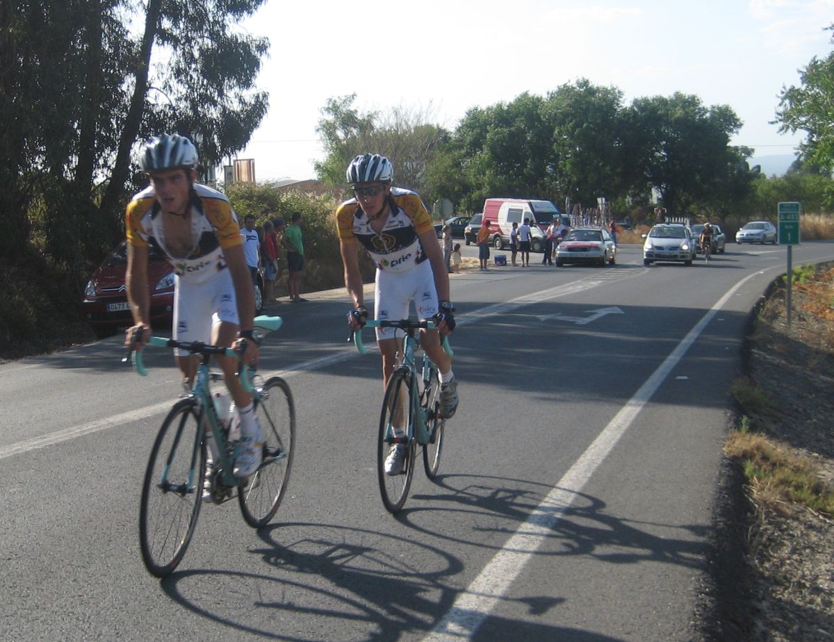 La salida enfiladisimos a mil por hora con todo el calor con los Cajasur arrancando y la gente respondienod a tantas ofensivas como podían, saliendo de La Palma había una subida interesante, Trujillo y yo anduvimos controlando hasta coronar, de forma que arriba solo iba un Cajasur por delante.