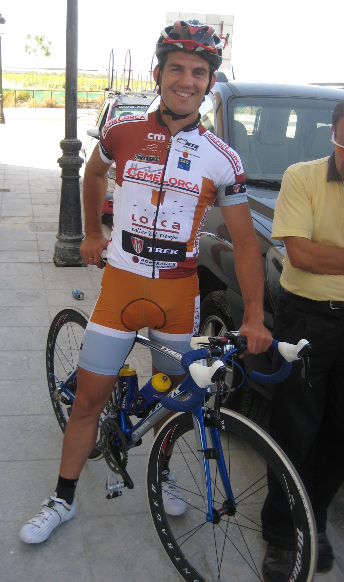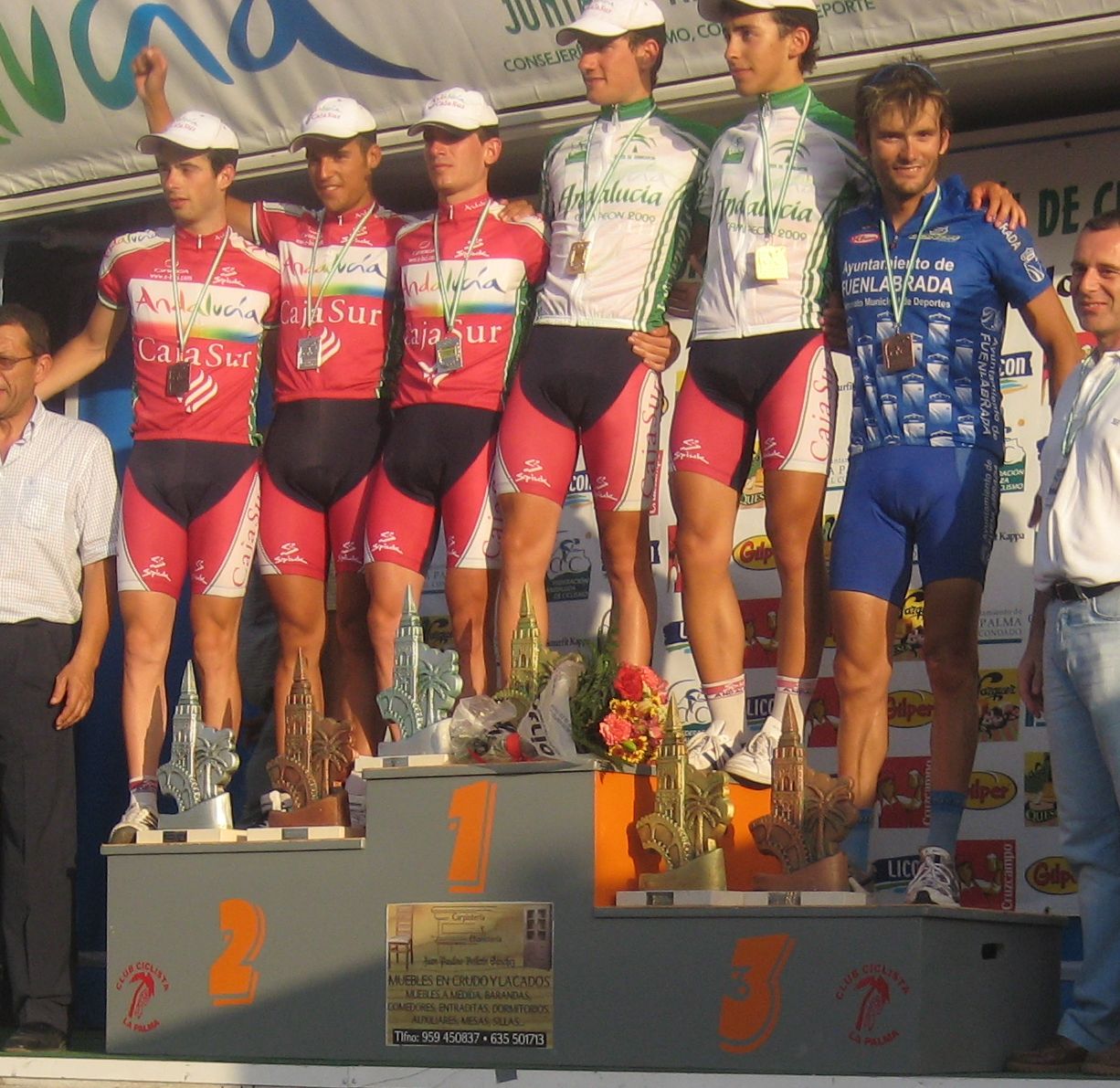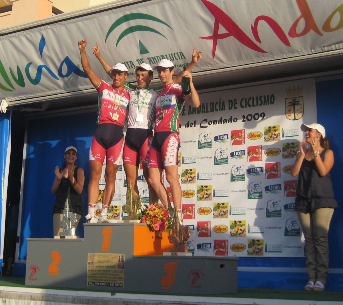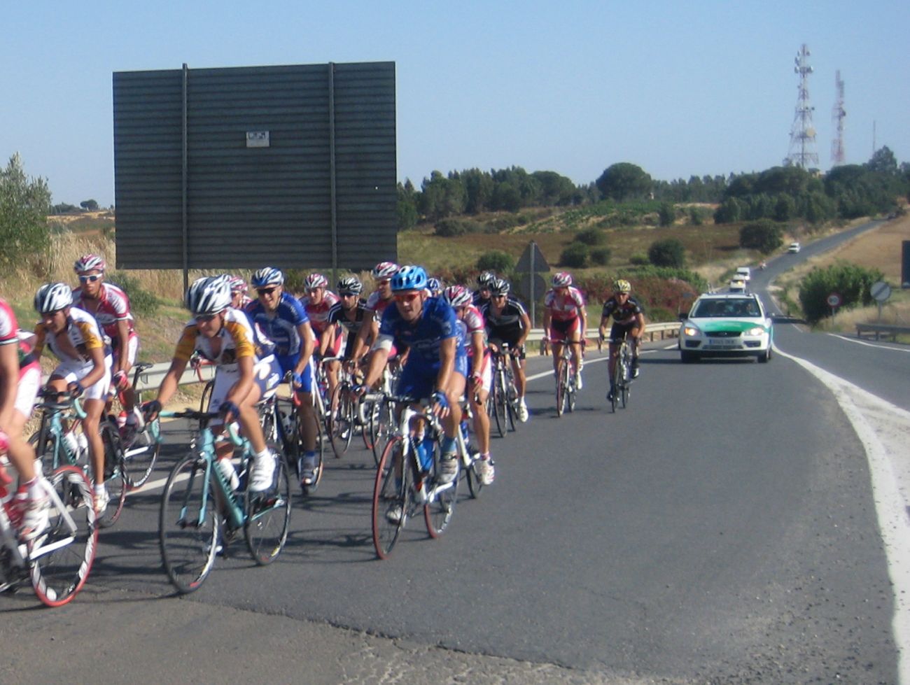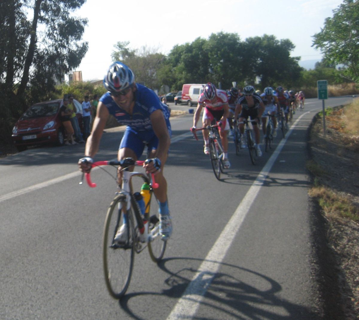 La salida enfiladisimos a mil por hora con todo el calor con los Cajasur arrancando y la gente respondienod a tantas ofensivas como podían, saliendo de La Palma había una subida interesante, Trujillo y yo anduvimos controlando hasta coronar, de forma que arriba solo iba un Cajasur por delante.