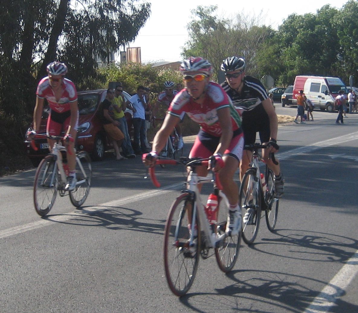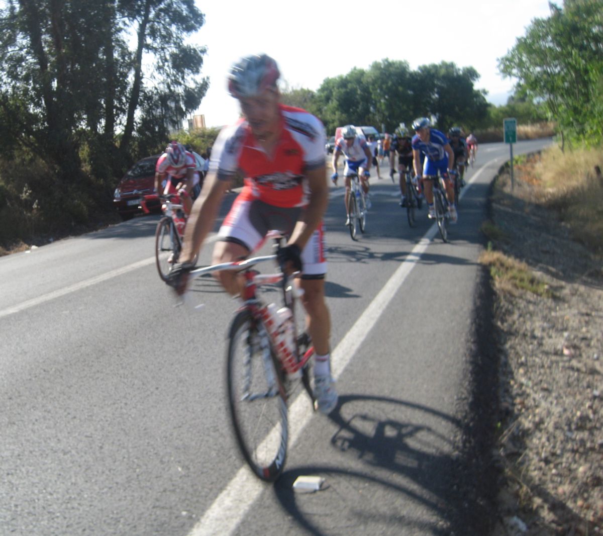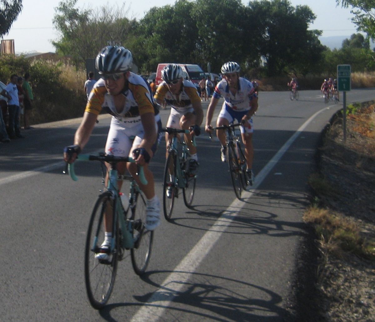 Bajando por Bollullos festival de ataques, Bollullos todavía me trae buenos recuerdos, la última carrera Elite-Sub23 que hicieron la gané yo en 2006 tras 70km escapado solo, en los tiempos de Edu Parras, Hidalgo, Rosendo.., desde aquella no había vuelto a pasar por ese pueblo tan mítico de carreras, hace mas años hacían 2 al año, ahora ya ninguna.