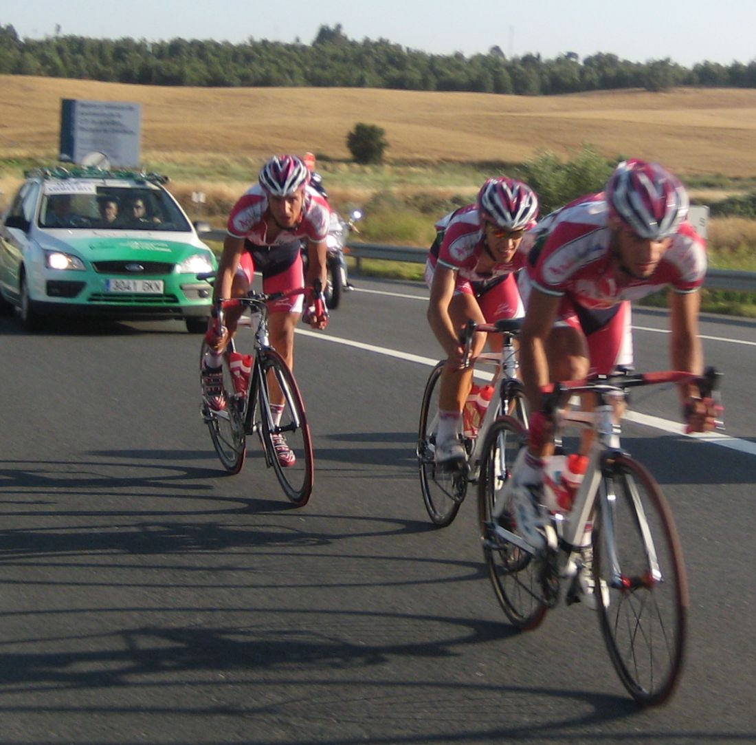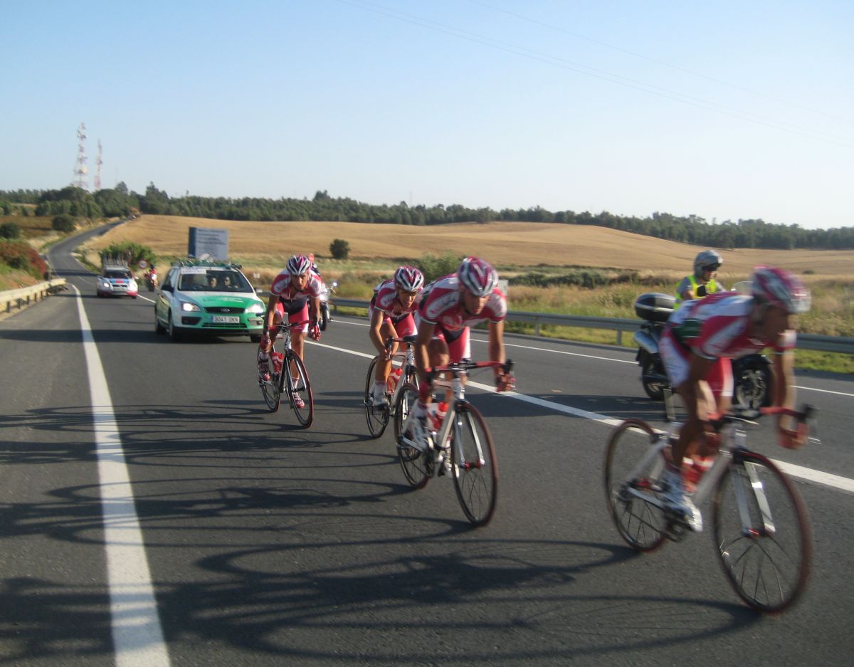 Bajando a Villarasa se pusieron a tirar los portugueses a una ostia que abrieron muchisimo hueco, yo también colaboraba pero me sacaban de punto, iban mas fuertes. Los Cajasur a rueda eran Roman Osuna y Sergio Carrasco. Por delante los otros Cajasur habían abierto mucho hueco rapidamente, me recordaba a la carrera de Sanse.