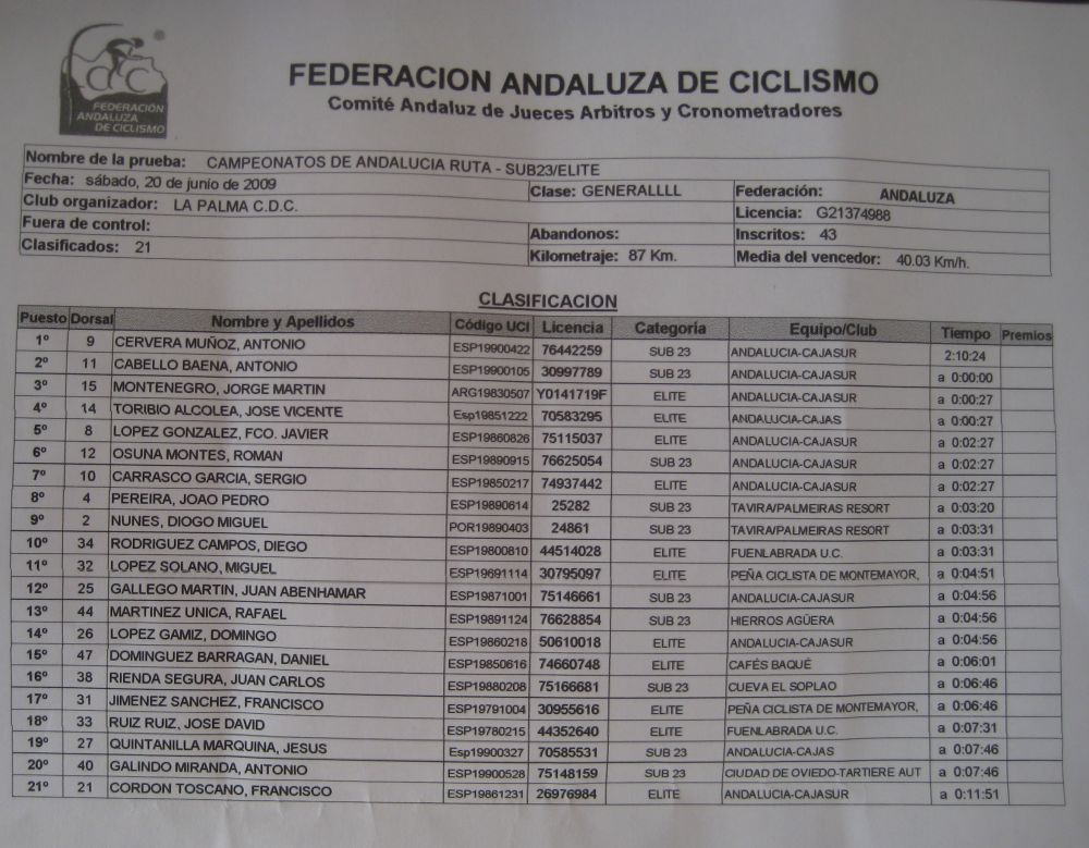 Como en todos los campeonatos andaluces el Cajasur era la mayoría, con 20 corredores, se veia venir como iban a hacer la carrera, ya desde el adoquinado del km 0 saltó uno, y mas que seguían saltando, menos mal que había equipos variados, estaban los portugueses del Tavira, algunos baques. hierros, nosotros, el Trujillo, el equipo del Algarrobo y Marranete..