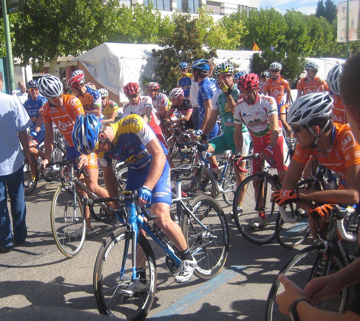 Así es, en la salida estas respirando hondo como en una crono, puesto que desde que Andrei Zymchenko baja el banderín ya hay algun par de Cais dispuestos para dar el saque de honor esprintando como locos, pero tampoco es esa agonía, yo que estaba en la pole tardé en poner las calas y después de la arrancada iba en mitad del pelotón, aunque tampoco era tan importante, esto no son motos, arriba del repecho ya hubo parón y podía haber arrancado de no ser porque lo hizo mi compañero Pizarro primero metiendose en un cortecillo.