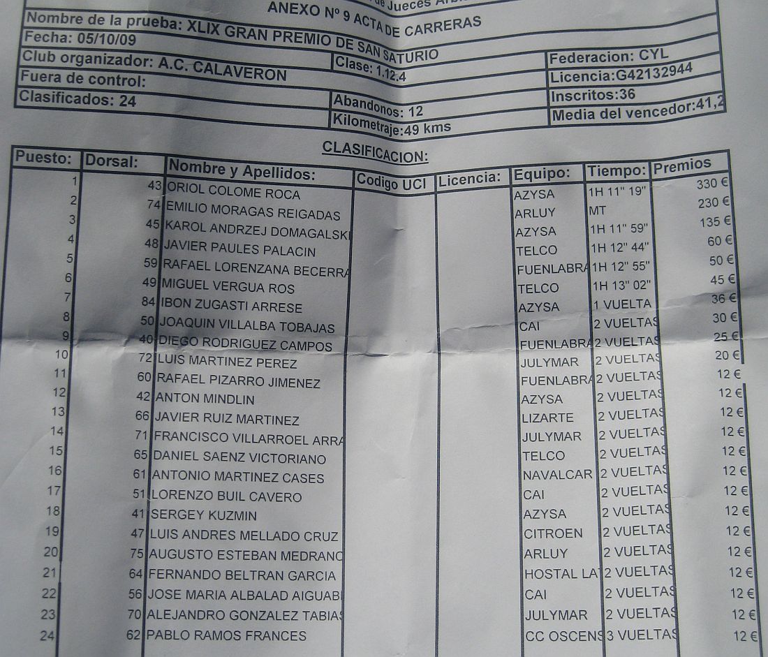 Al final los tres que ibamos acabamos dando la vuelta mas que nos correspondía, Villalba, Luisito y yo, cogí la delantera en la última curva y gané el sprint haciendo octavo en la carrera, pero me pusieron noveno porque la vuelta que contó fue la de antes, nos pegamos una volatta invalida, ganó Oriol Colomé. Finalizé la temporada sin conseguir victoria, algo que no sucedía desde el año 2003, con lo que termino una temporada mala, aunque con bastantes topten, este año las carreras generalmente han estado mas complicadas, todas con muchisimo nivel, se ha hecho lo que se ha podido.