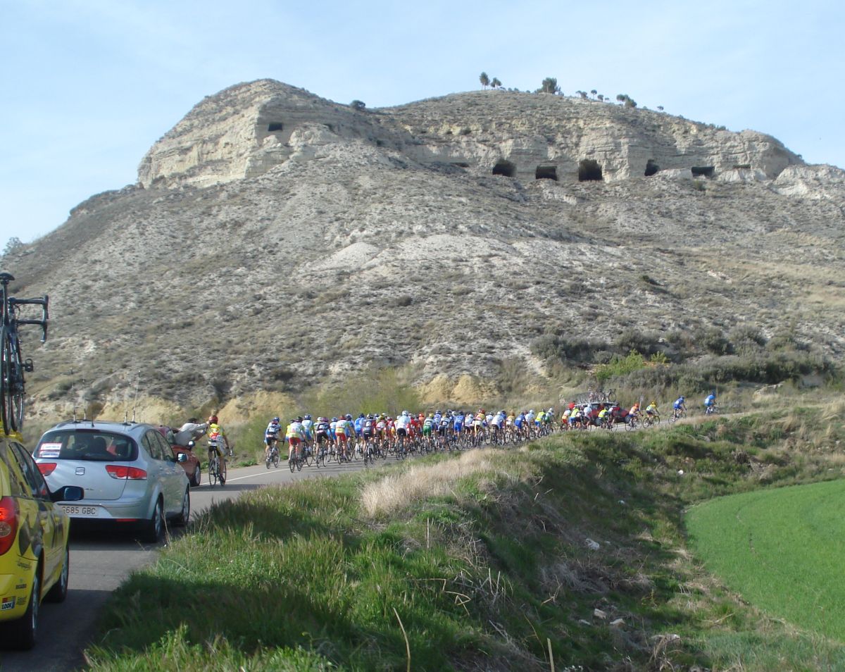 Preciosa imagen del pelotón del Trofeo Santiago al paso por el rocaje vivo de las cuevas.