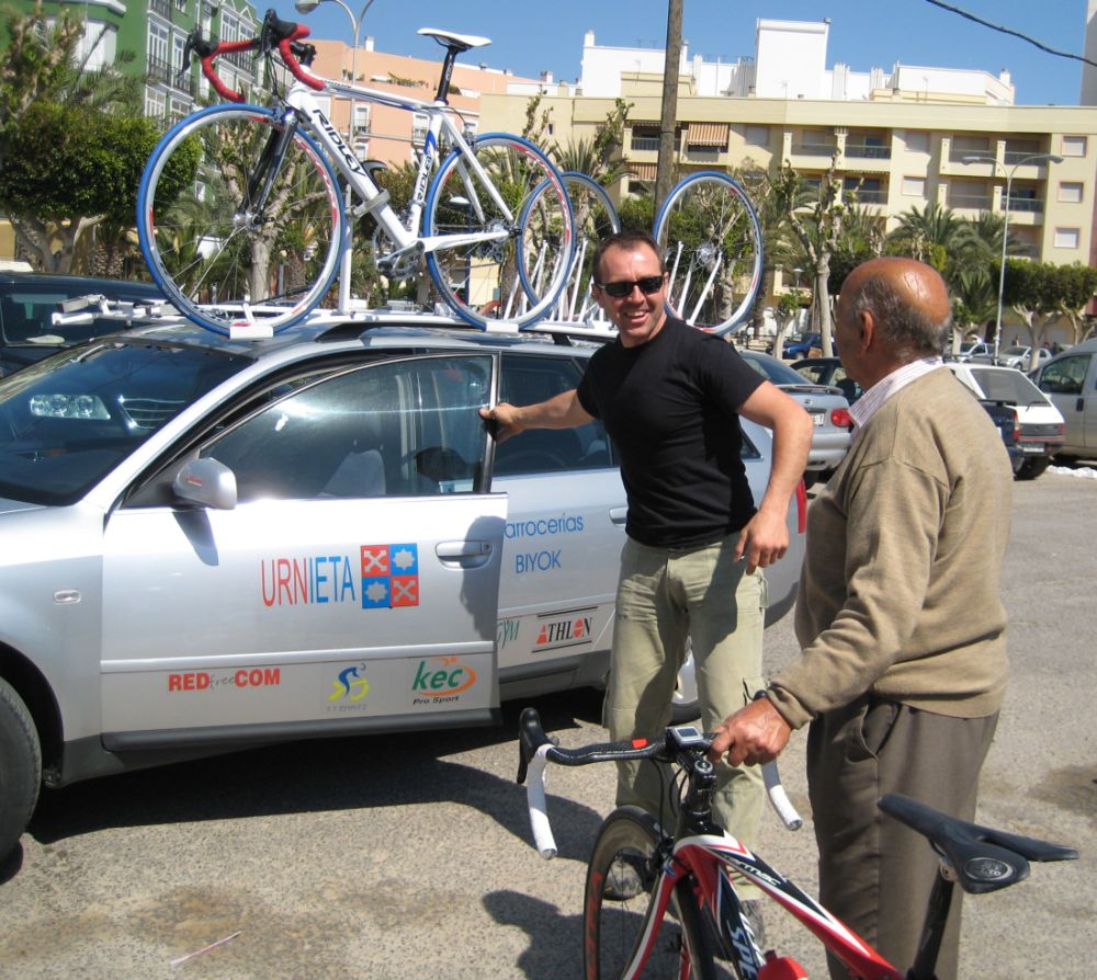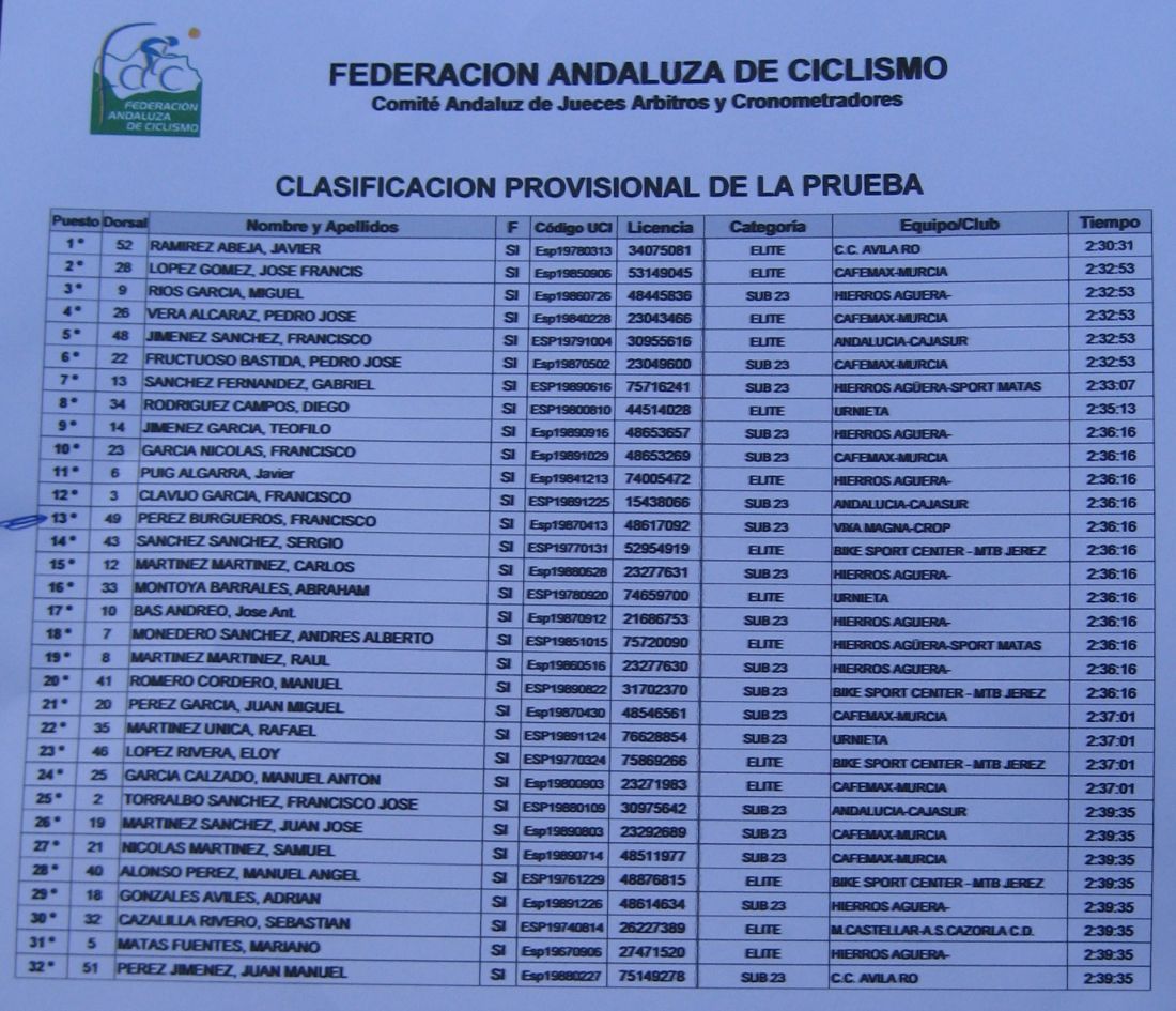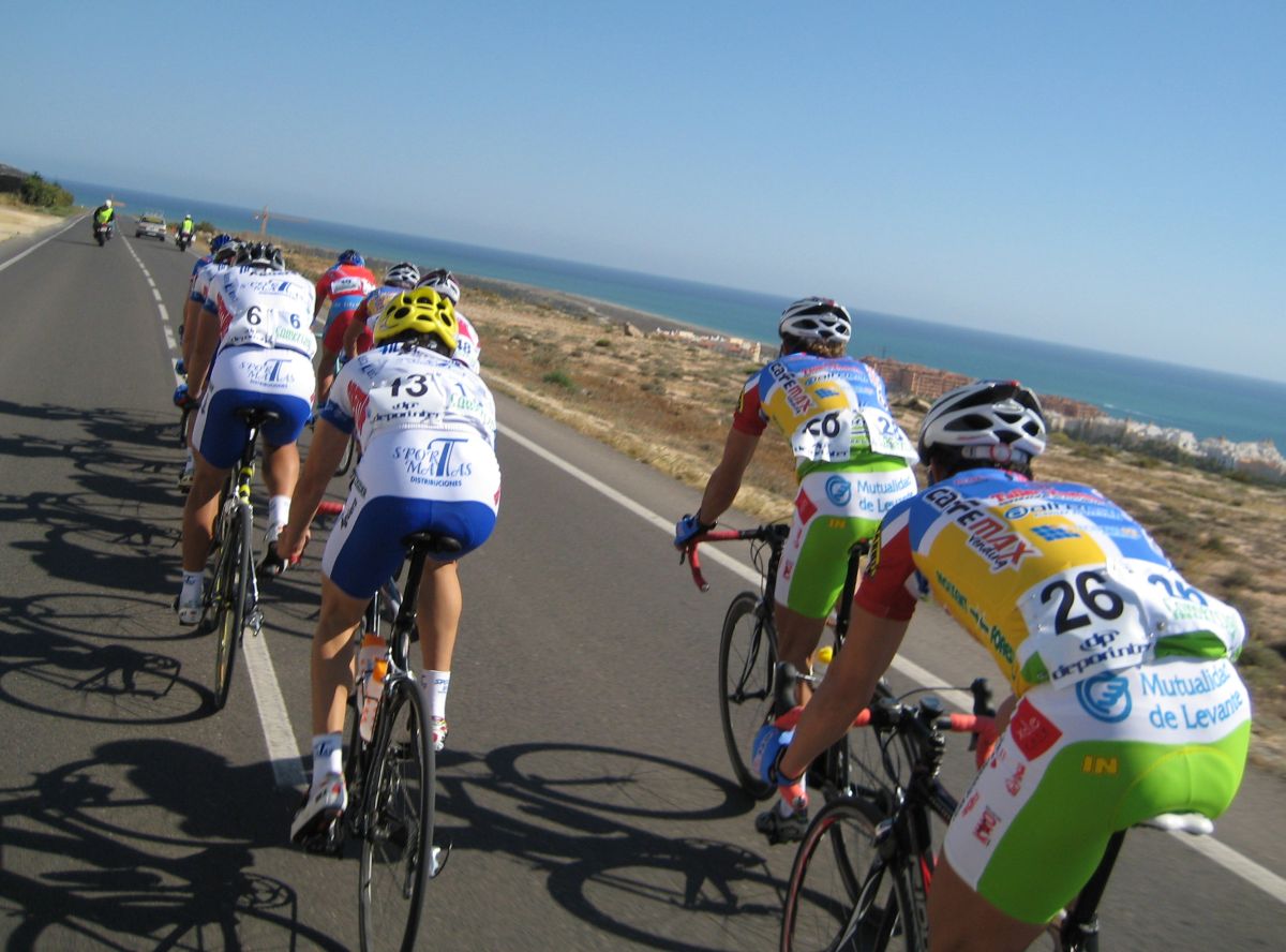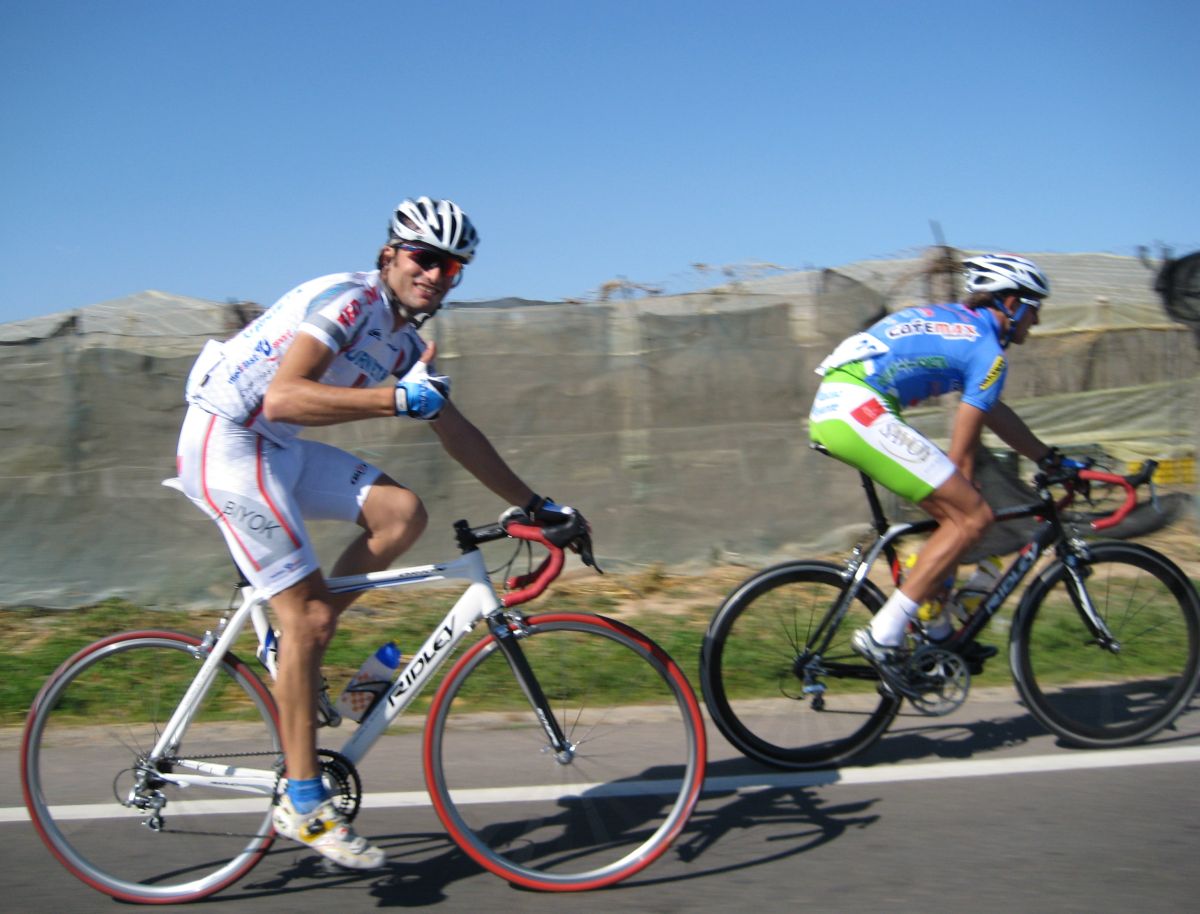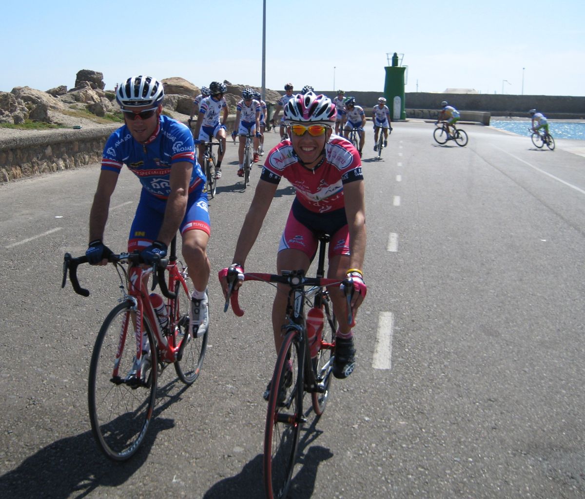 En El Ejido había muchas glorietas y pasos estrechos, allí arrancaron un Murcia y un Hierros y se fueron, ya que eran los equipos mas numerosos, era fácil que lograsen marchar, asi que la responsabilidad recayó sobre el Abeja. Ignacio me siguió diciendo que no pasara, que dejase tirar al Abeja que iba 10 puntos por encima y asi haciendo que tirara era la unica manera de intentar poder ganarle. El Abeja iba cerrando cuneta el solo, al principio hizo daño pero luego ya se iba bien, el Algarrobillo fue el único que se puso a ayudarle, luego ya llegó el Fran del Viña Magna, yo seguía a rueda, a rueda toda la carrera.