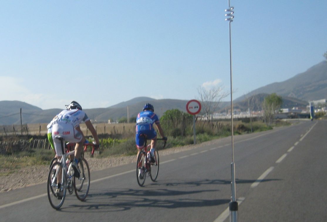 Ya pasaron de mi y se pusieron todos a tirar sin rechistar, yo iba ahi de invitado, a rueda haciendo fotos, viendo el paisaje, silvando, no es que me gustara demasiado esa situación, luego vas dormido y las primeras ostias te duelen.. Las primeras ostias empezaron cuando la carretera giro a la izquierda, por El Ejido, pero estuve atento, nos fuimos unos 4 o 5, aunque por detrás entraron rápido.