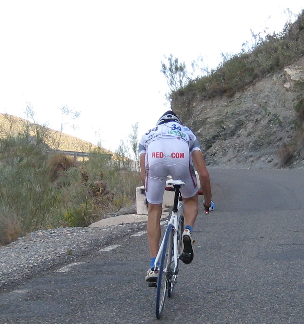 Quedaban 20 kms de repechos y yo que ni podía meter los pedales y cuando me sentaba me dolía toda la espalda de ir bajisimo, pero llevaba fuerza asi que los repechos los subía de pies procurando que no se me escaparan las calas y asi lograba mantener la distancia con el grupo donde iba yo, el Manu que había petado en el primer repecho venía detrás pero yo le iba abriendo hueco, asi que no llevaba yo mala marcha a pesar de ir sin pedales y con el sillón bajo, pero asi imposible volver a entrar con los de delante, ya lo único que podía hacer era intentar mantener el puesto que llevaba, que sería el octavo, una pena, tuvieron suerte los que iban conmigo de que rompiera la cadena, fue el castigo por ir a rueda.
