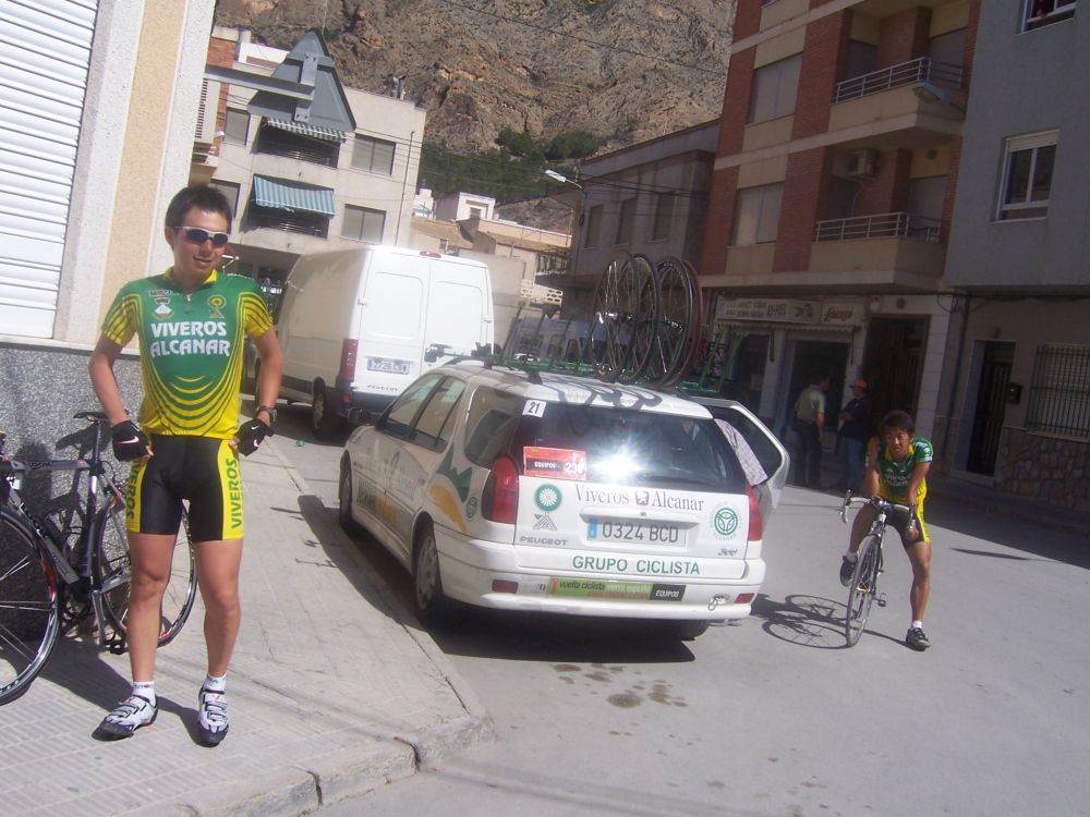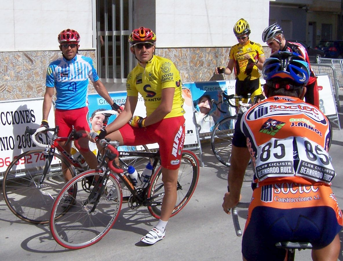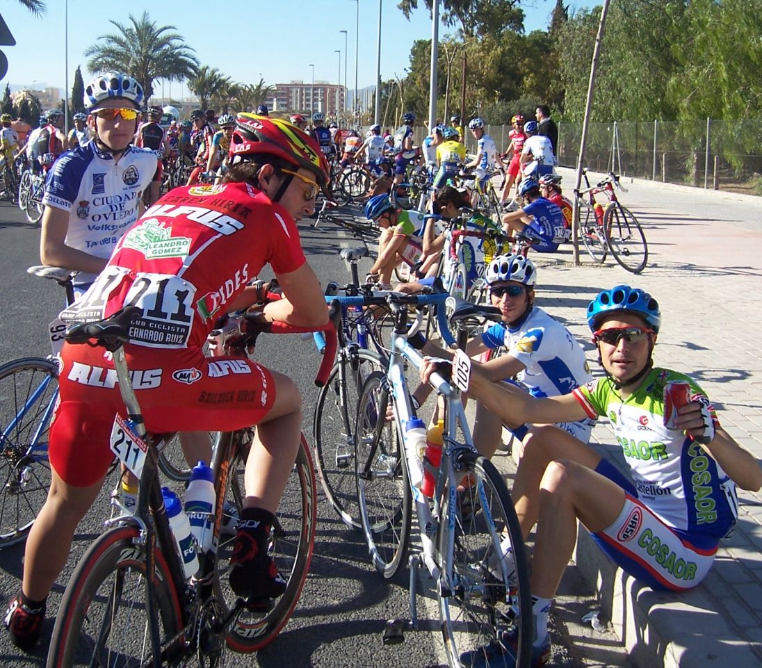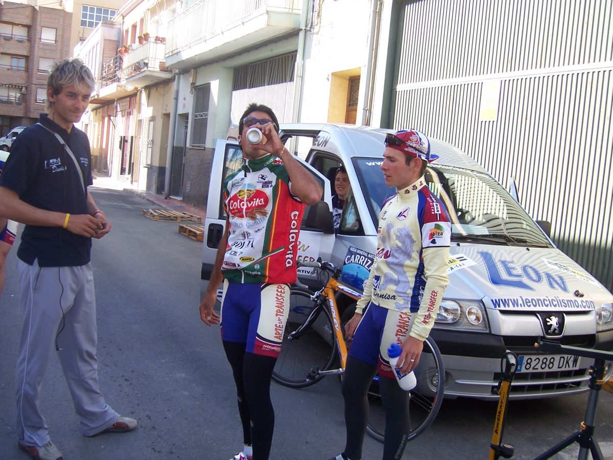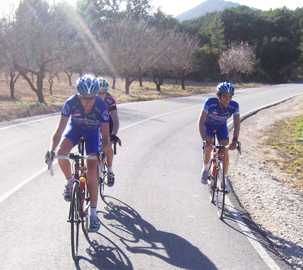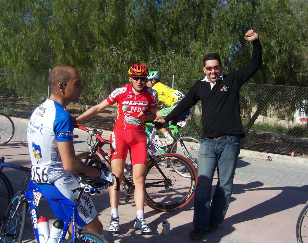 Bajamos Carrasqueta y llegamos a la via de servicio dirección a Ibi, alli arranqué yo muchas veces hasta que me metí en un corte donde vino también el Curro y empezamos a abrir hueco, pasamos Ibi, llegamos a Castalla y alli esprinté para ganar el Sprint Especial, segundo Ballesta y tercero Pedro Gutierrez del CCM. Hicimos una subida y giramos para volver a Ibi, subiendo las revueltas por detrás, en la subida aparecen de repente unos Murcia Turistica con otros pocos mas, que sorpresa, la gente al ver a 4 Murcias Turisticas empezo a decir -Que habeis hecho?? -Como habeis averiguado??-Habeis tirado a todo el peloton?? - Que habeis metido palos en los radios?? Ibamos 20 o asi, los Murcia tiraban a una ostia.. coronando revueltas arranco el Curro, otro detras y yo tercero, bajando revueltas ataco el Curro para asegurarse la intervuelta de Ibi, un Murcia segundo y yo tercero.
